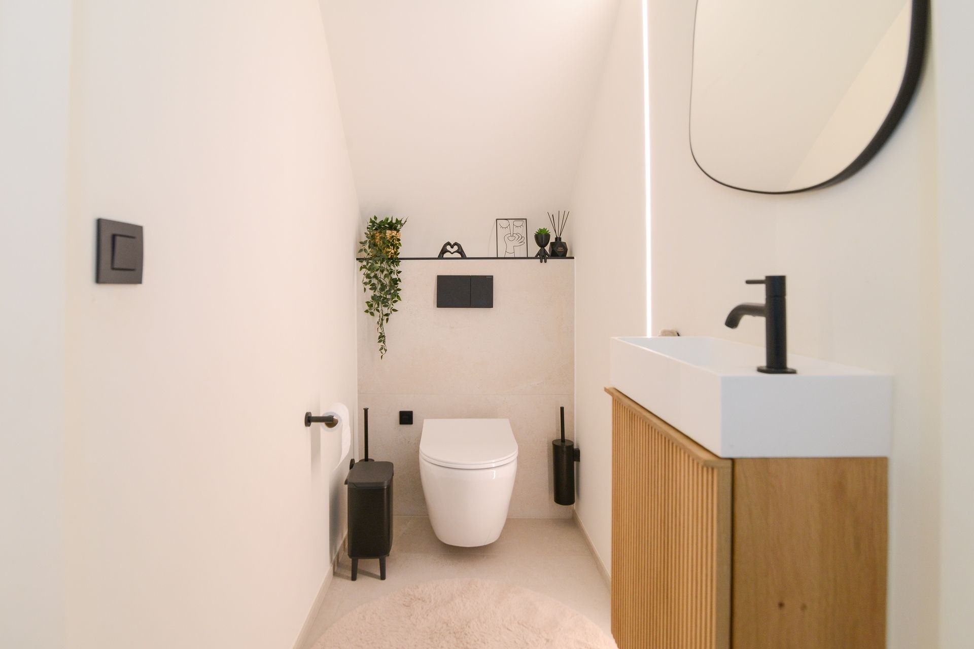 Verder vinden we op het gelijkvloers nog een technische ruimte en een apart gastentoilet. De trappenhal is stijlvol afgewerkt met geïntegreerde LED-verlichting.