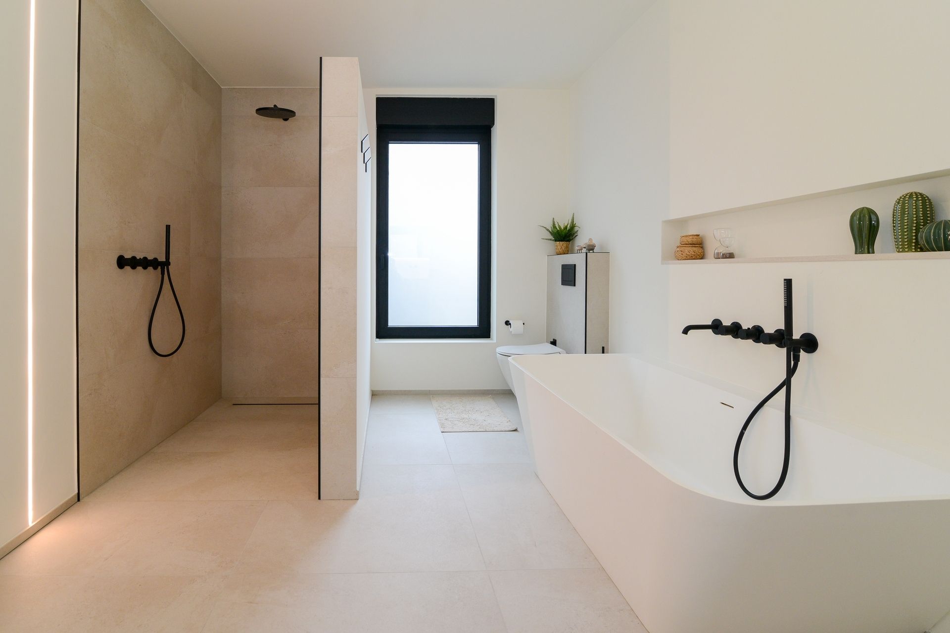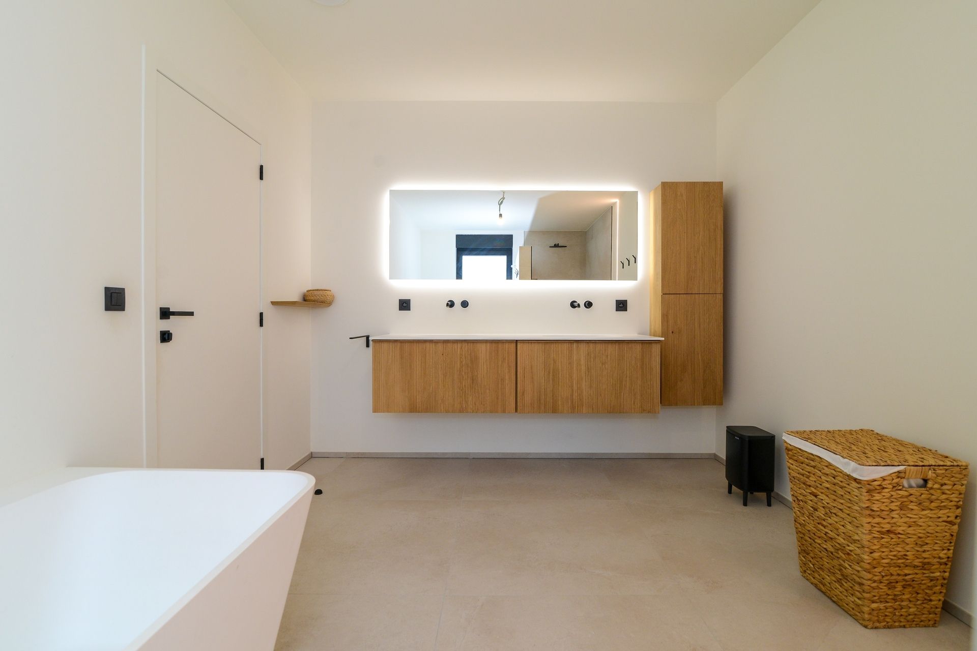 Op verdieping bevinden zich drie ruime slaapkamers, waarvan twee voorzien zijn van inbouwkasten. De ruime badkamer is uitgerust met een dubbele wastafel, een verwarmde spiegel, een grote inloopdouche, een ligbad en een toilet. Op de bovenste verdieping bevindt zich bovendien een praktische wasruimte met aansluitingen voor wasmachine en droogkast.