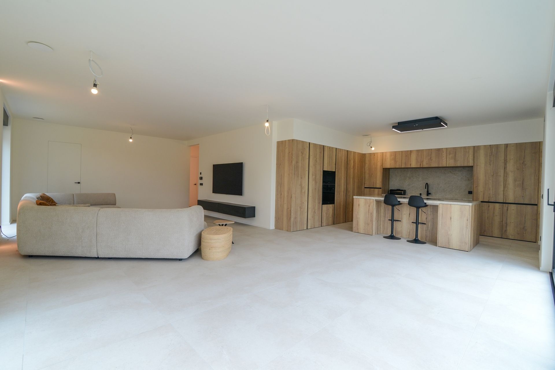 We betreden de woning via de ruime inkomhal die toegang geeft tot de lichtrijke leefruimte. De woonkamer sluit naadloos aan op de eetkamer en de volledig uitgeruste keuken, wat zorgt voor een open en aangenaam woongevoel met veel licht.