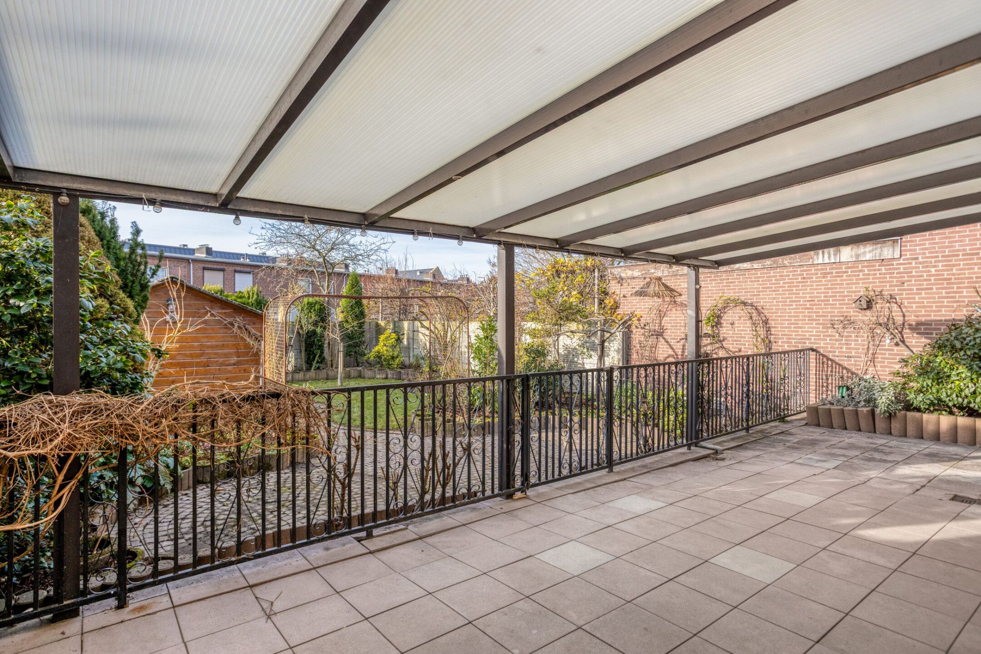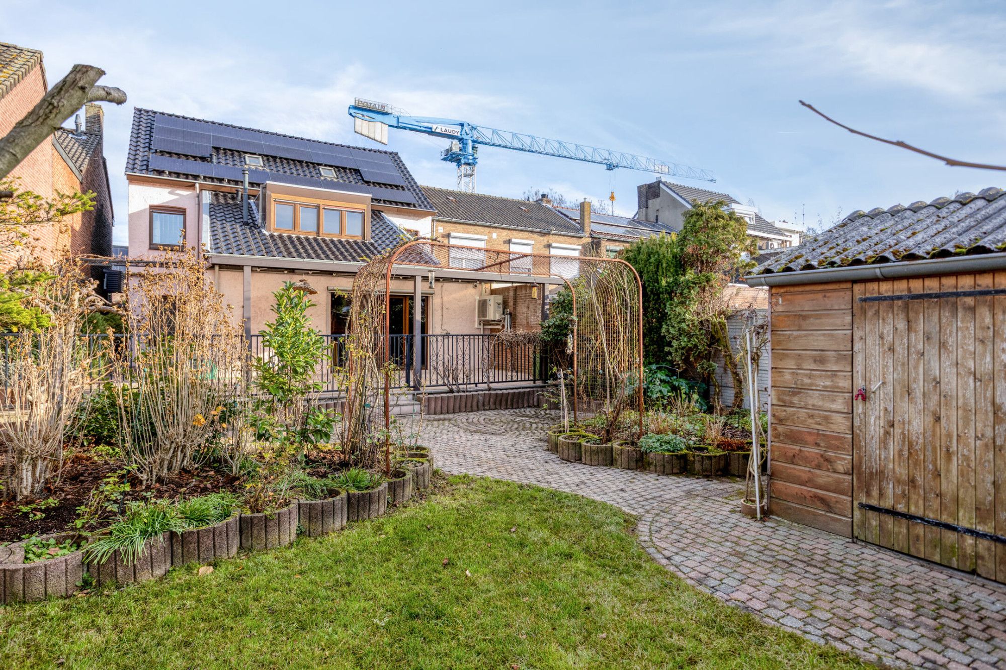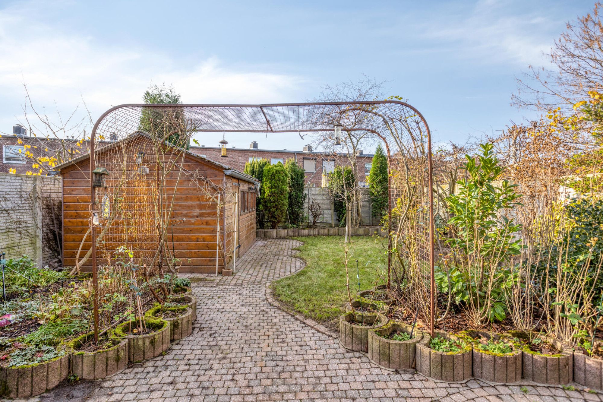 Via achterom bereikbare achtertuin van ca. 19 meter diep met een praktische houten berging van ca. 14 m².