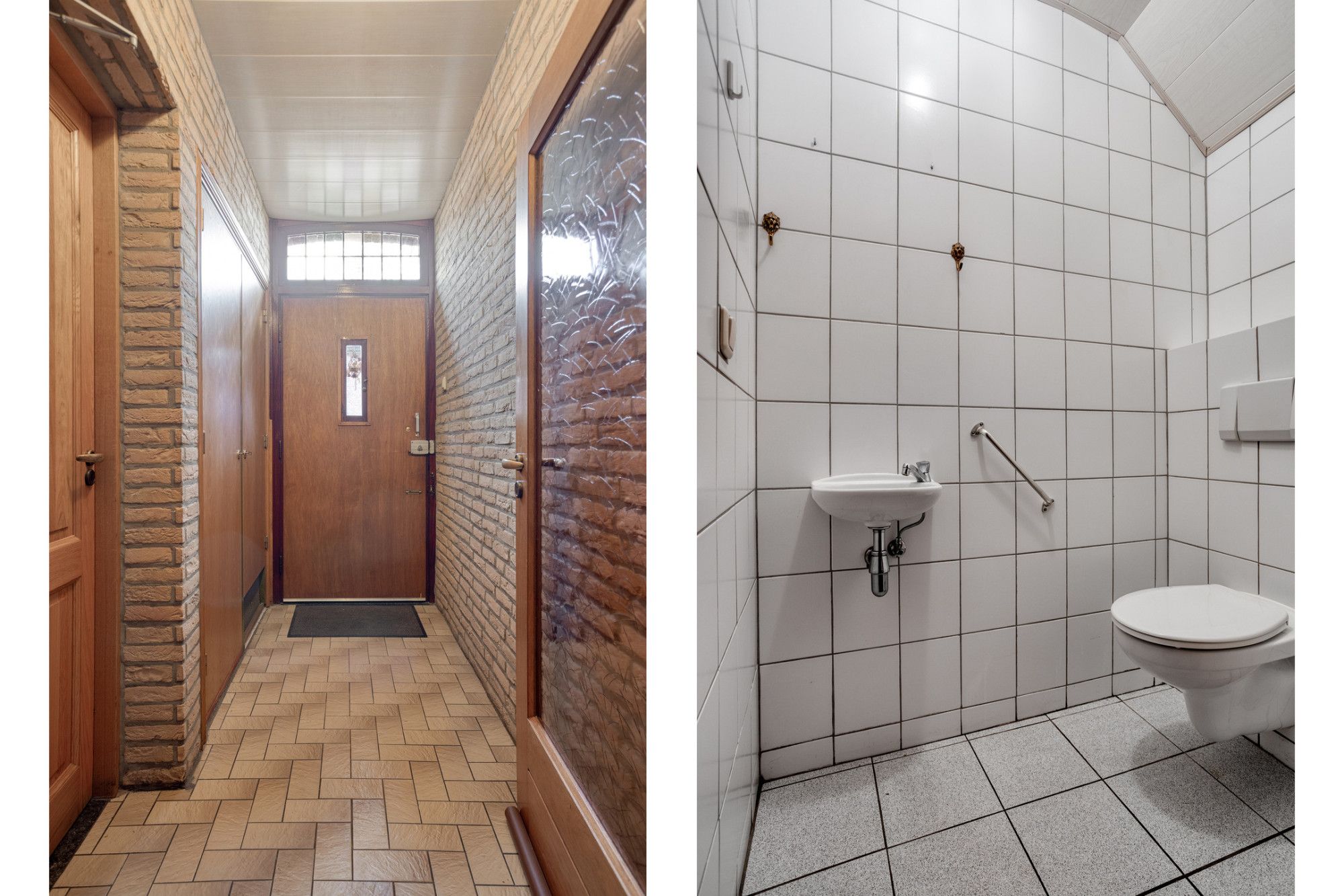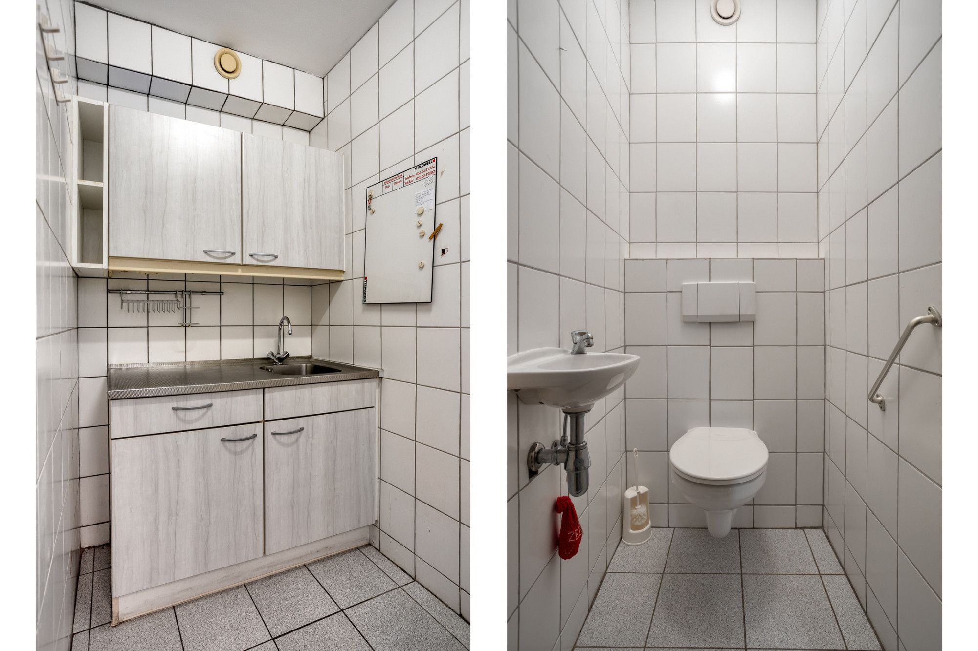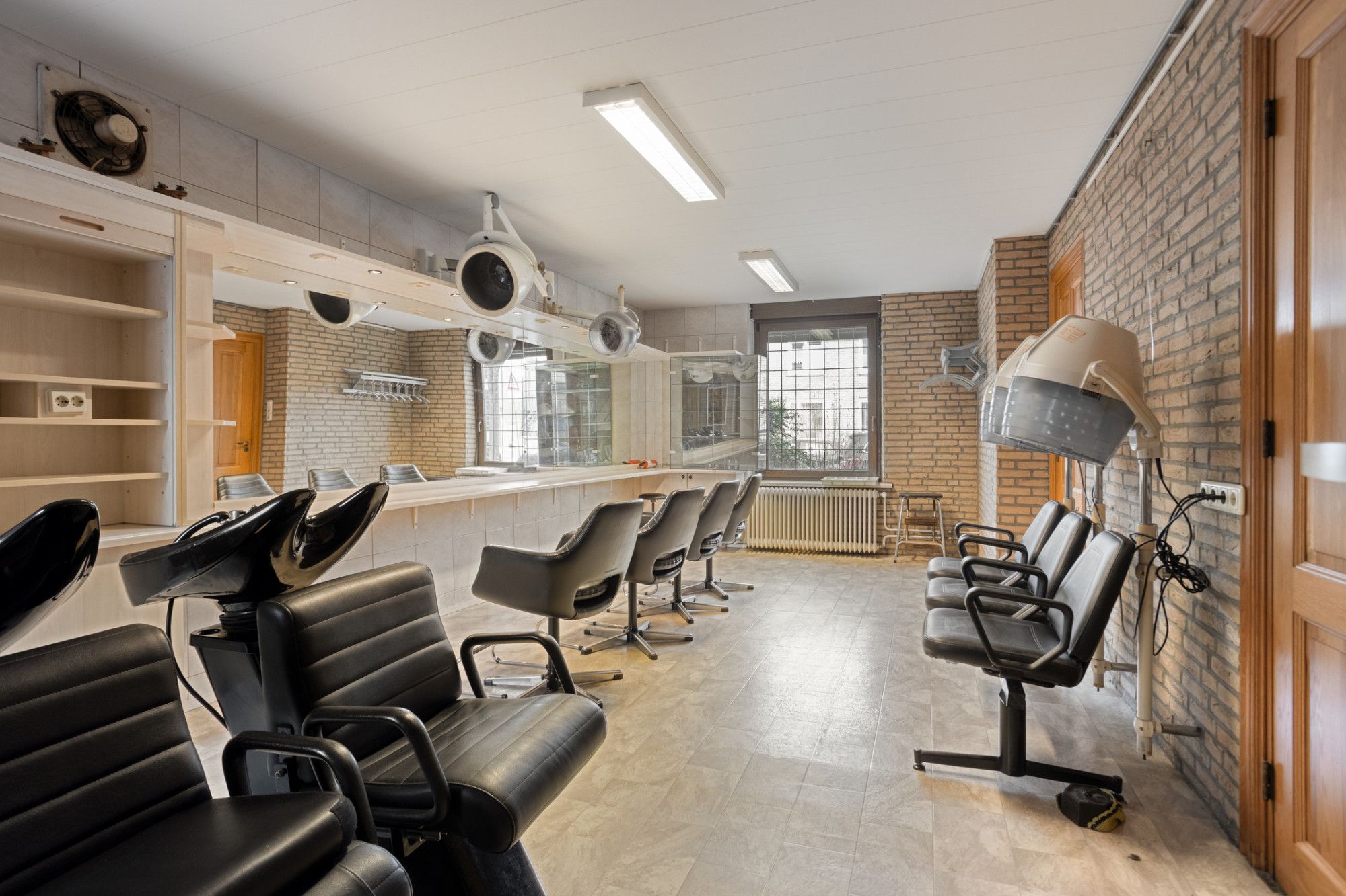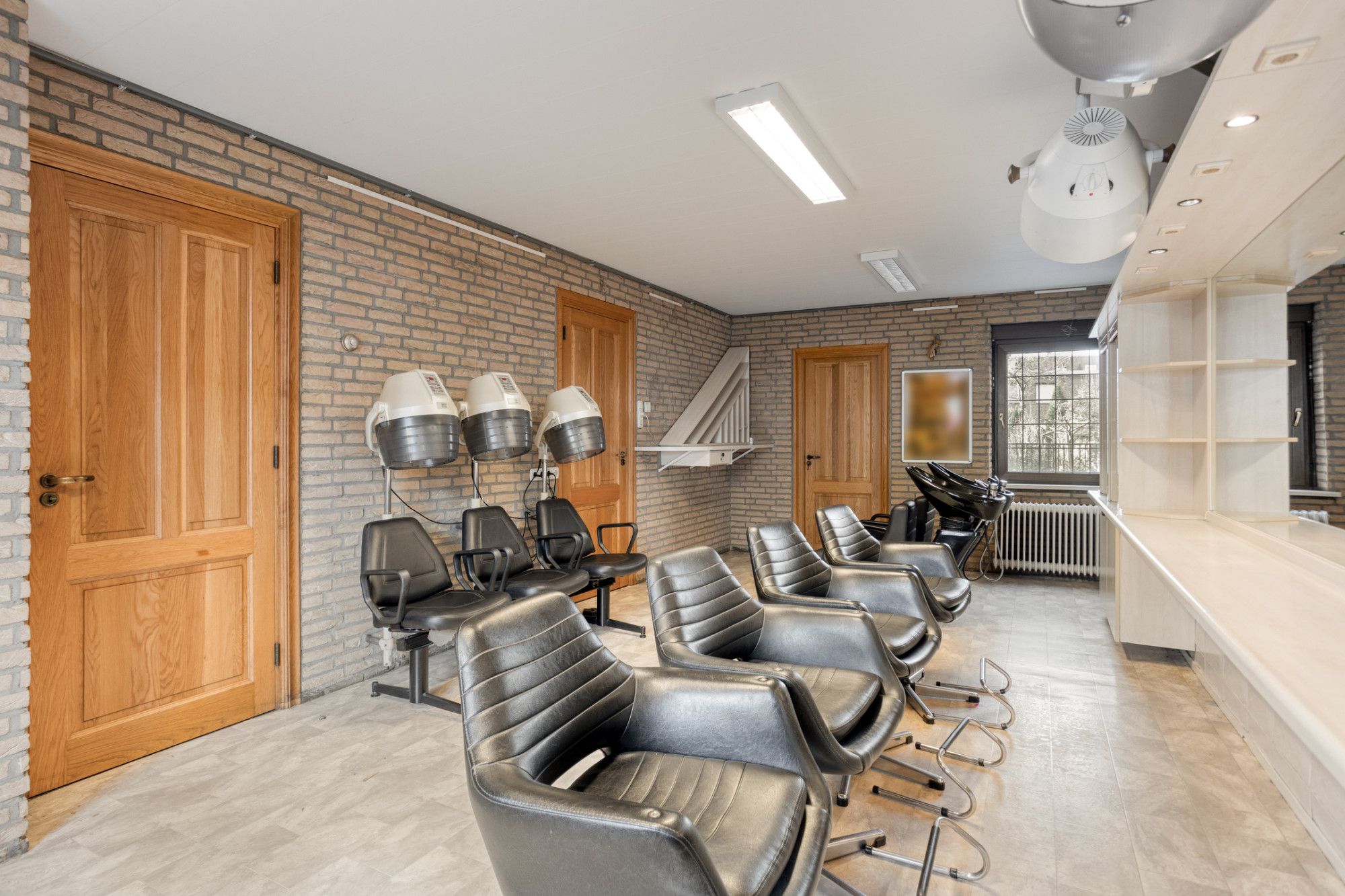 Aan de rechterzijde van de ontvangsthal ligt de voormalige kapsalon van ca. 28 m² met aangrenzend de pantry met een eenvoudige keukenblok en een betegelde toiletruimte met zwevend closet.