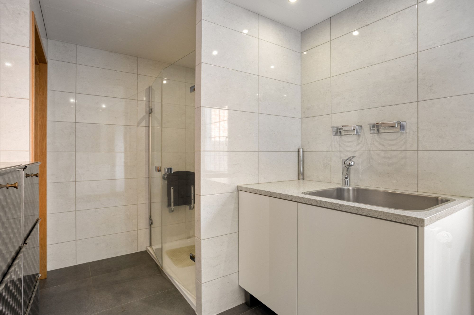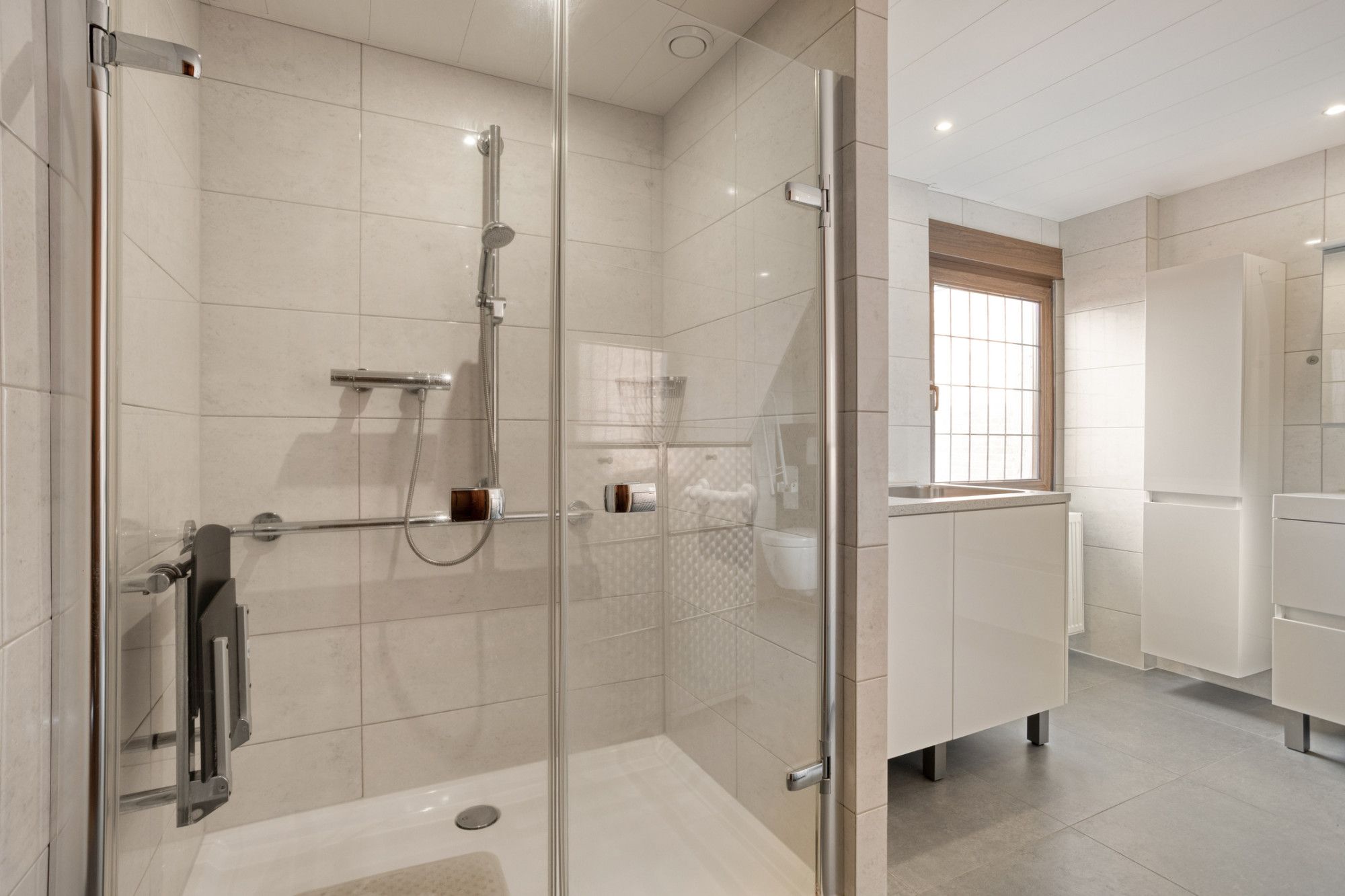 - Moderne badkamer met douche, 2 wastafels en zwevend closet.