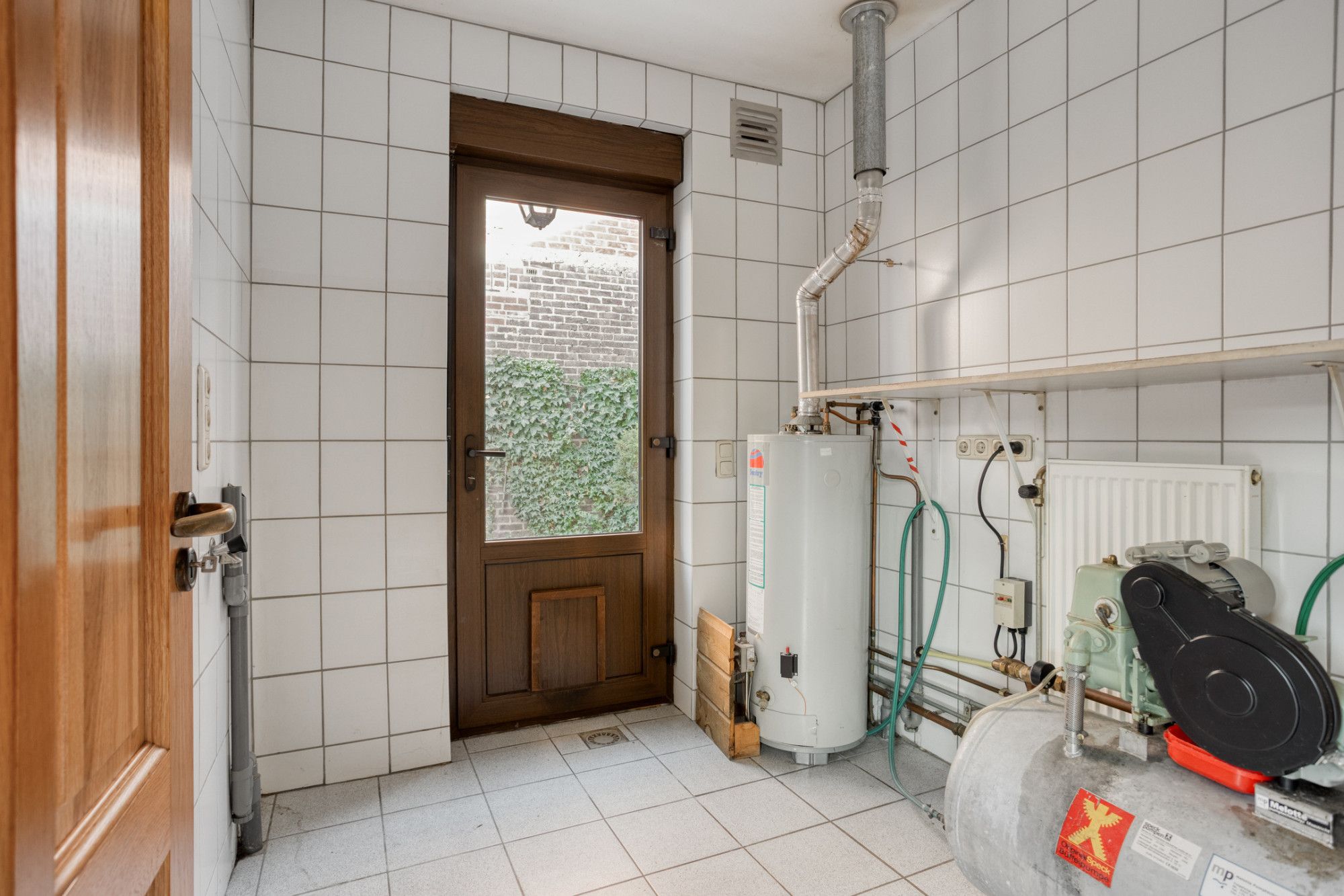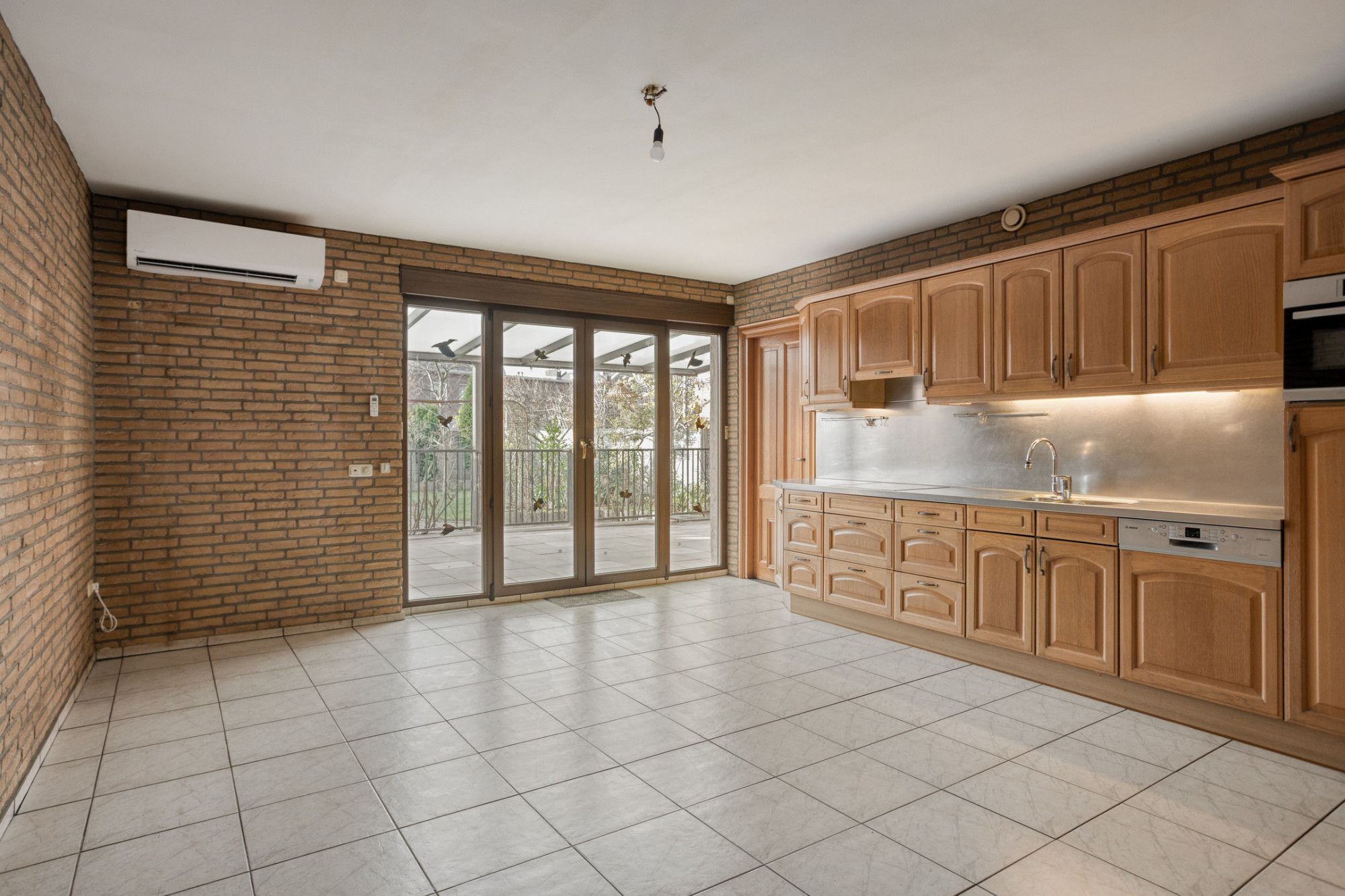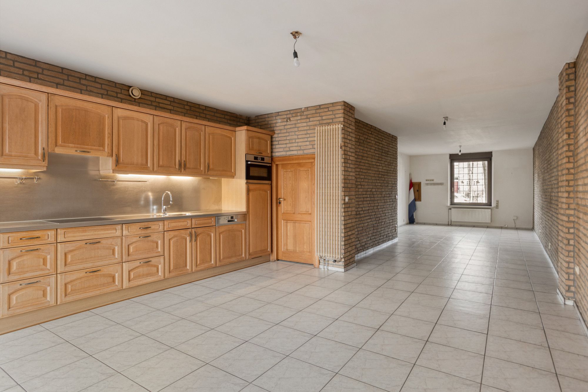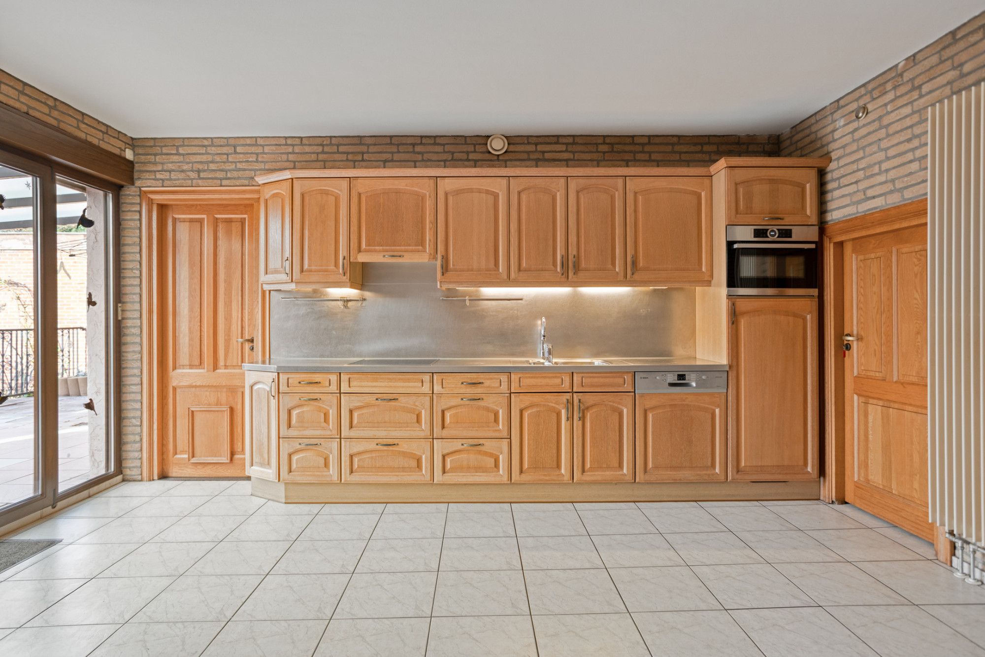 Aan de linkerzijde van de ontvangsthal toegang tot de woonkamer met open keuken, totaal ruim 50 m², geheel voorzien van een witte tegelvloer en openslaande deuren naar het overdekte terras en aangrenzende tuin. Er is sprake van een gedateerde, rechte keukenopstelling met inbouwapparatuur. Naast de keuken ligt de bijkeuken van ca. 5 m² met de gasboiler.