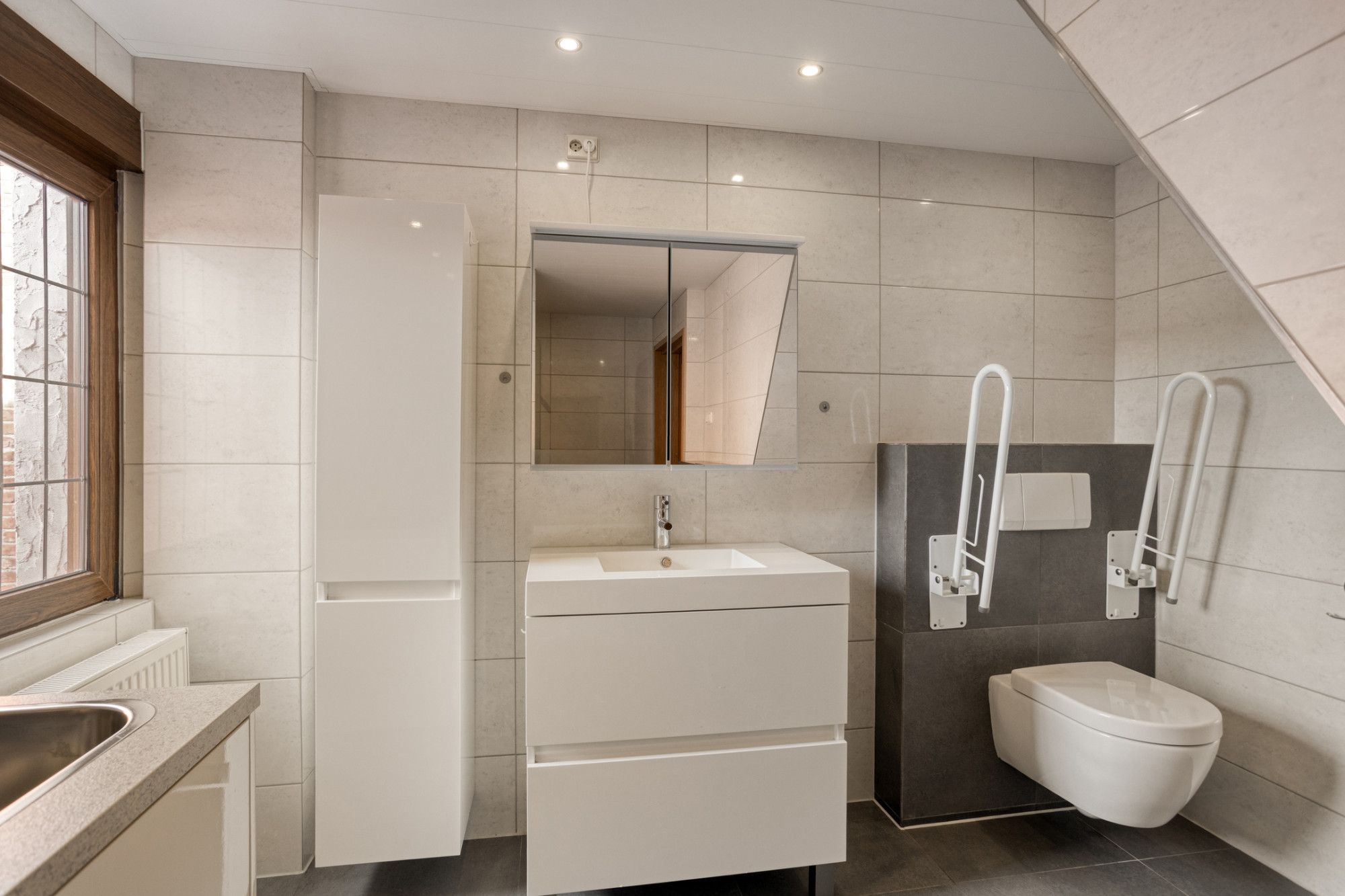 Betegelde toiletruimte met zwevend closet en fonteintje.