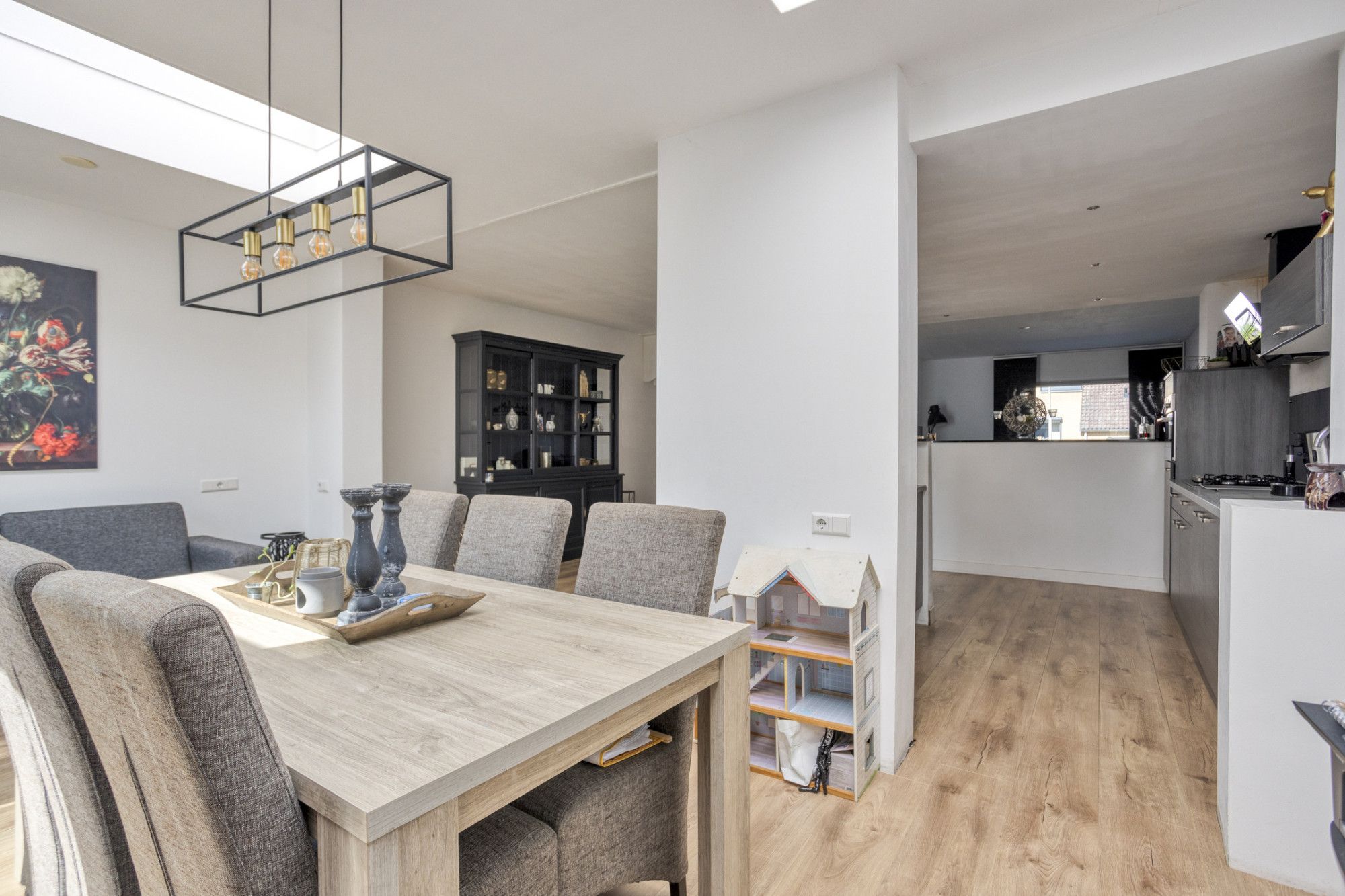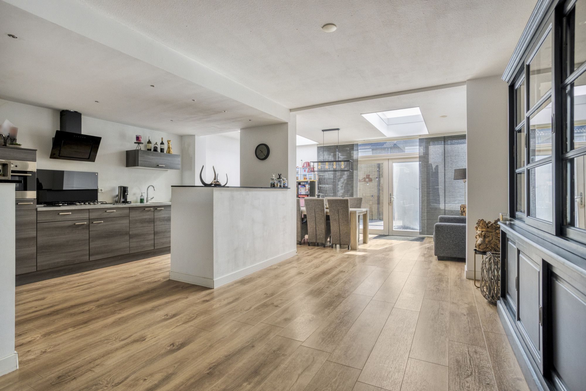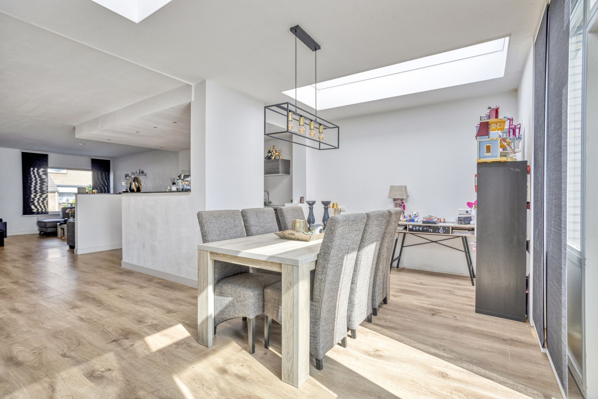 Eetkamer in de uitbouw aan de achterzijde met 2 grote lichtkoepels en dubbele openslaande deuren naar de tuin.