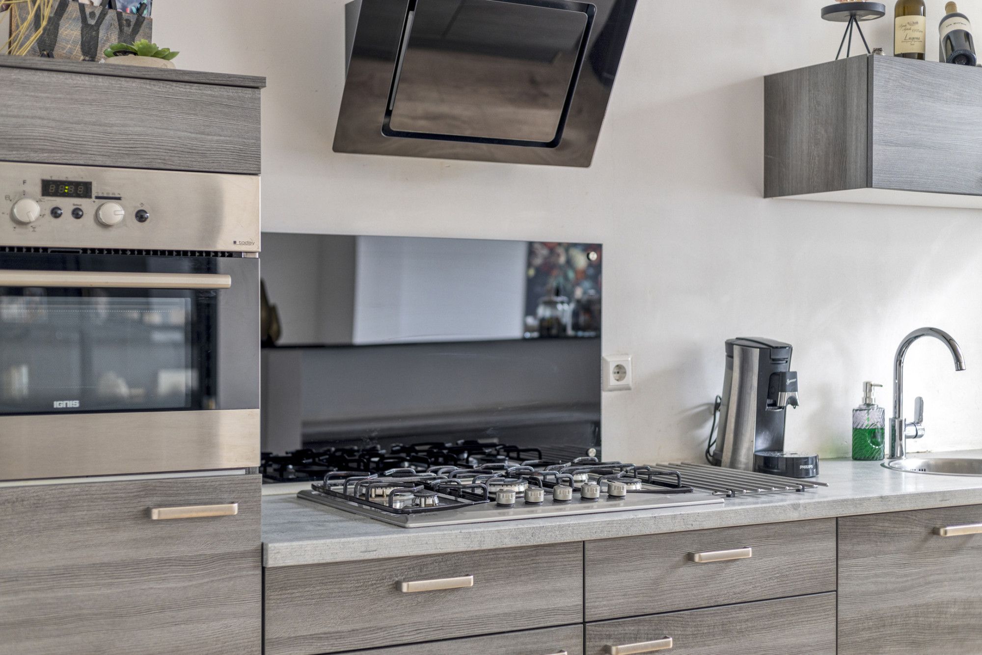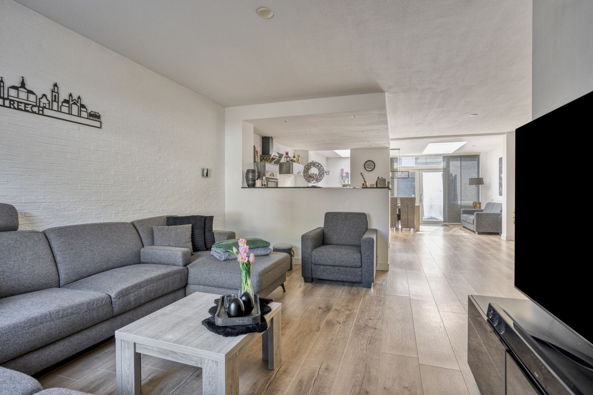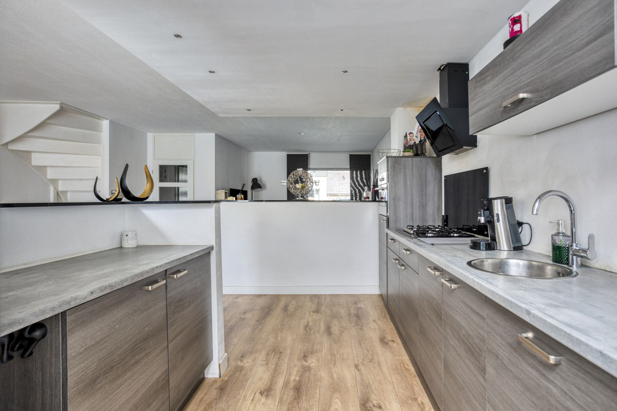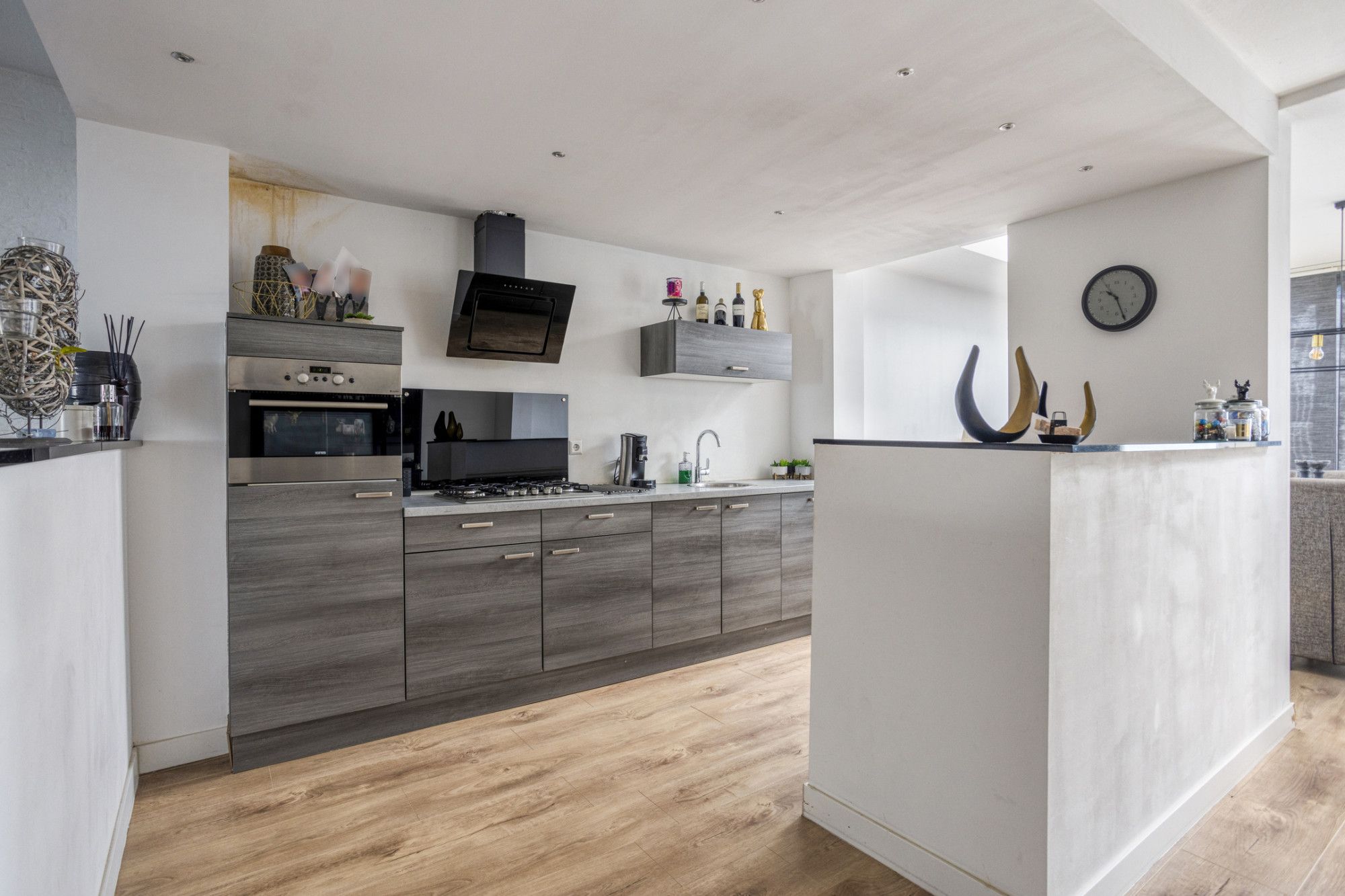 Woonkamer. Open keuken met dubbel opstelling (2016) voorzien van diverse ingebouwde apparatuur.