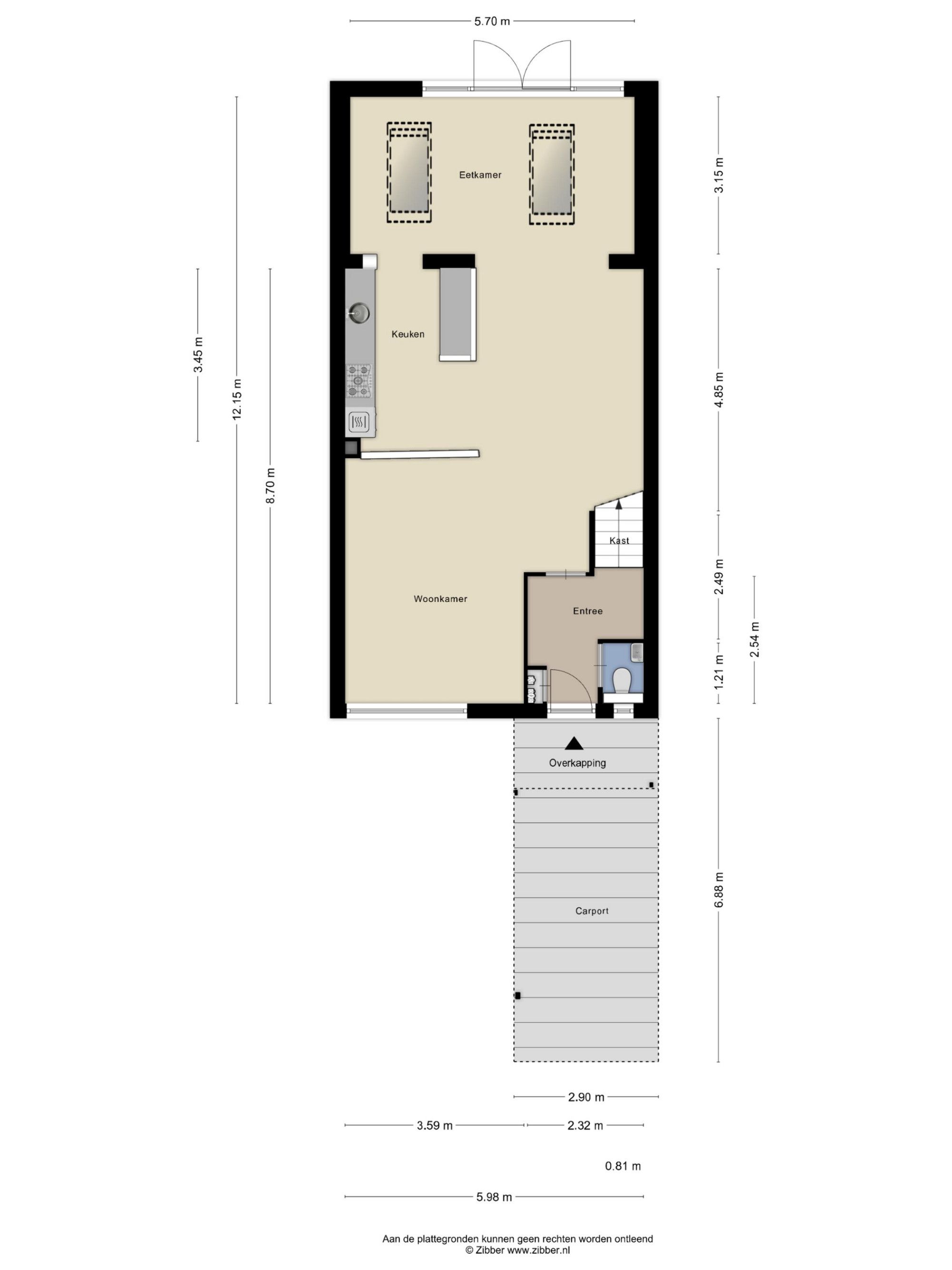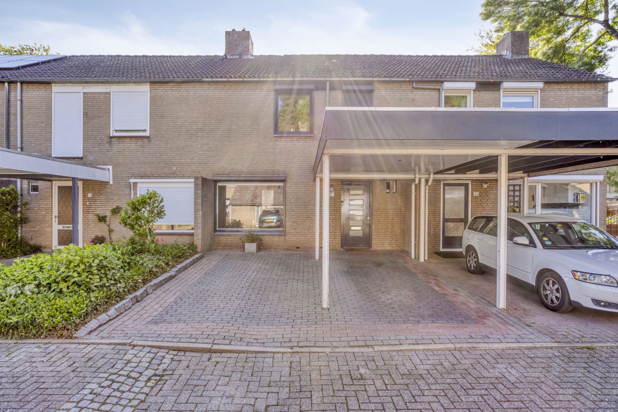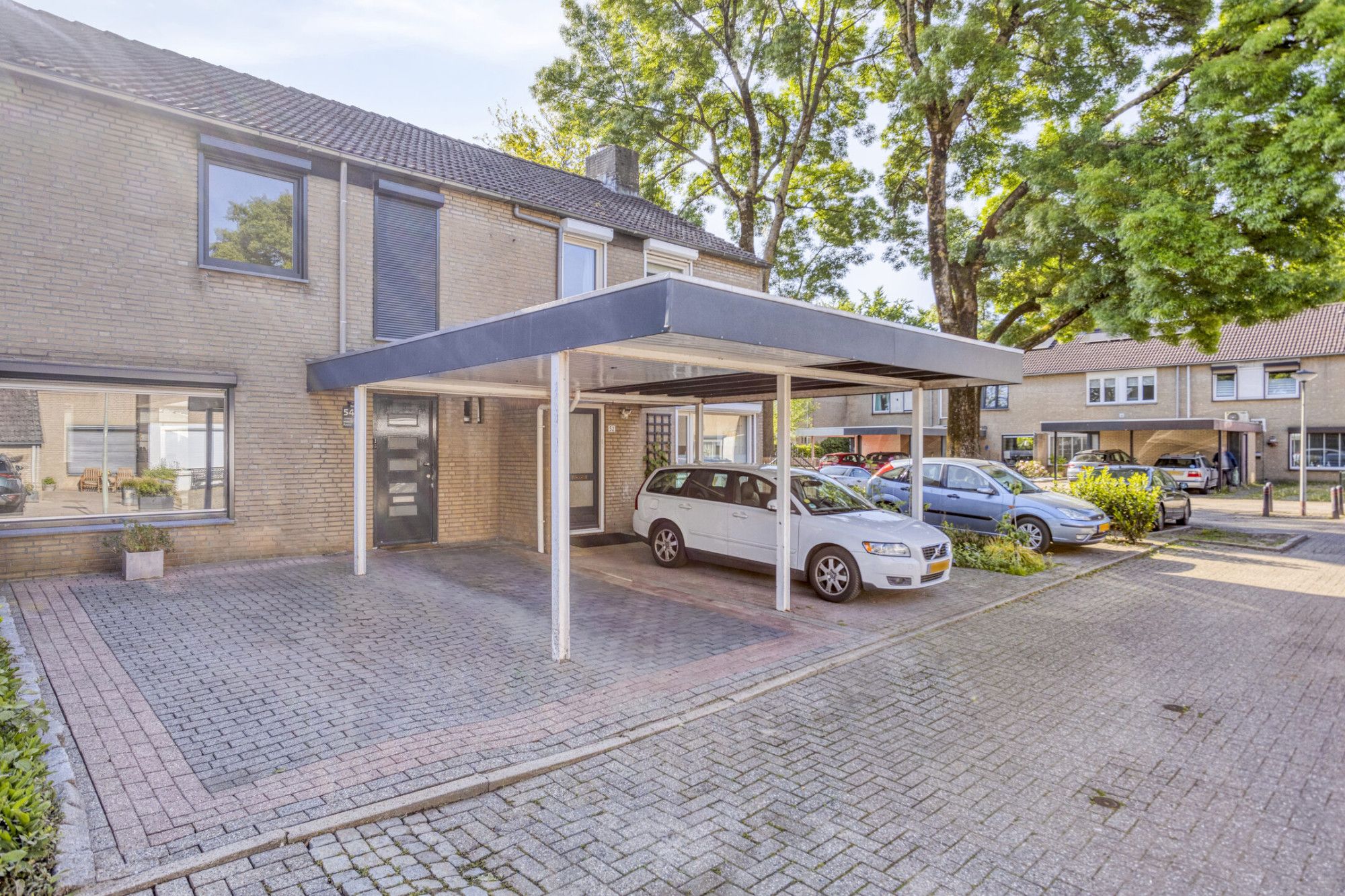 Voortuin met carport en tweede parkeerplaats op eigen terrein.