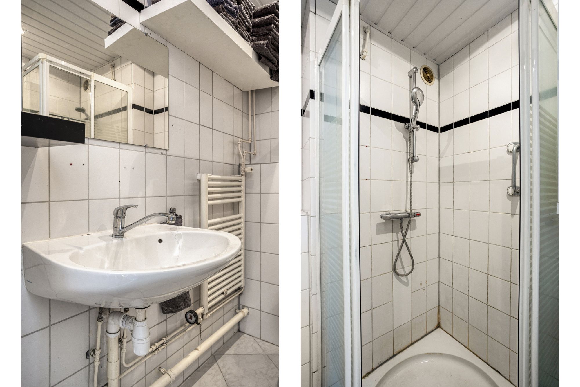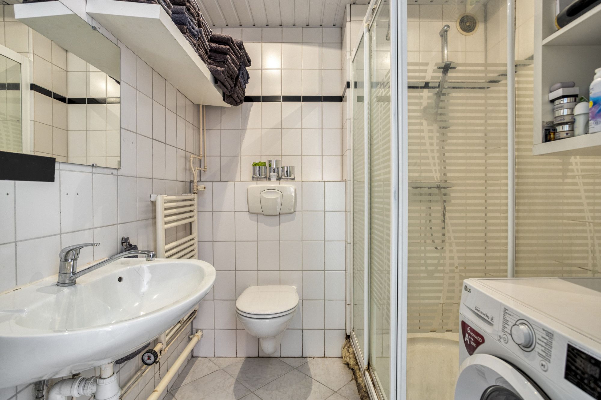 Tussen gelegen badkamer voorzien van douchecabine, wastafel en aansluiting/afvoer voor de wasmachine.
