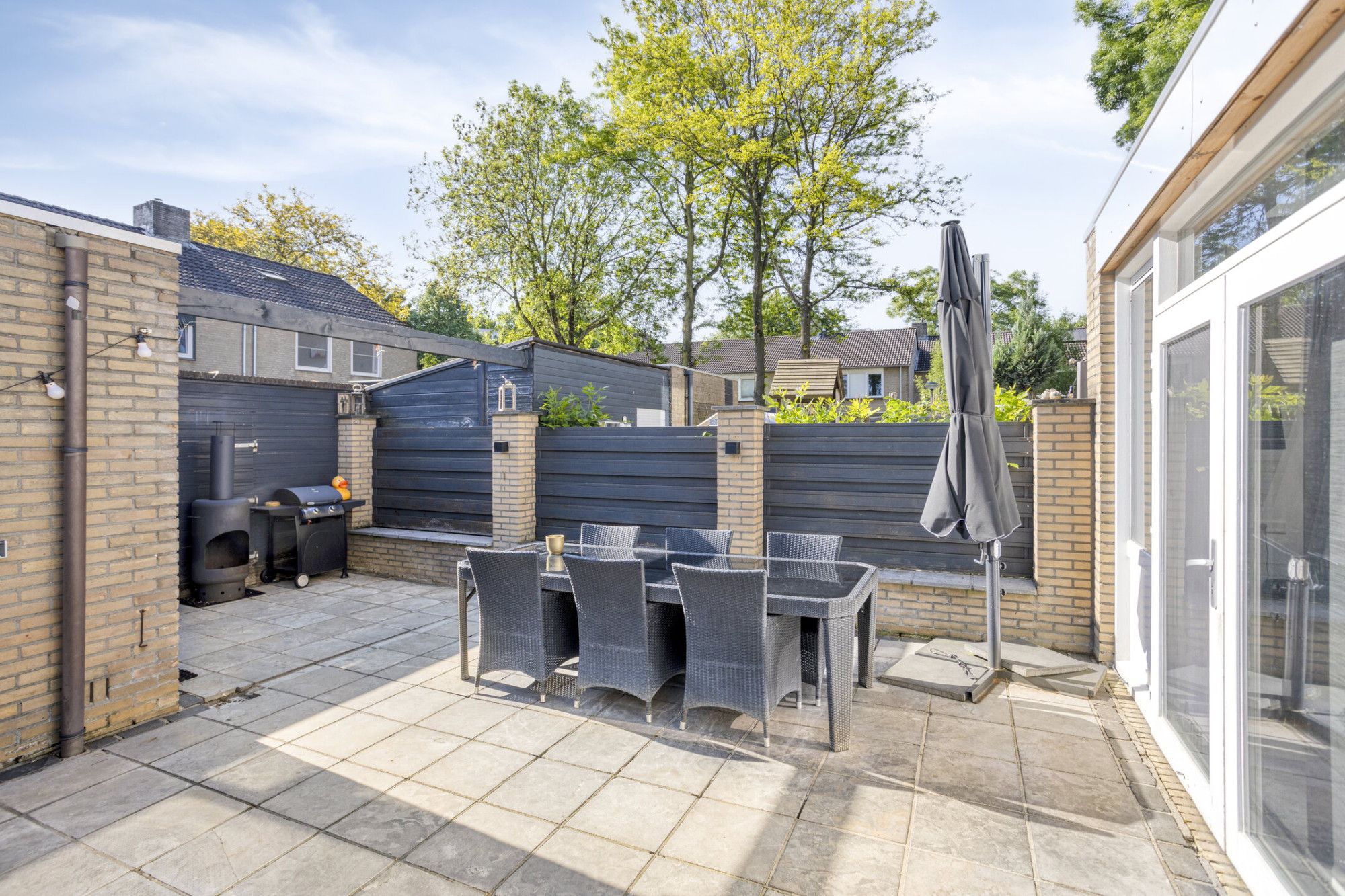 Achtertuin op het oosten, met vrijstaande stenen berging en achterom.