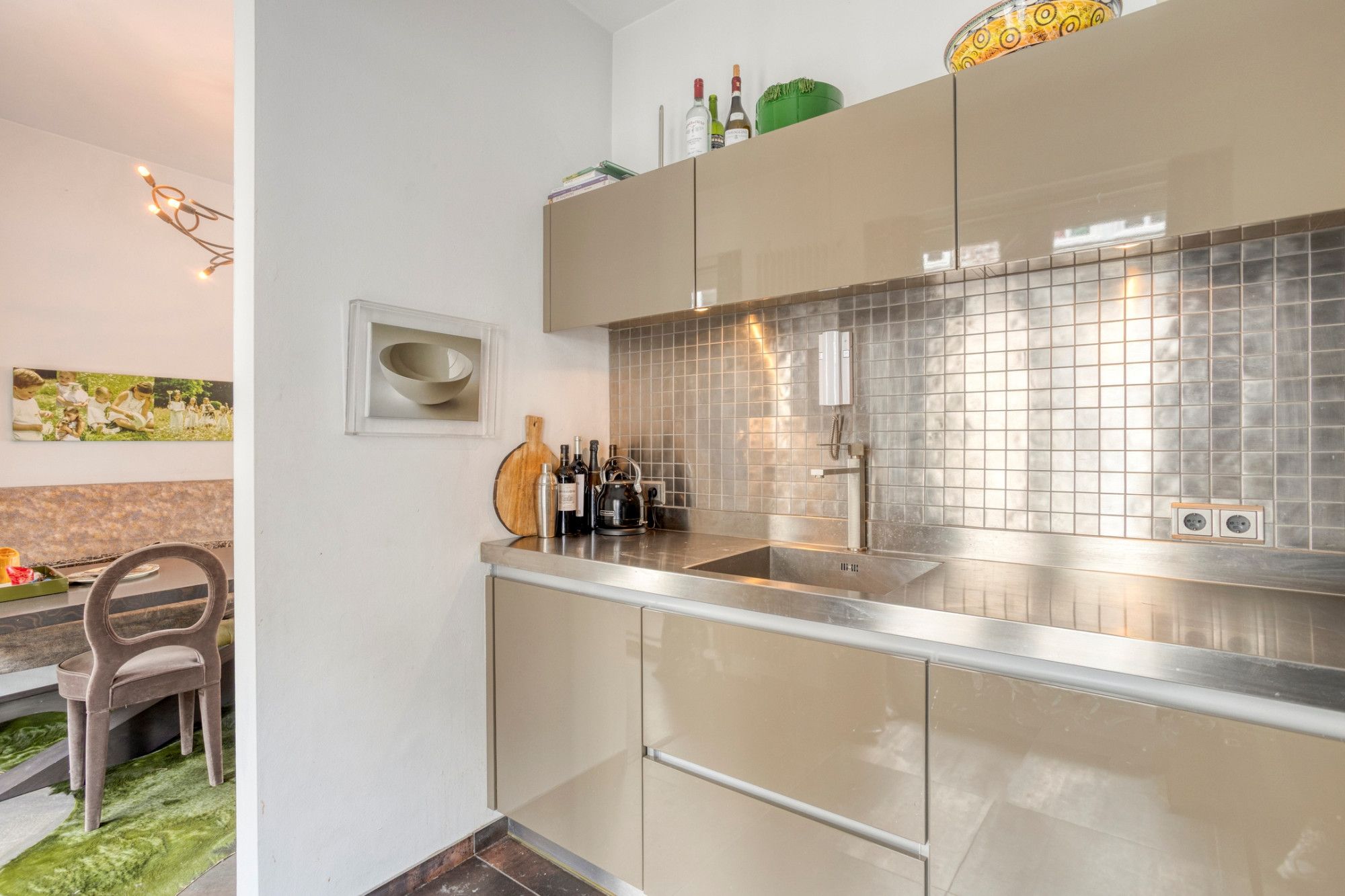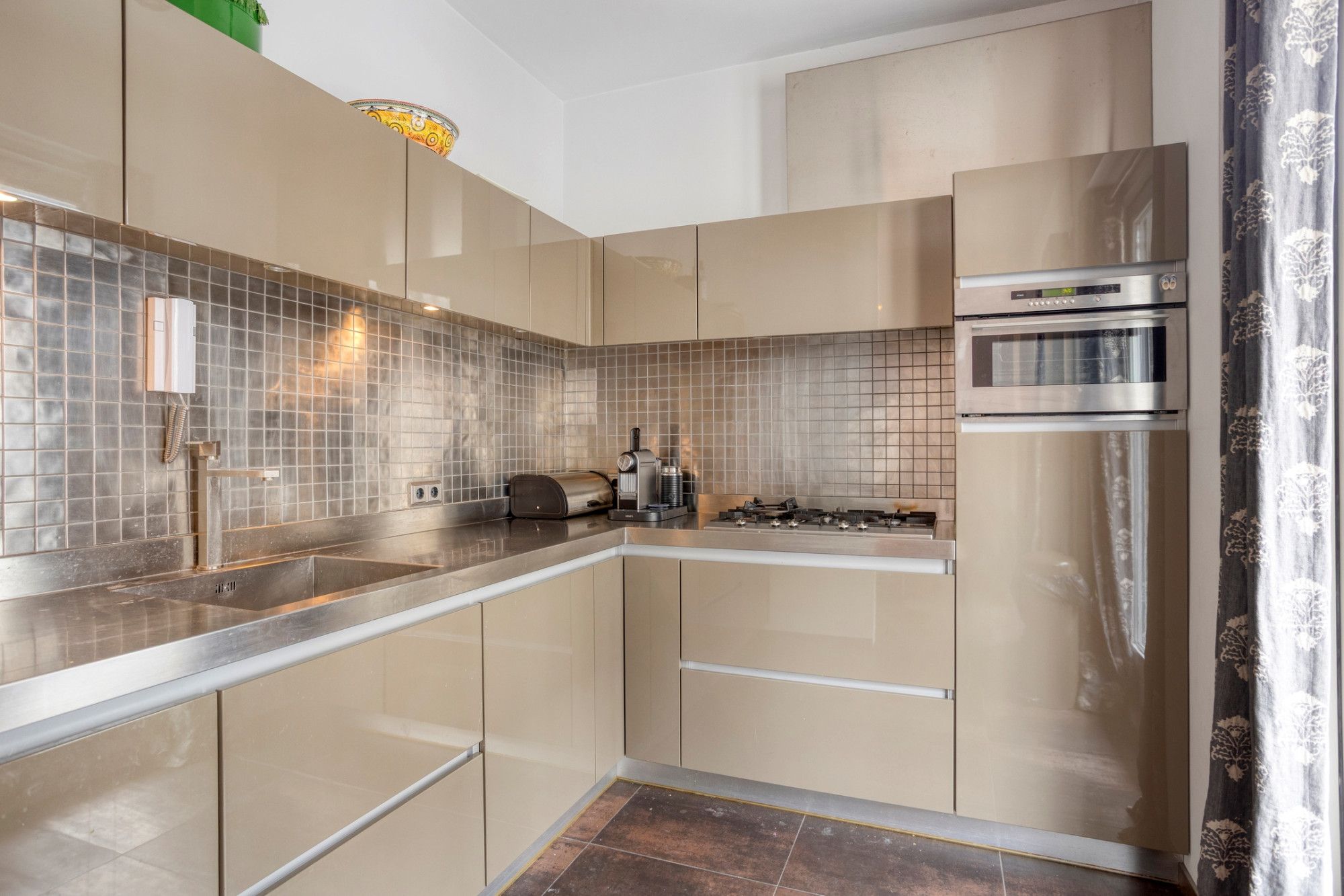Vanuit de hal leidt de trap naar de eerste verdieping, waar zich het woonhuis bevindt. Hier treft u de woonkamer met een prachtig uitzicht over de Maas aan. De ruimte kenmerkt zich door hoge plafonds met inbouwspots en een stijlvolle visgraatvloer. De eethoek loopt over in de halfopen keuken, die is uitgerust met een vaatwasser, spoelbak, koelkast met vriesvak, combimagnetron en een 5-pits gasfornuis met afzuigkap. Vanuit zowel de keuken als de eethoek is er toegang tot het eerste balkon, gelegen op het oosten.