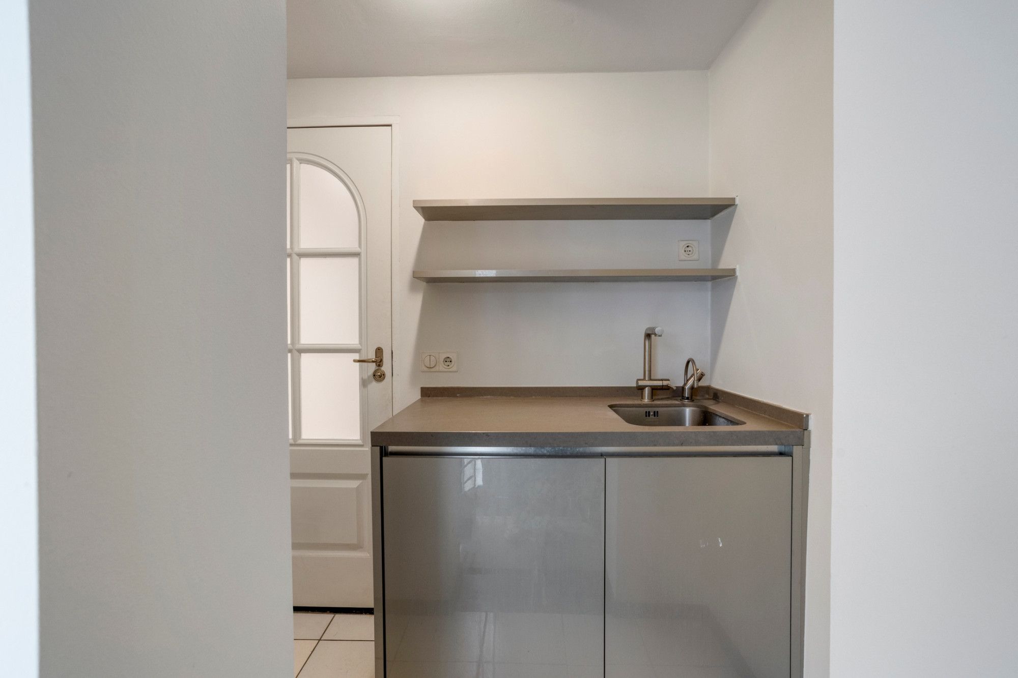 Bij binnenkomst in de hal bevindt zich aan de rechterzijde de garage, die doorloopt in een zelfstandige studio. Deze studio is voorzien van een woon-/slaapgedeelte, een praktische berging, een keuken met spoelbak en koelkast, en een badkamer met inloopdouche, zwevend toilet en wastafel. Ideaal voor gasten, kantoor aan huis of verhuur.