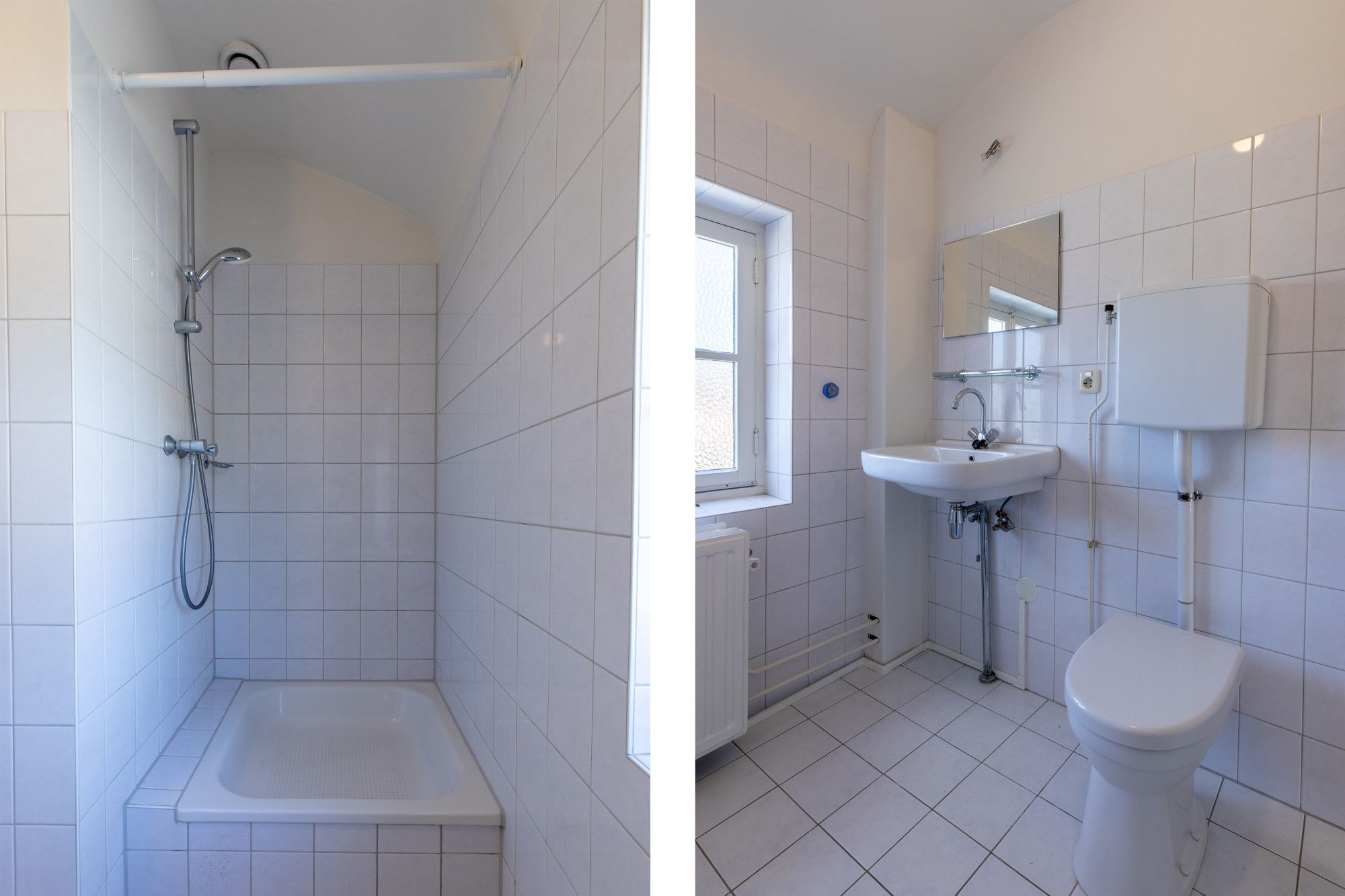 - Betegelde badkamer van ca. 5 m² met douche, wastafel en 2e toilet.