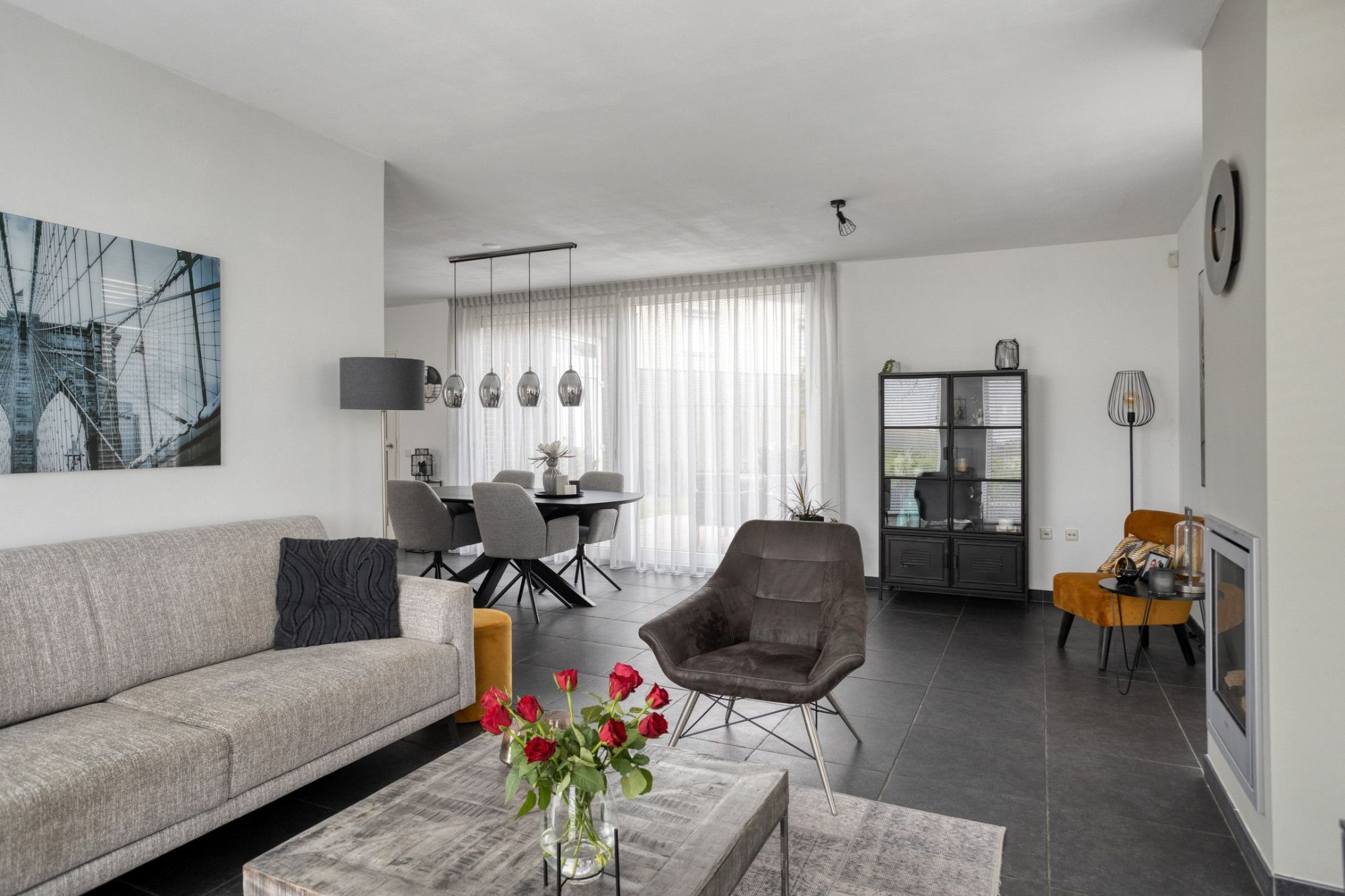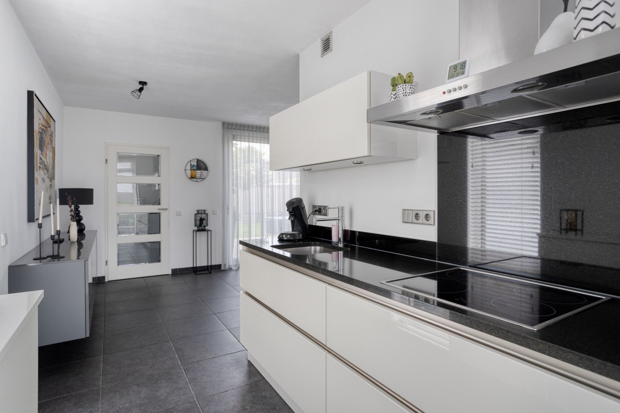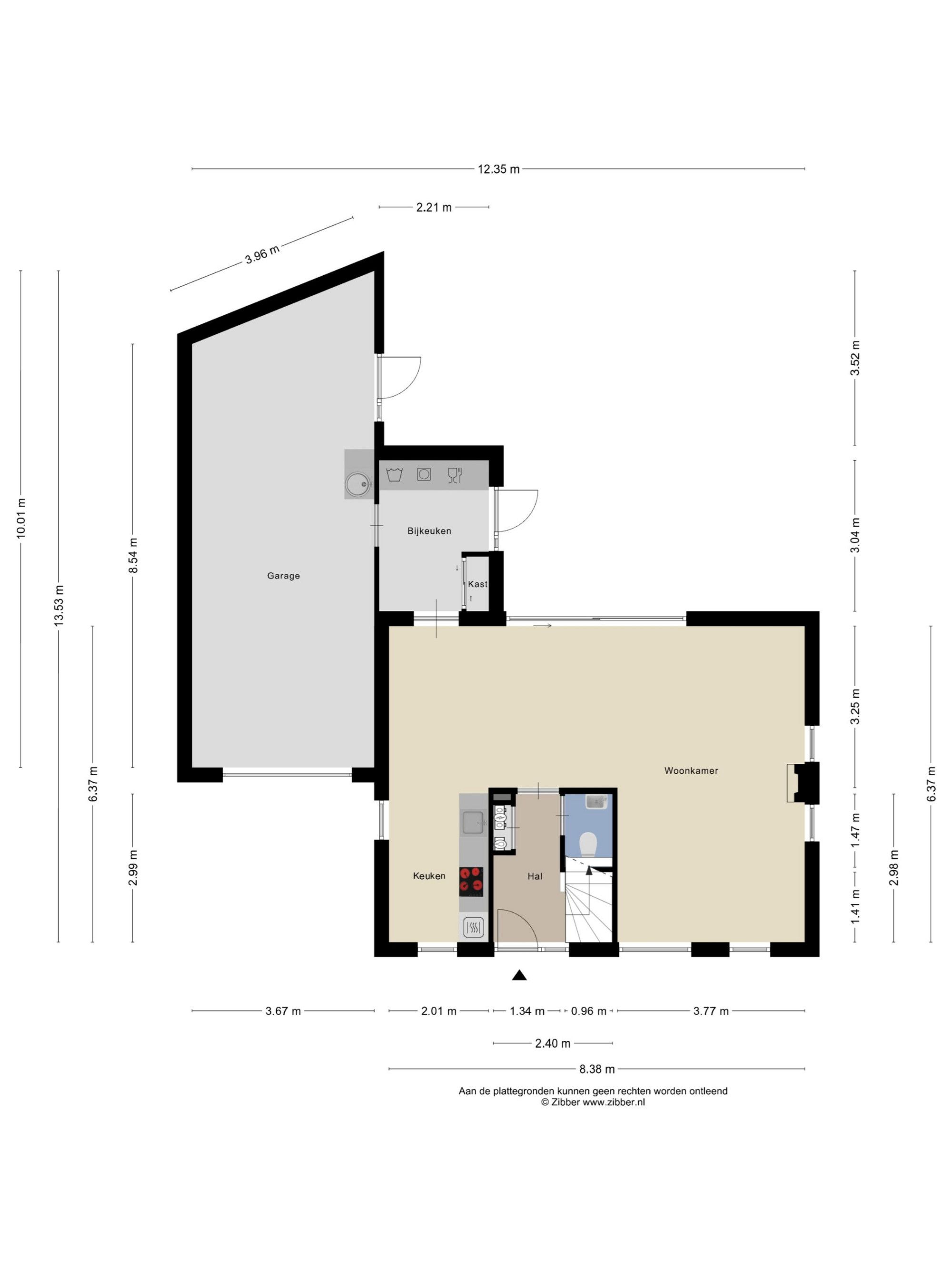 Begane grond: entree; meterkast, toilet met fonteintje; woonkamer in L-vorm met sfeerhaard (op gas), plavuizen vloer met vloerverwarming, een grote schuifpui naar de tuin; half open keuken met granieten aanrechtblad, keramische kookplaat, afzuigkap, combi-oven/magnetron en koelkast. De bijkeuken is voorzien van extra bergruimte en de benodigde witgoedaansluitingen; garage (extra lang) en uitgerust met een elektrische sectionaalpoort. Via de bijkeuken en de garage is de tuin eveneens te bereiken.
