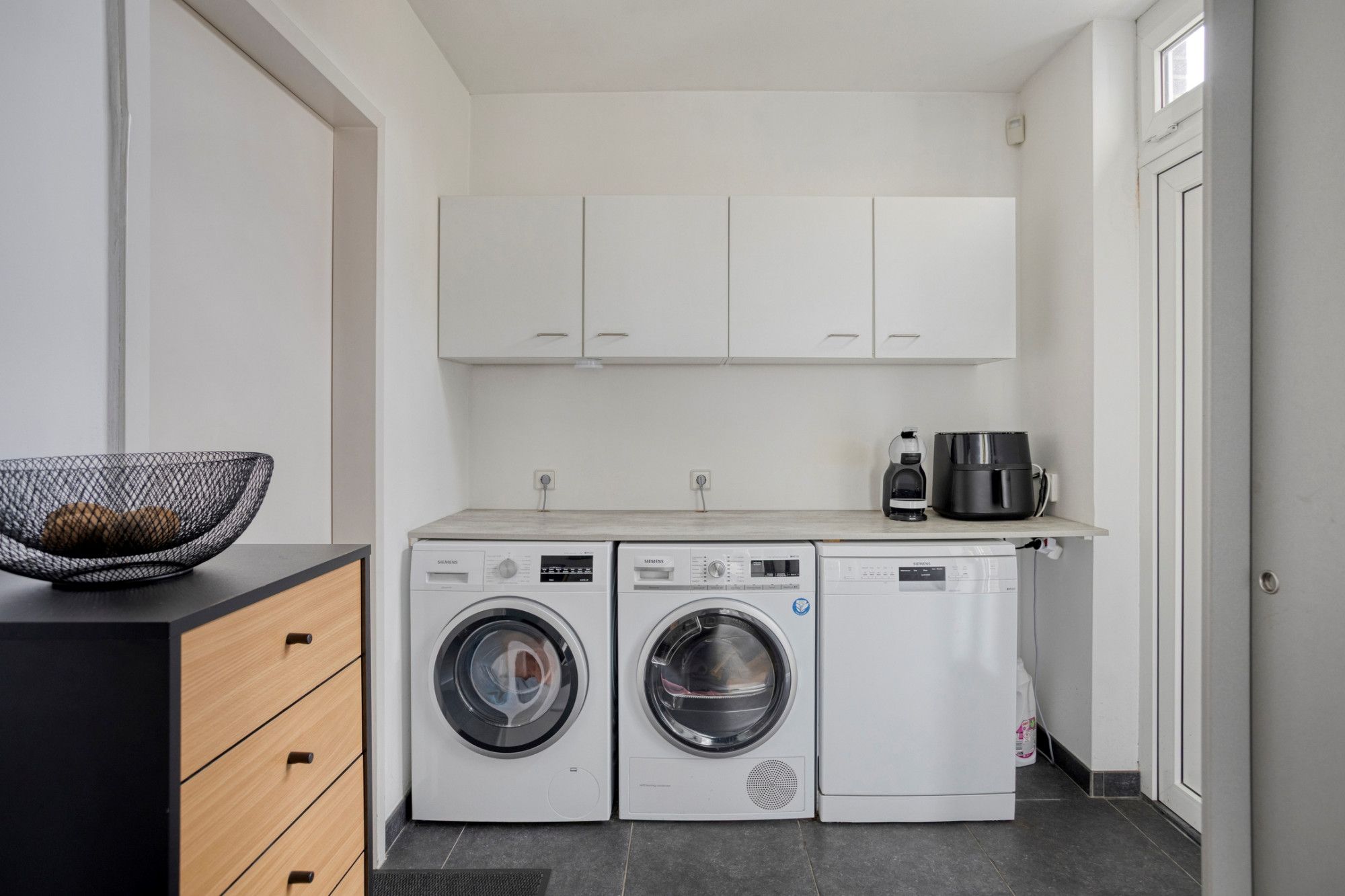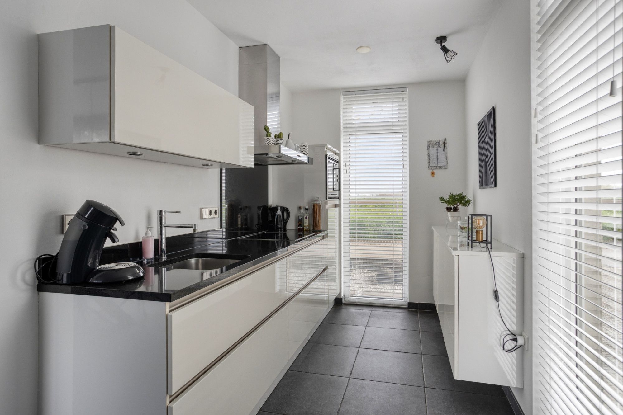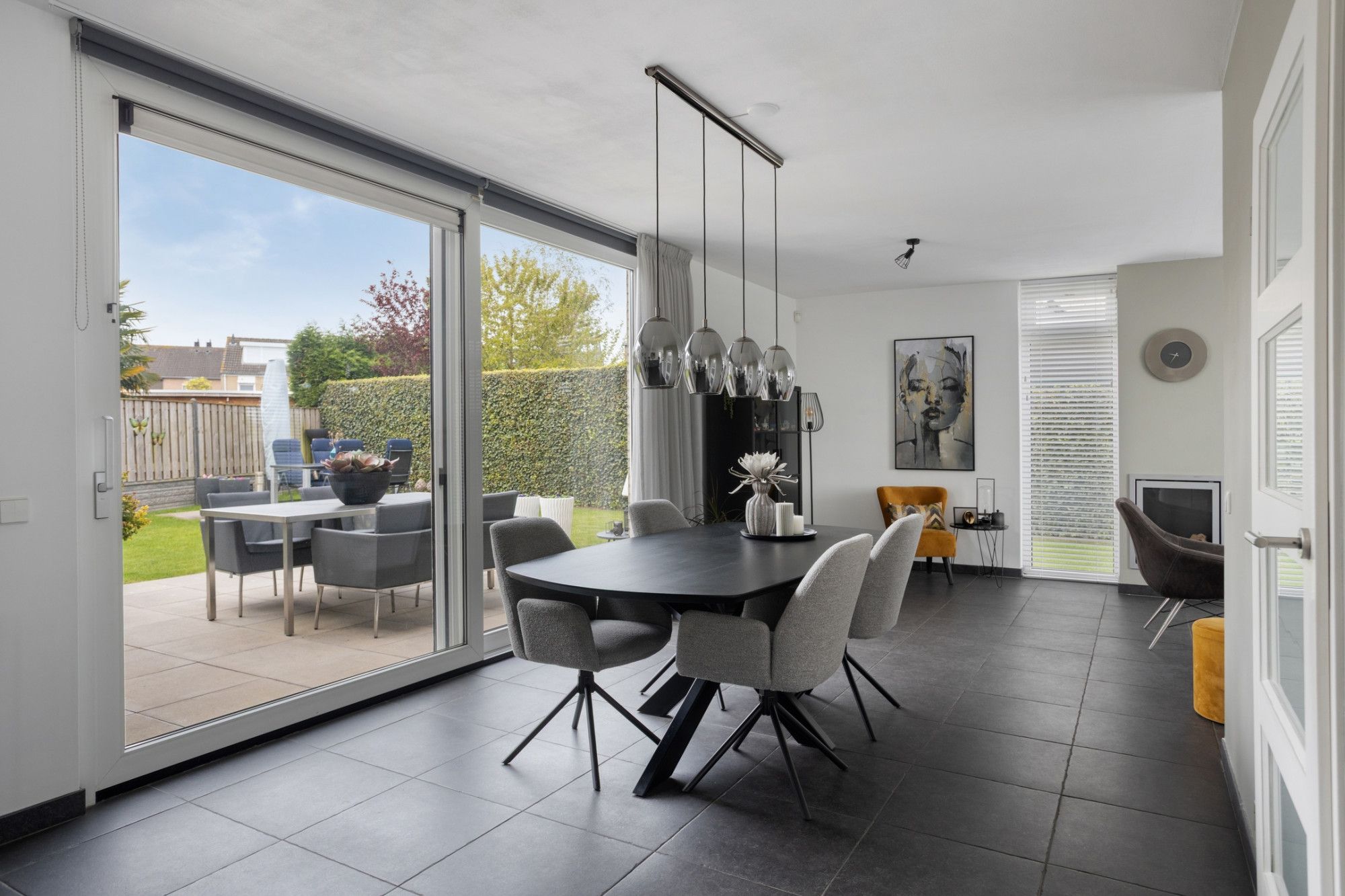 Begane grond: entree; meterkast, toilet met fonteintje; woonkamer in L-vorm met sfeerhaard (op gas), plavuizen vloer met vloerverwarming, een grote schuifpui naar de tuin; half open keuken met granieten aanrechtblad, keramische kookplaat, afzuigkap, combi-oven/magnetron en koelkast. De bijkeuken is voorzien van extra bergruimte en de benodigde witgoedaansluitingen; garage (extra lang) en uitgerust met een elektrische sectionaalpoort. Via de bijkeuken en de garage is de tuin eveneens te bereiken.