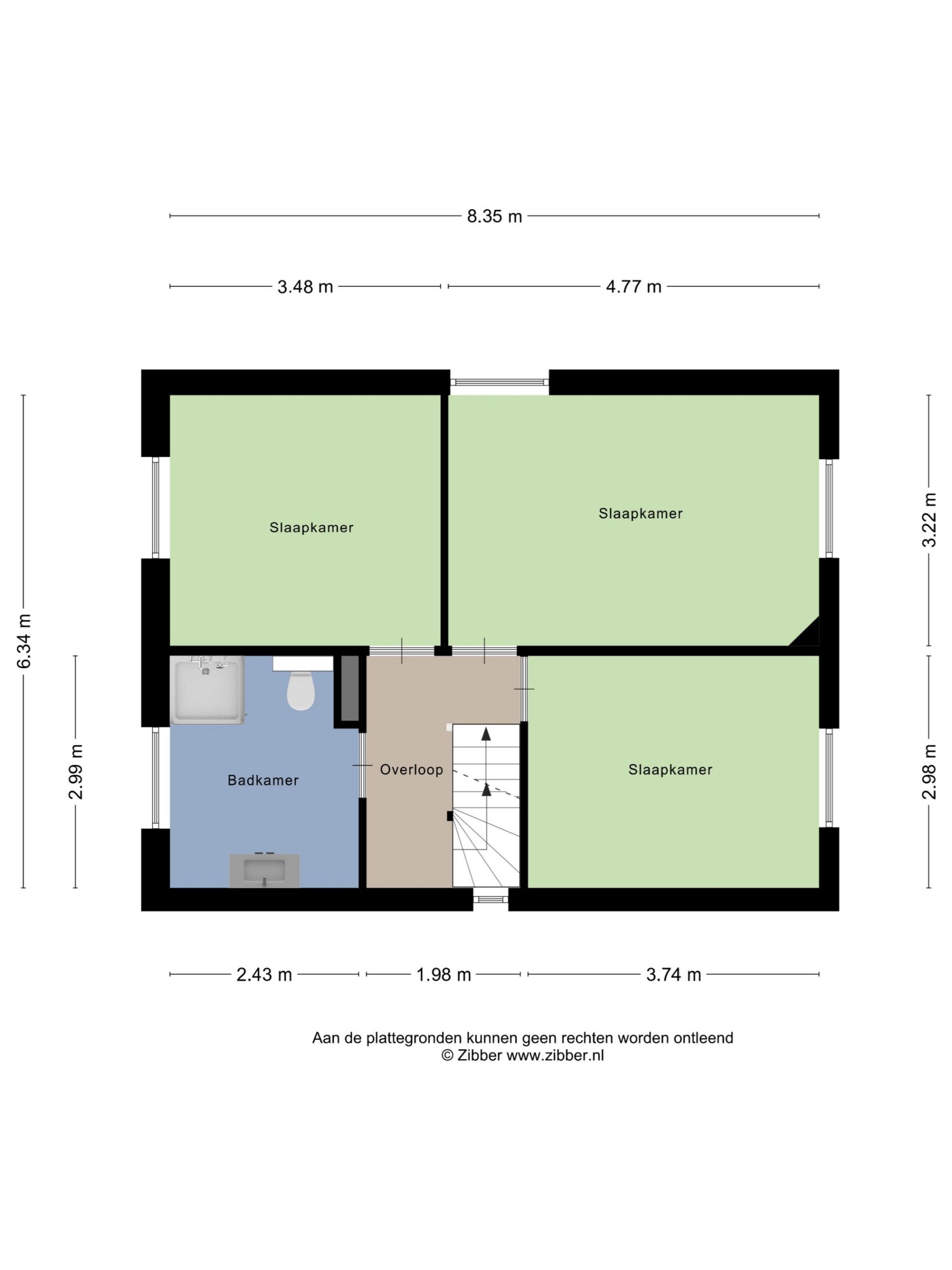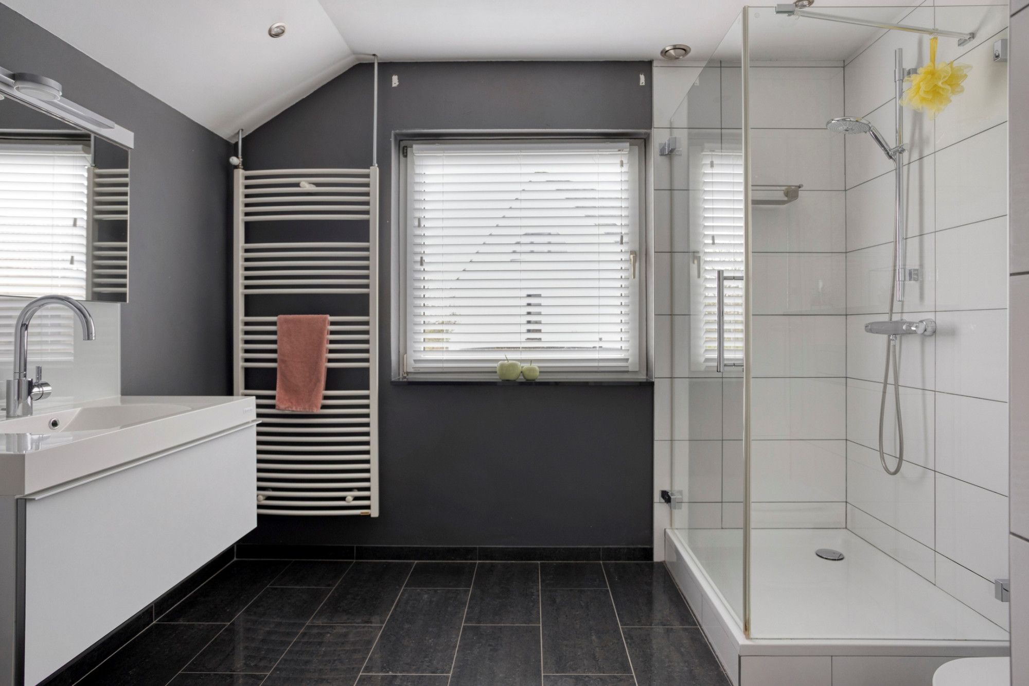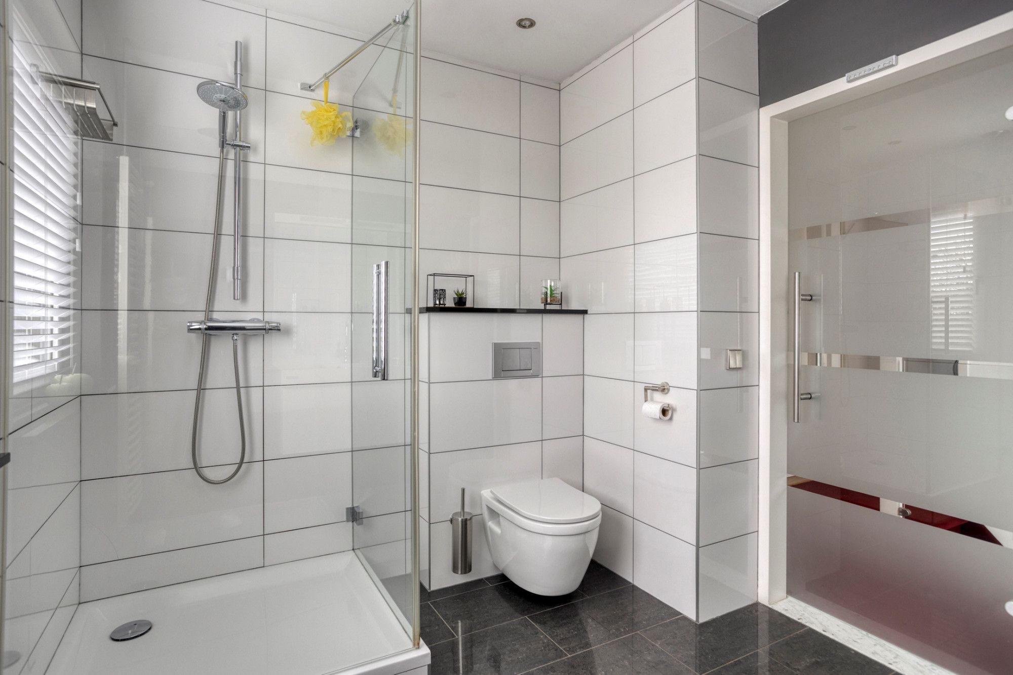 Verdieping: overloop naar 3 slaapkamers en een frisse badkamer met ruime douche, wastafel en toilet.