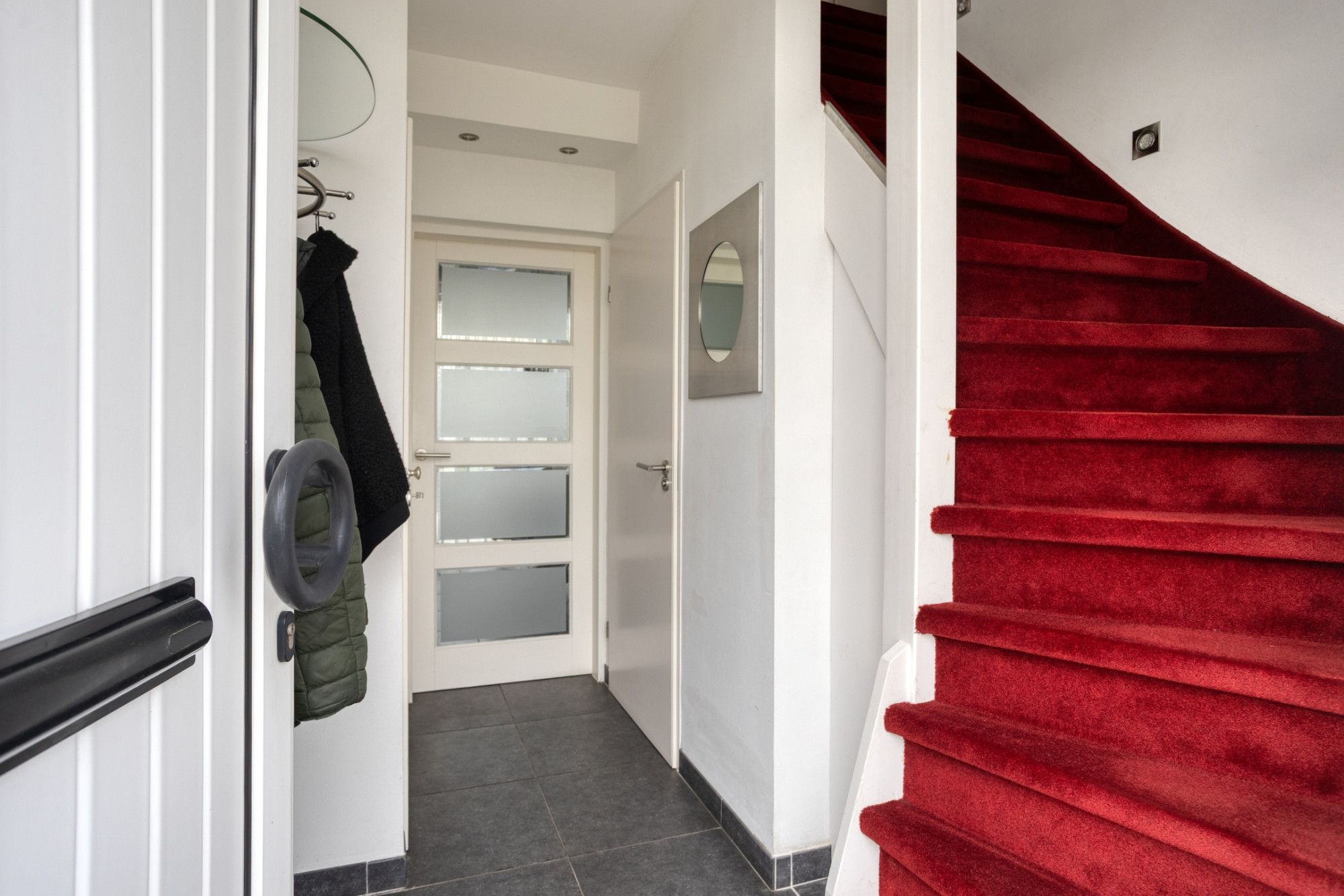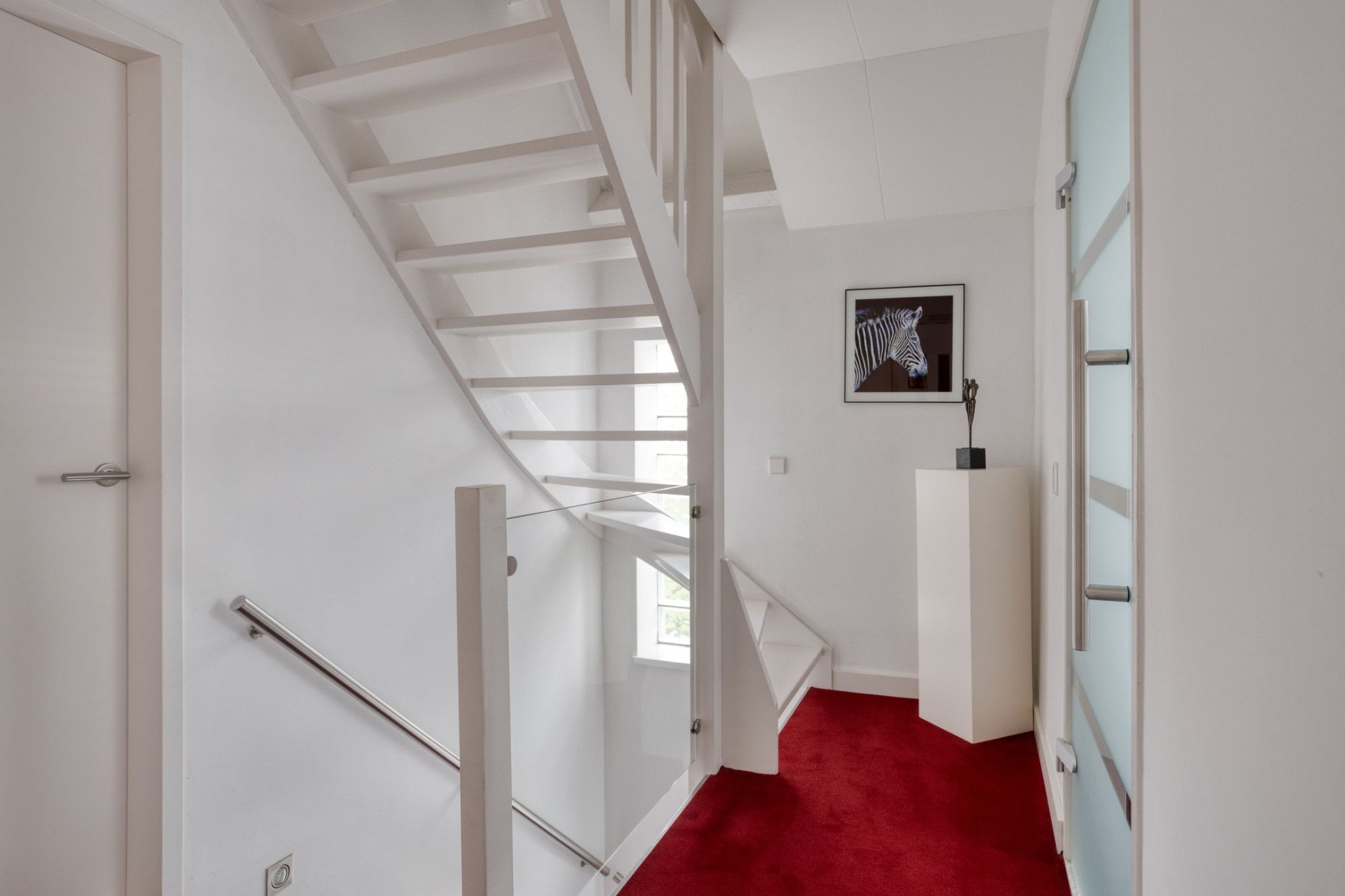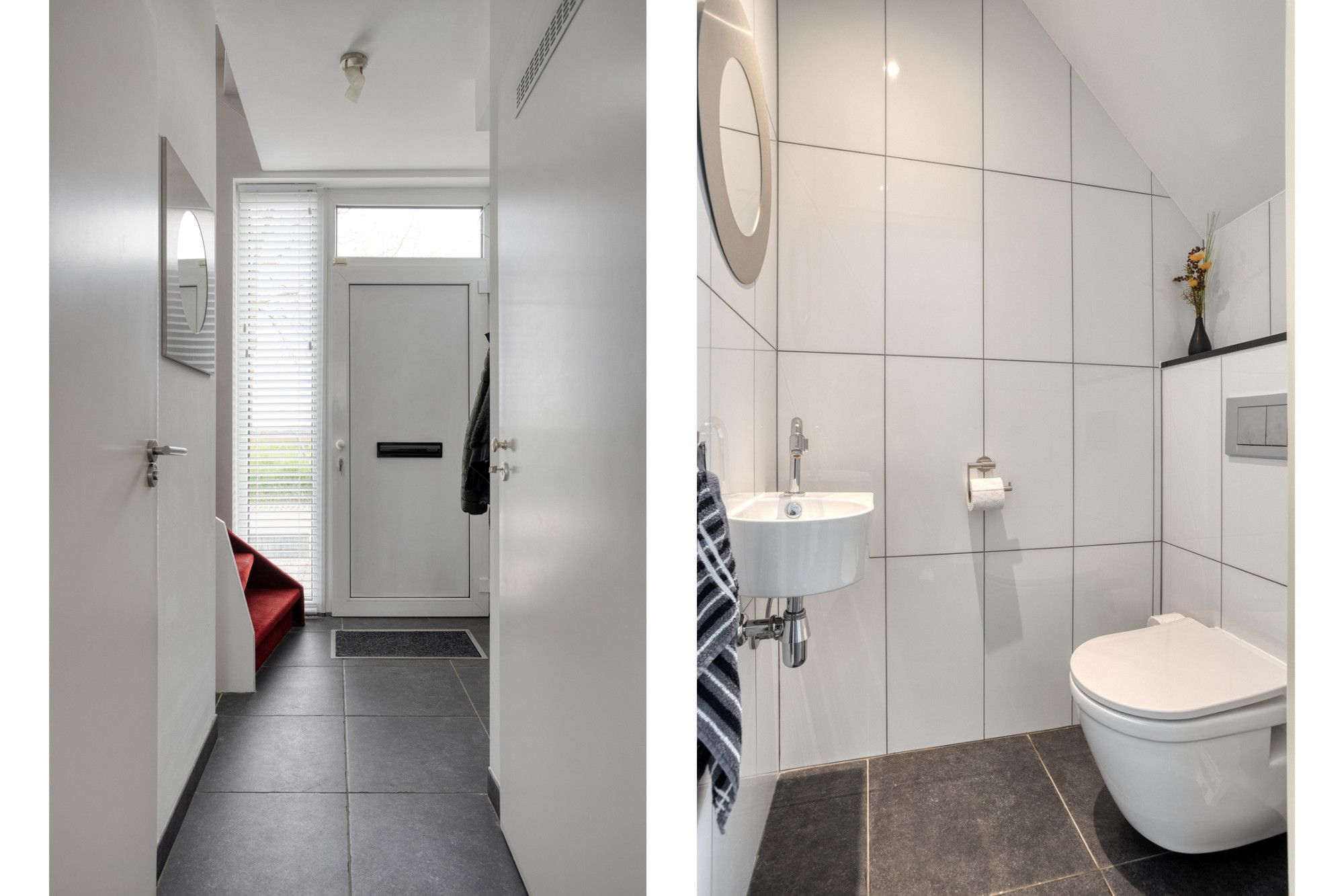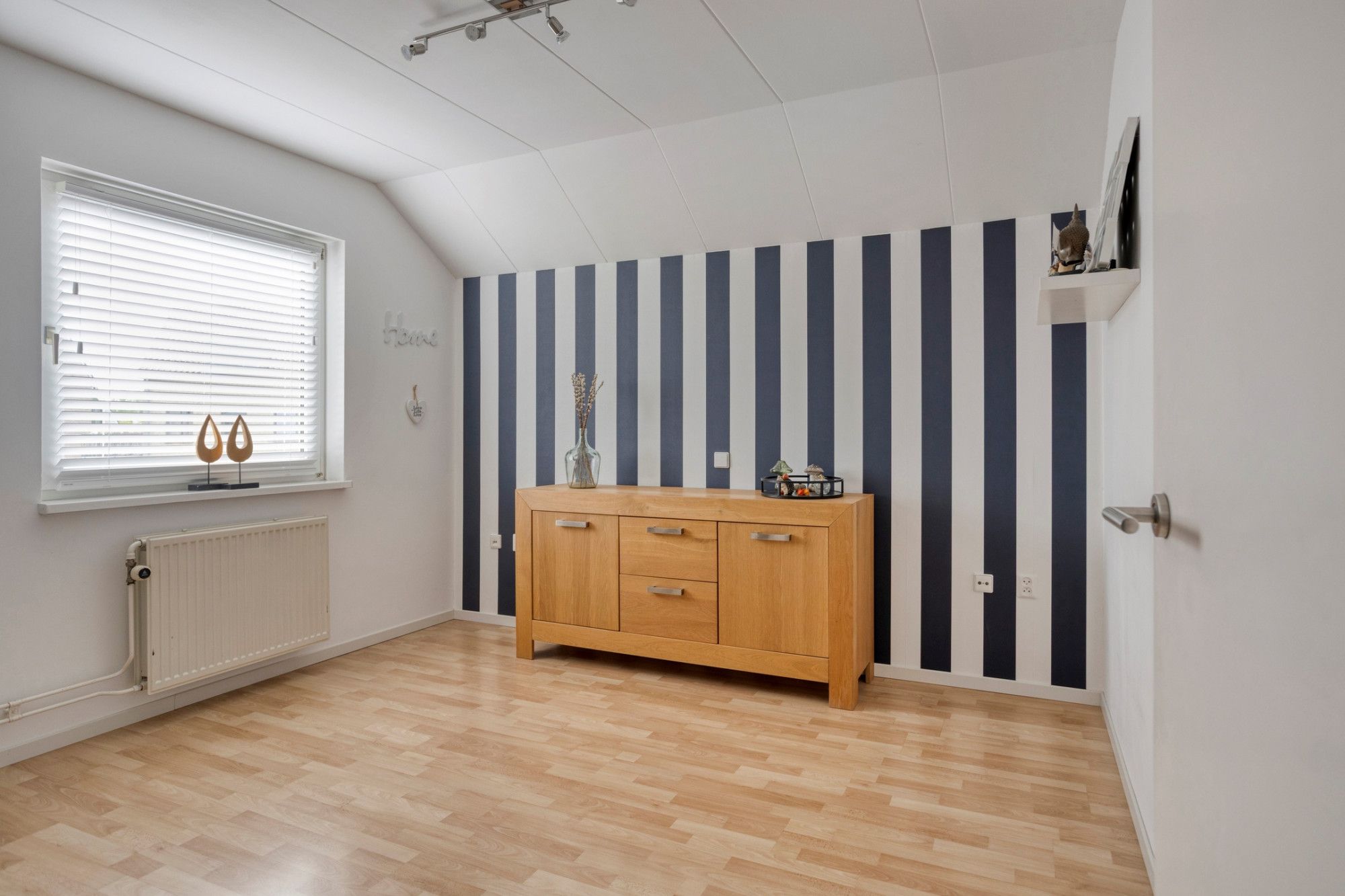 Verdieping: overloop naar 3 slaapkamers en een frisse badkamer met ruime douche, wastafel en toilet.