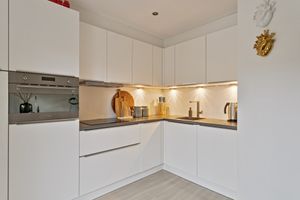 Keuken: De woning beschikt over een moderne L-vormige hoogglanskeuken met inbouwapparatuur en een stijlvolle afwerking.