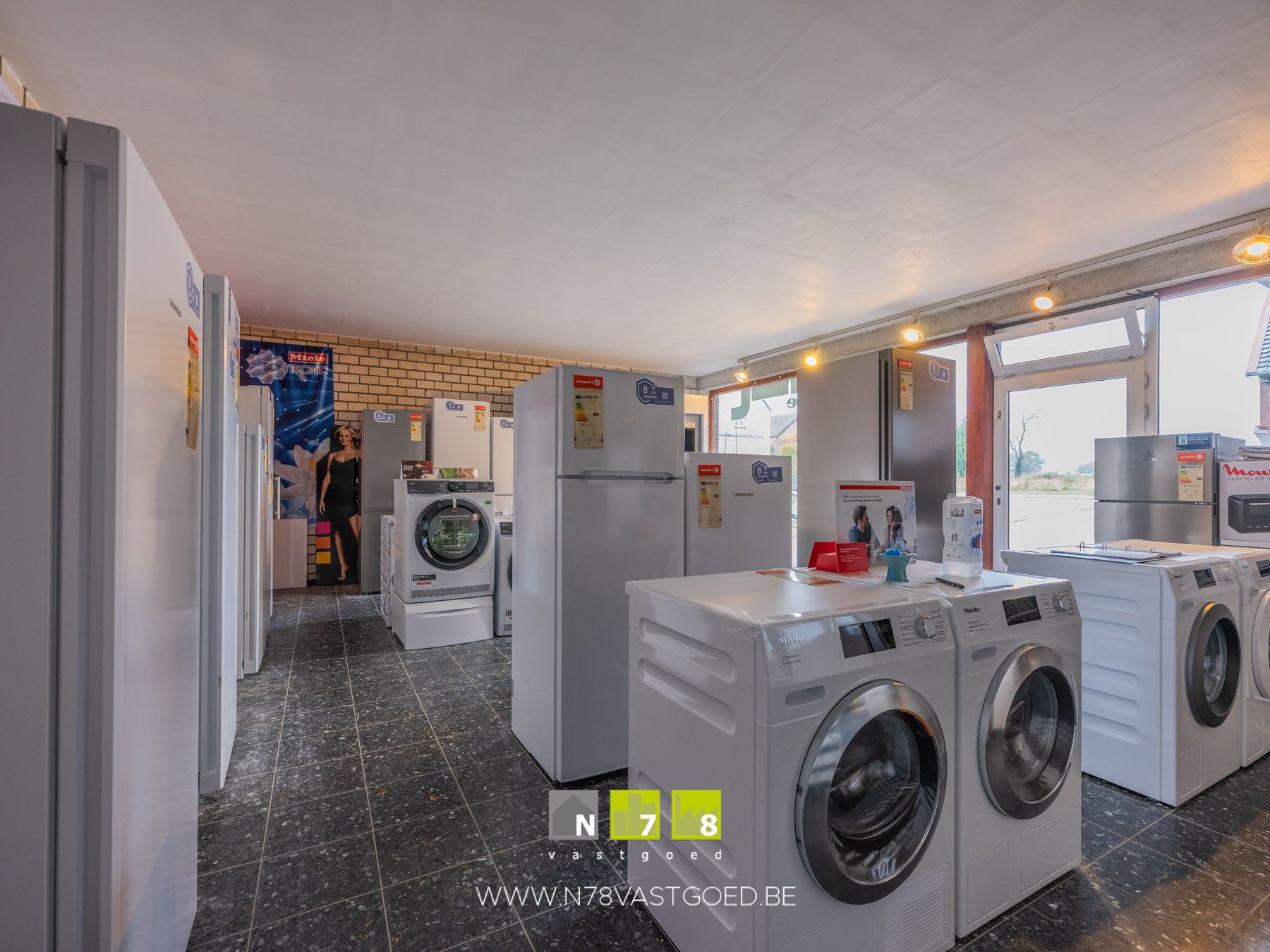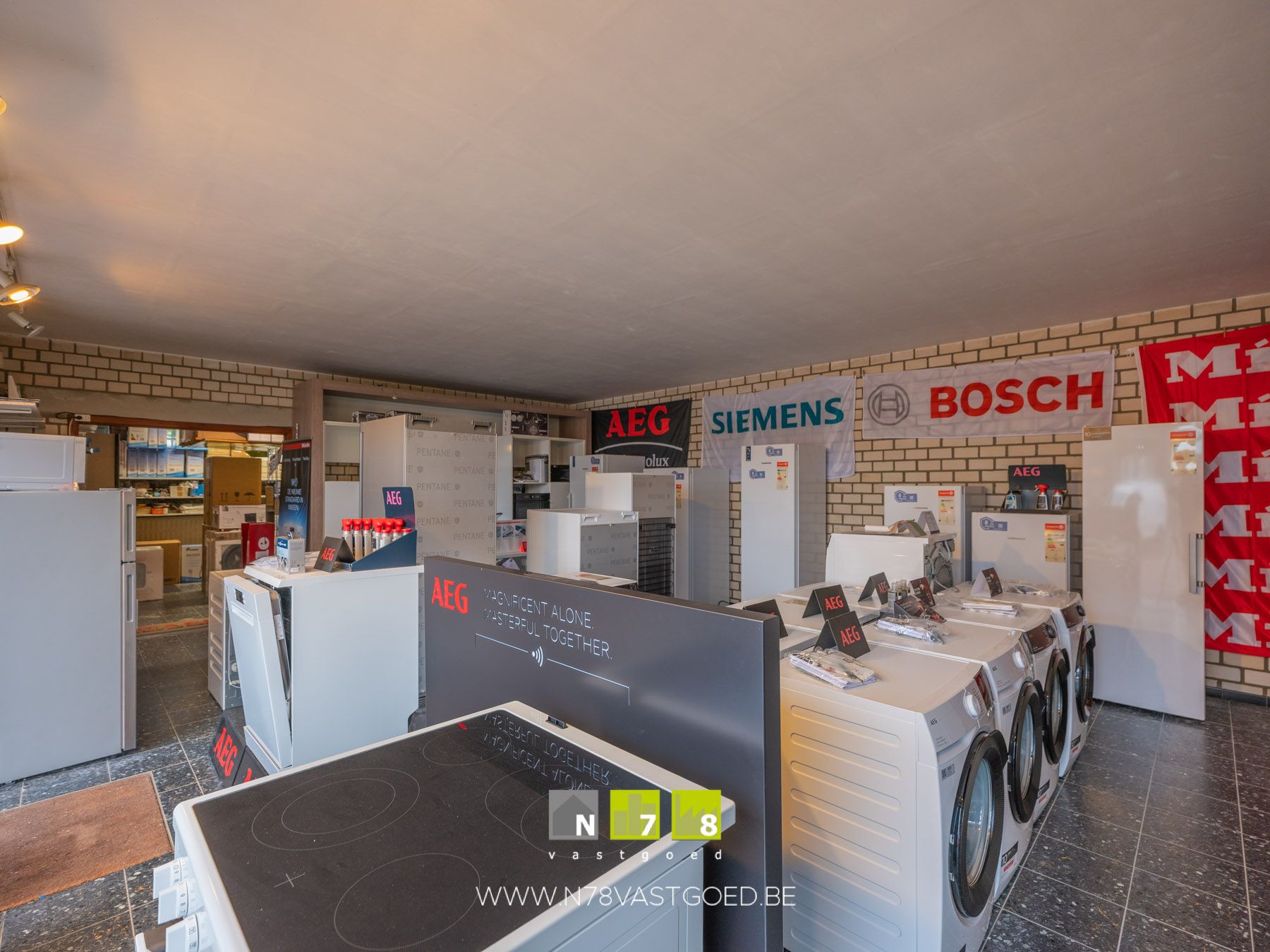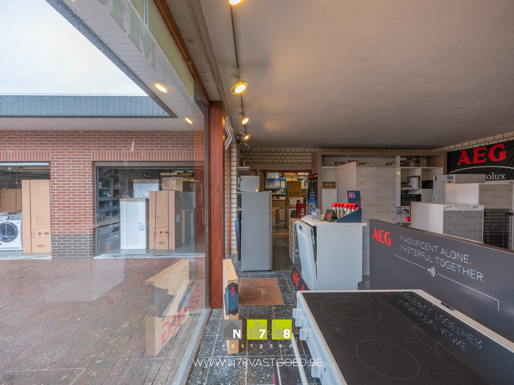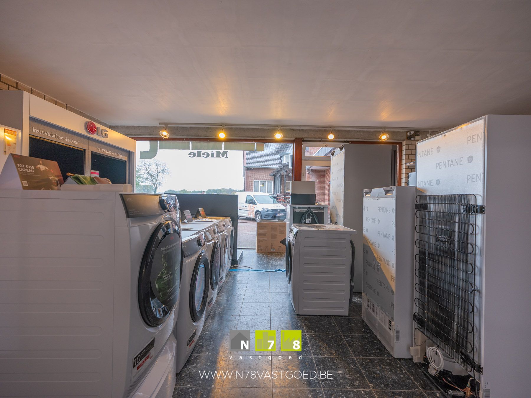 - Ruimte 2 (achterzijde): toonzaal, tegelvloer.