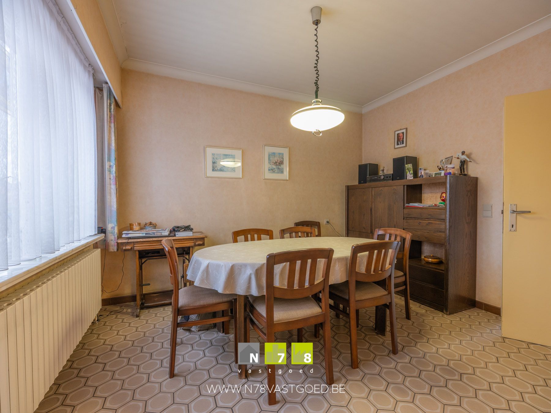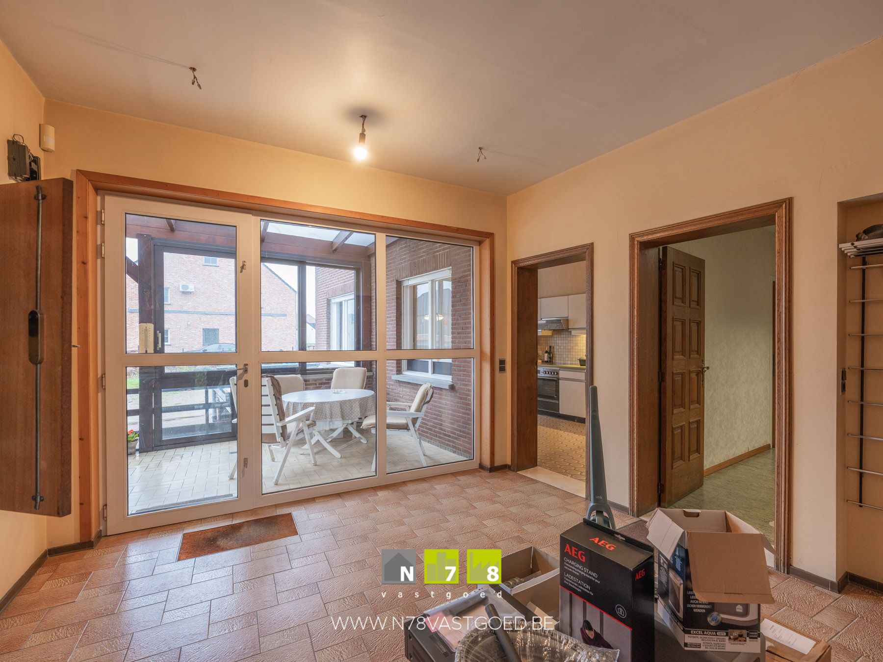 - Inkomhal : deur + raam naar terras aan de achterzijde, tegelvloer.