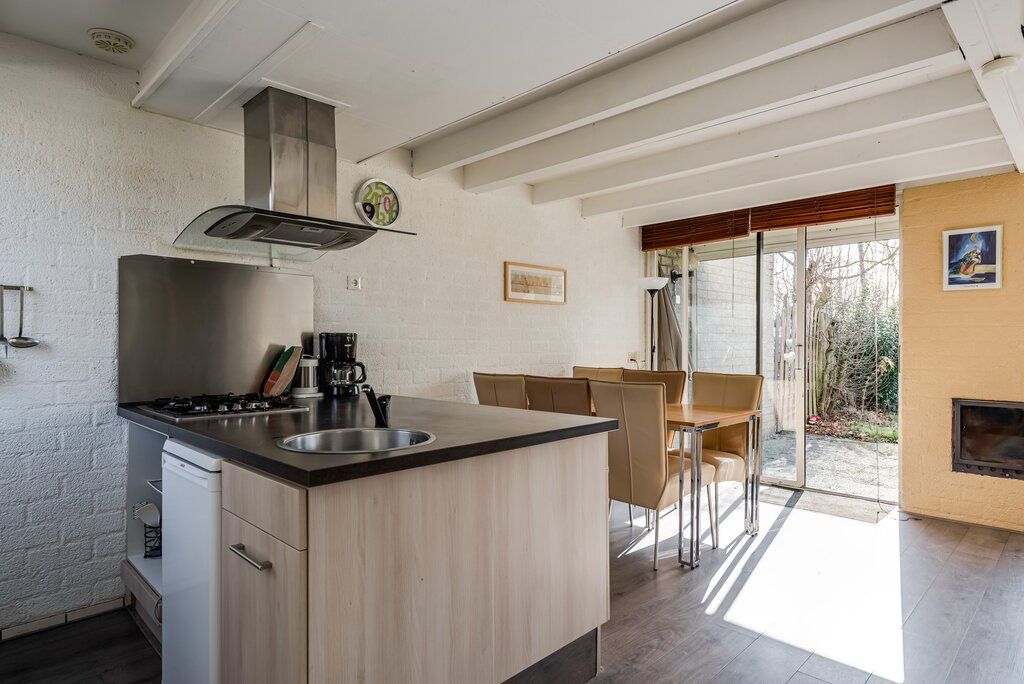 Via de entree bereikt u de halfopen keuken, uitgevoerd in een moderne opstelling met een breed werkblad/eiland en diverse inbouwapparatuur, waaronder een gaskookplaat, afzuigkap, koelkast en vaatwasser. De keuken staat in directe verbinding met de woonkamer en is, net als de woonkamer, voorzien van een laminaatvloer (gelegd op een doorlopende tegelvloer). De woonkamer is een fijne, lichte leefruimte met een sfeervolle haard als centraal element. Dankzij de grote raampartij en schuifpui is er volop lichtinval én direct contact met de tuin, waardoor binnen en buiten naadloos in elkaar overlopen. De badkamer is functioneel ingericht en voorzien van een wastafel met meubel, een ligbad/douchecombinatie en een toilet. Onder de trap bevindt zich de meterkast. Aan de voorzijde van de woning ligt de praktische berging met wasmachineaansluiting en de opstelling van de cv-combiketel (Intergas HR, eigendom, 2015).