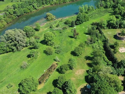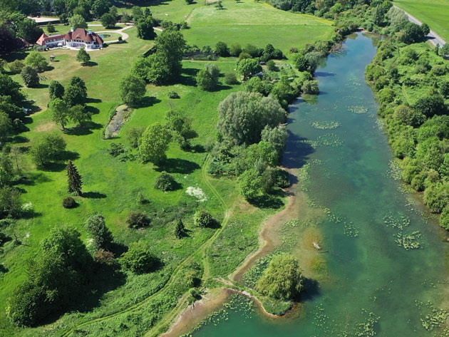 Sfeervolle waterpartijen en een grote natuurlijke zwemvijver, gevoed door een historische Rijnarm