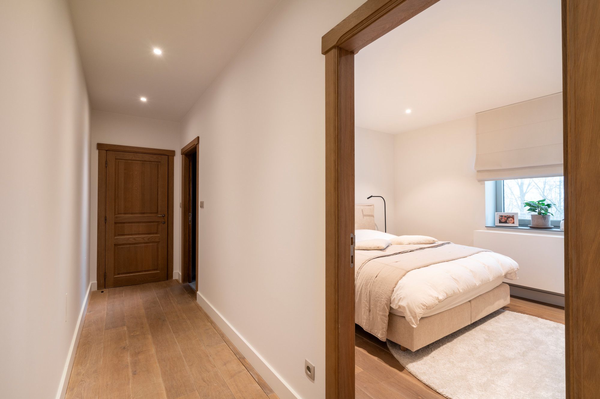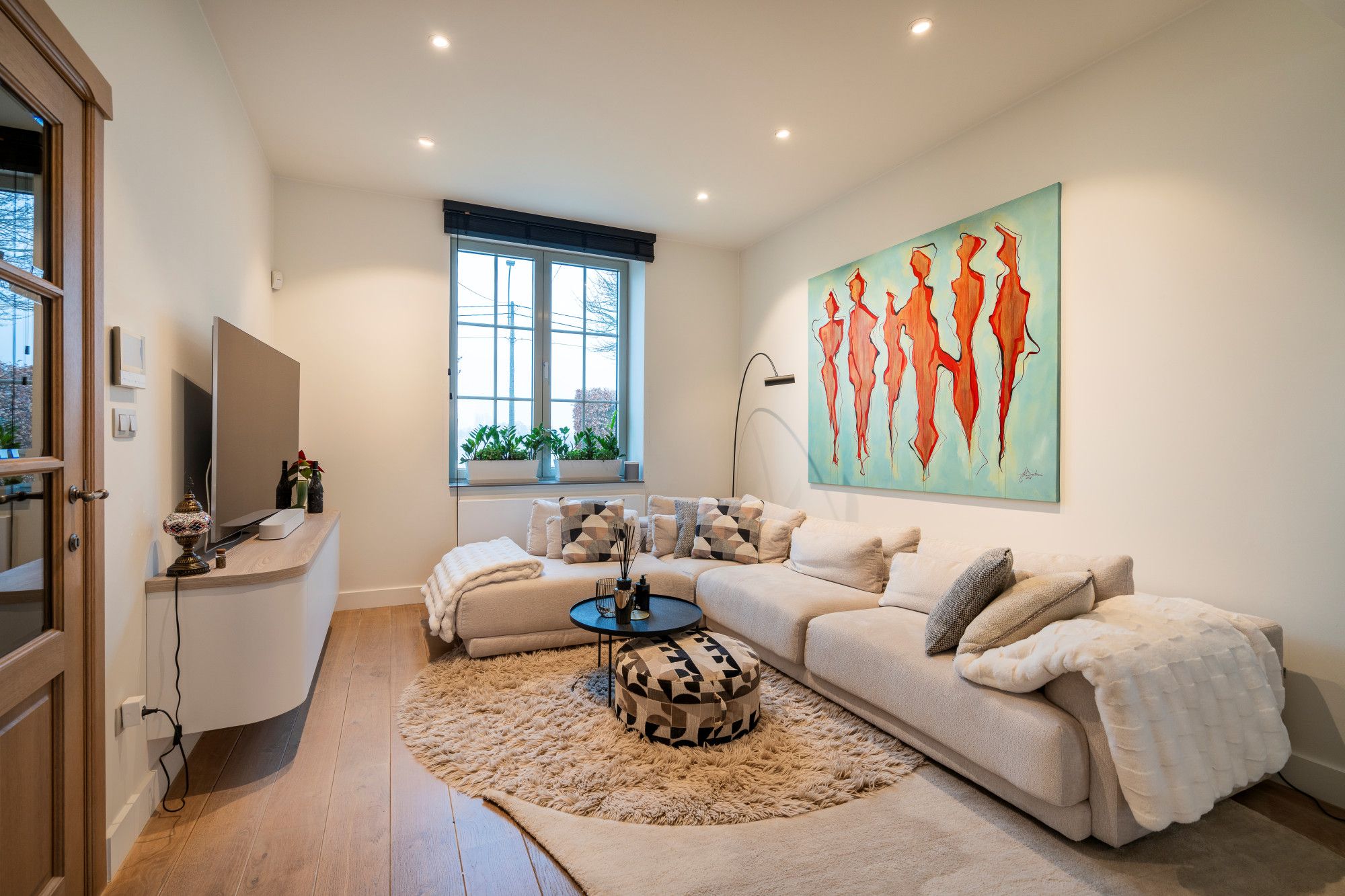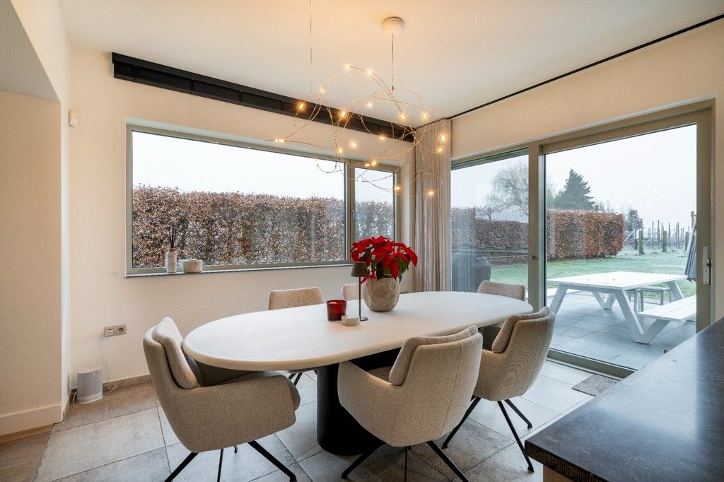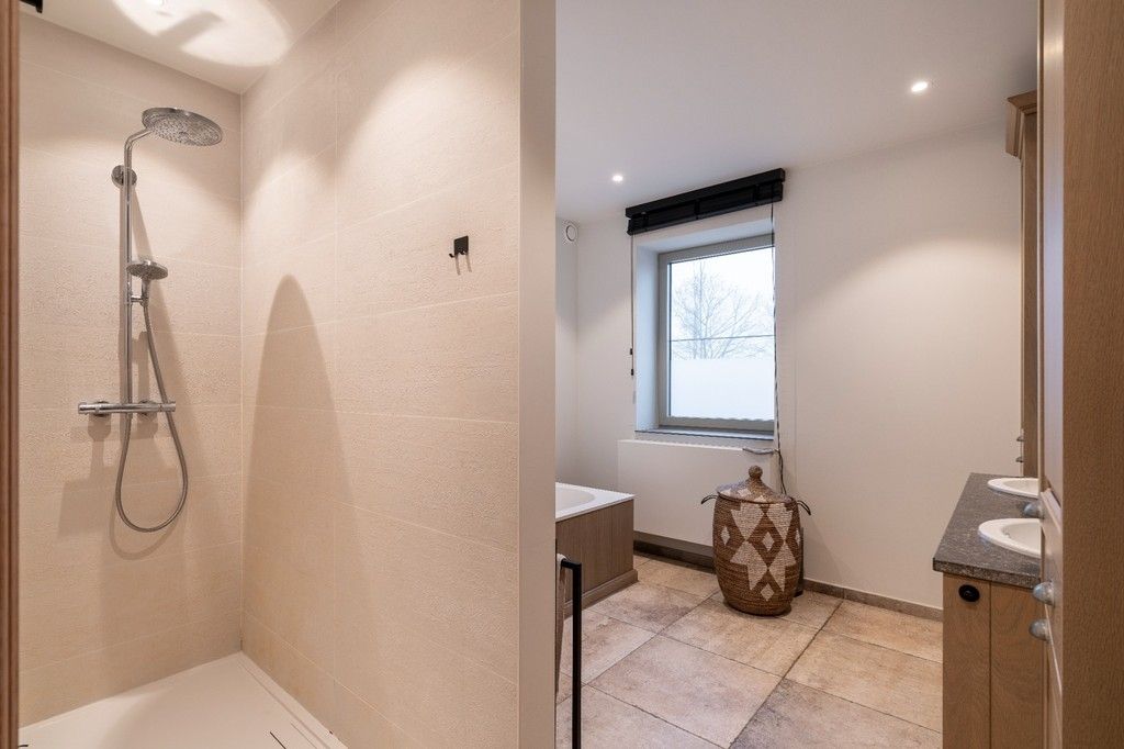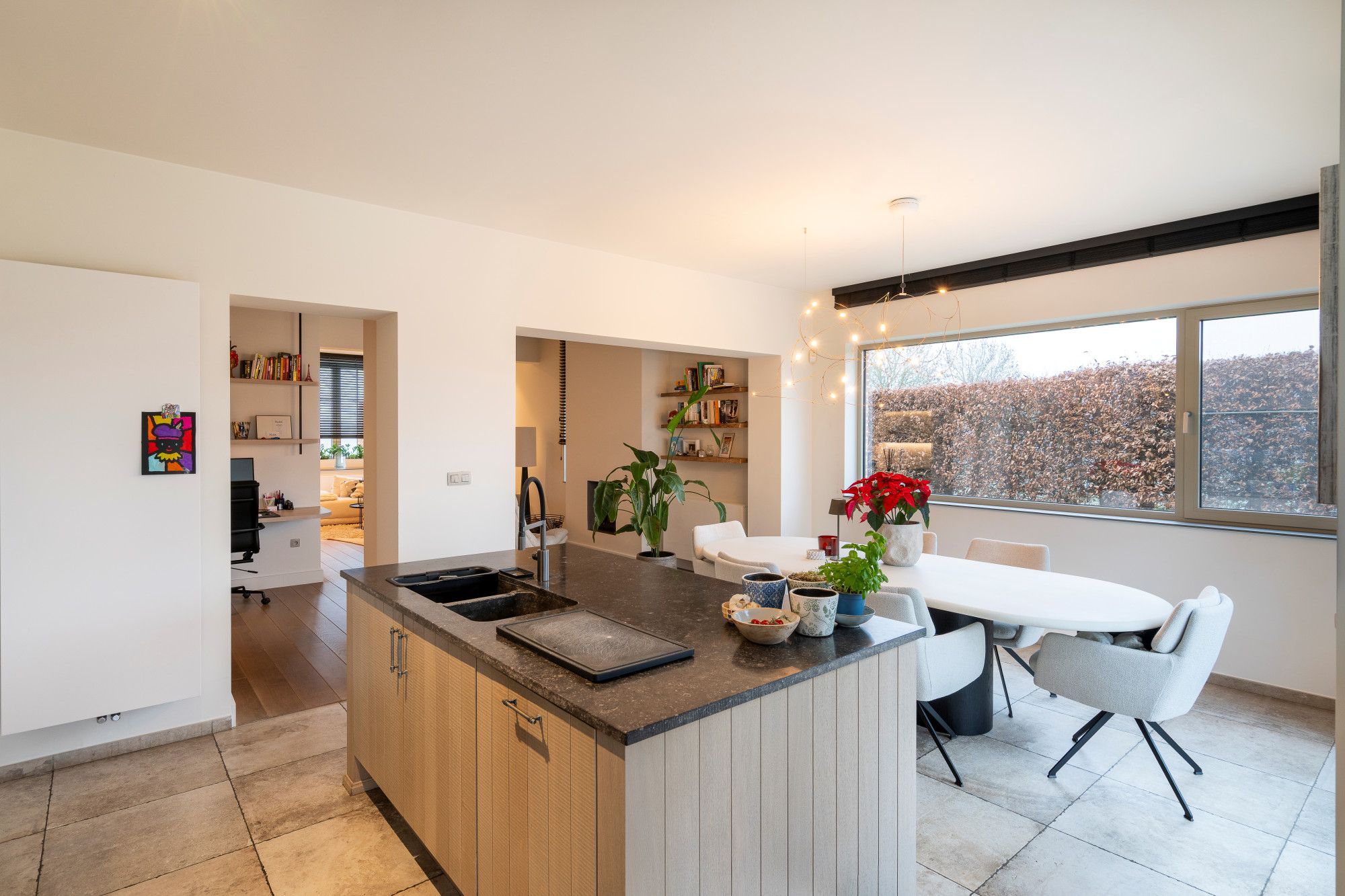 De woning beschikt over een maatwerkinterieur, zonnepanelen, een zonneboiler en airconditioning in de woonkamer en op de eerste verdieping. Via de centrale inkomhal betreedt u de lichtrijke doorzonwoonkamer met een aparte tv-hoek, een sfeervolle zithoek rond de houthaard, een ingebouwde bureauhoek en een gezellige eethoek. Aansluitend bevindt zich de volledig geïnstalleerde maatwerkkeuken met natuurstenen werkblad, uitgerust met onder meer een Falcon gasfornuis, koelkast, wijnkoelkast, combi-oven, vaatwasser, afzuigkap en dubbele spoeltafel.