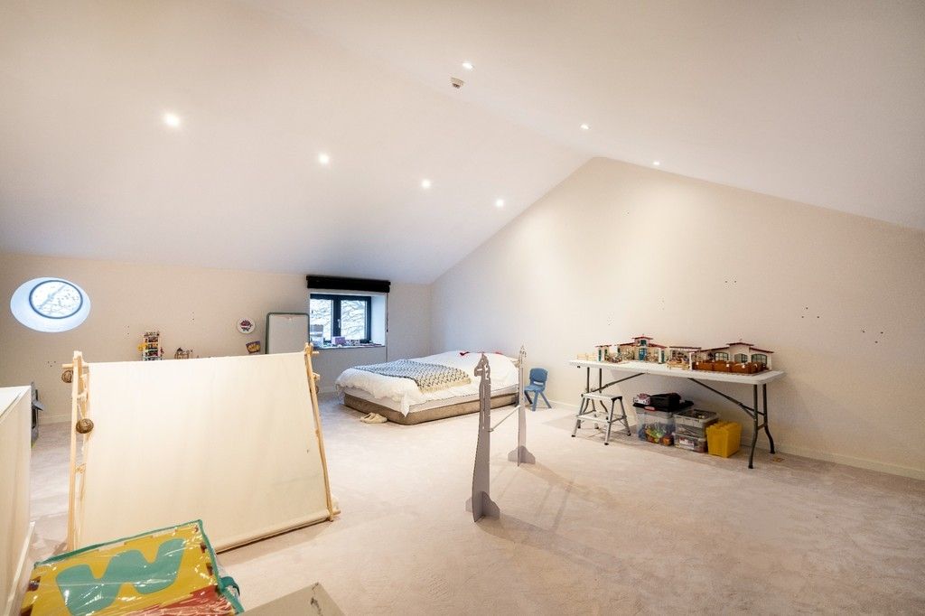 Op de eerste verdieping bevinden zich drie volwaardige slaapkamers, een badkamer met ligbad, inloopdouche en dubbele wastafel in meubel, een apart toilet en een praktische berging. Een vaste trap leidt naar de afgewerkte zolderverdieping, ideaal als hobbyruimte of vierde slaapkamer.