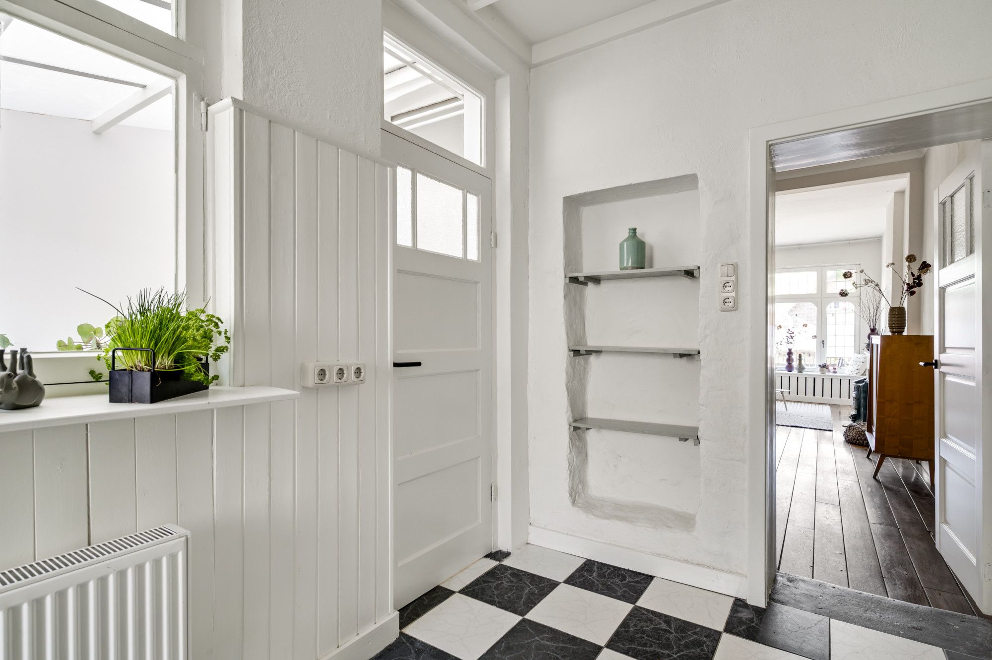 De toegang maakt direct indruk: Via een overdekte entree is de ontvangsthal toegankelijk. De karakteristieke terrazzovloer en glas-in-looddetails zorgen voor een warme en authentieke uitstraling. Vanuit de hal bereikt u de royale woonkamer. Hier zorgen de grote raampartijen, de fraaie houten plankenvloer en de sfeervolle schouw met sierkachel (niet in gebruik) voor een aangename leefomgeving. De woonkamer heeft een speelse doorkijk naar de serre. De keuken is praktisch ingericht in een hoekopstelling met een gasfornuis en afzuigkap en biedt toegang tot zowel de serre, de wasruimte als de achtertuin. De serre vormt een volwaardige verlenging van de leefruimte en is dankzij de openslaande deuren een heerlijke plek om binnen en buiten met elkaar te verbinden. Aansluitend bevindt zich de toiletruimte en is de kelderruimte toegankelijk.