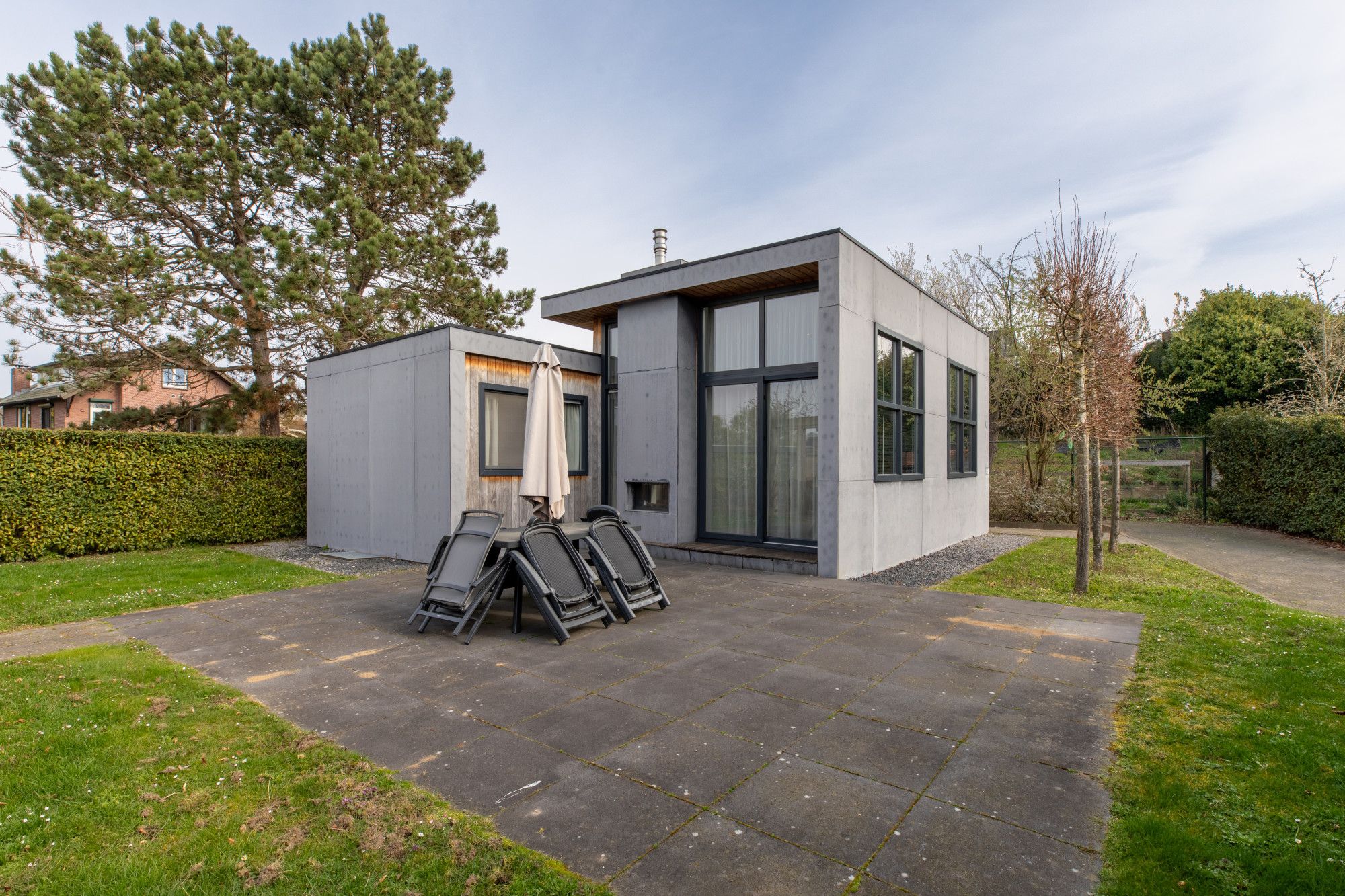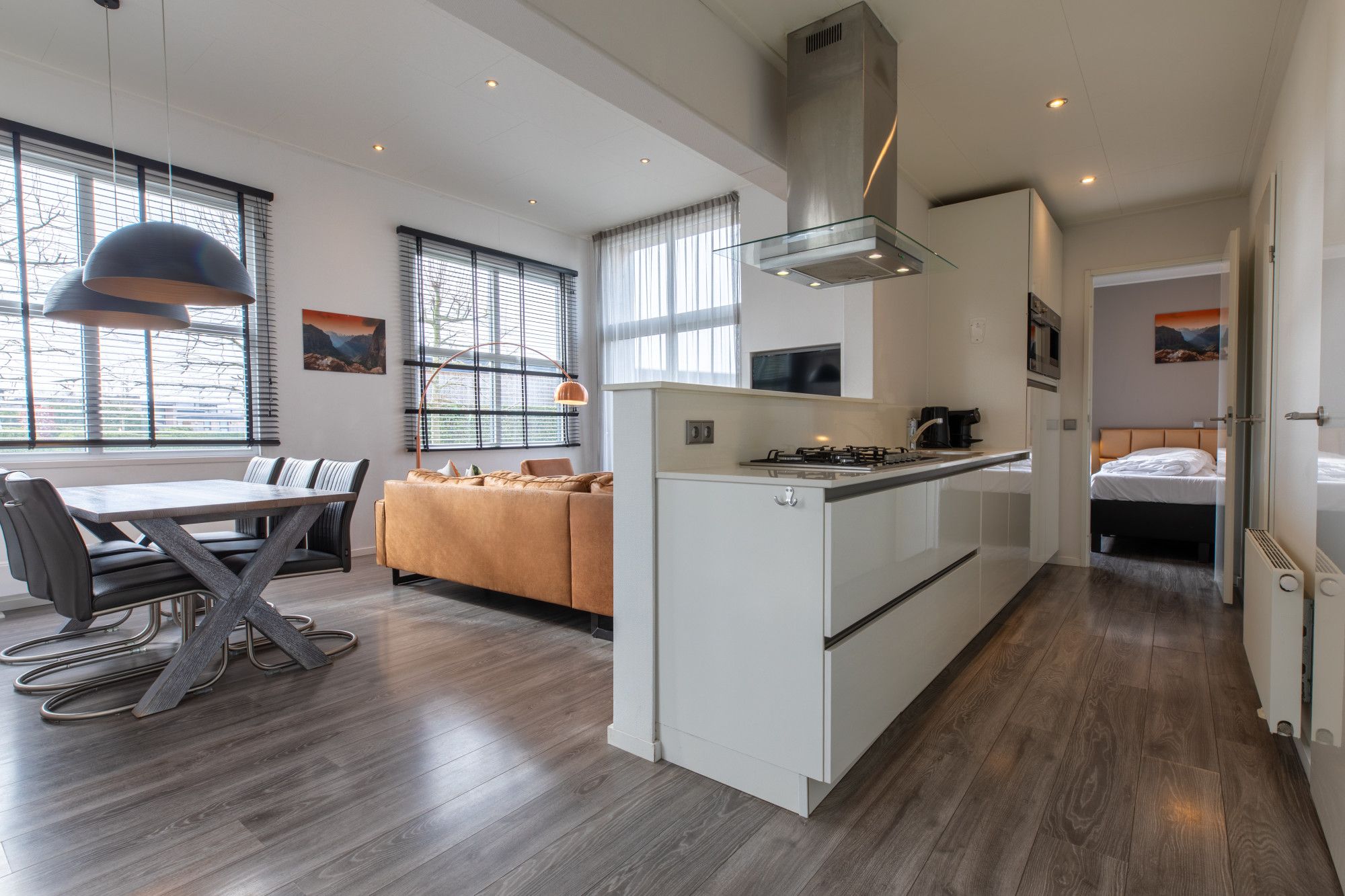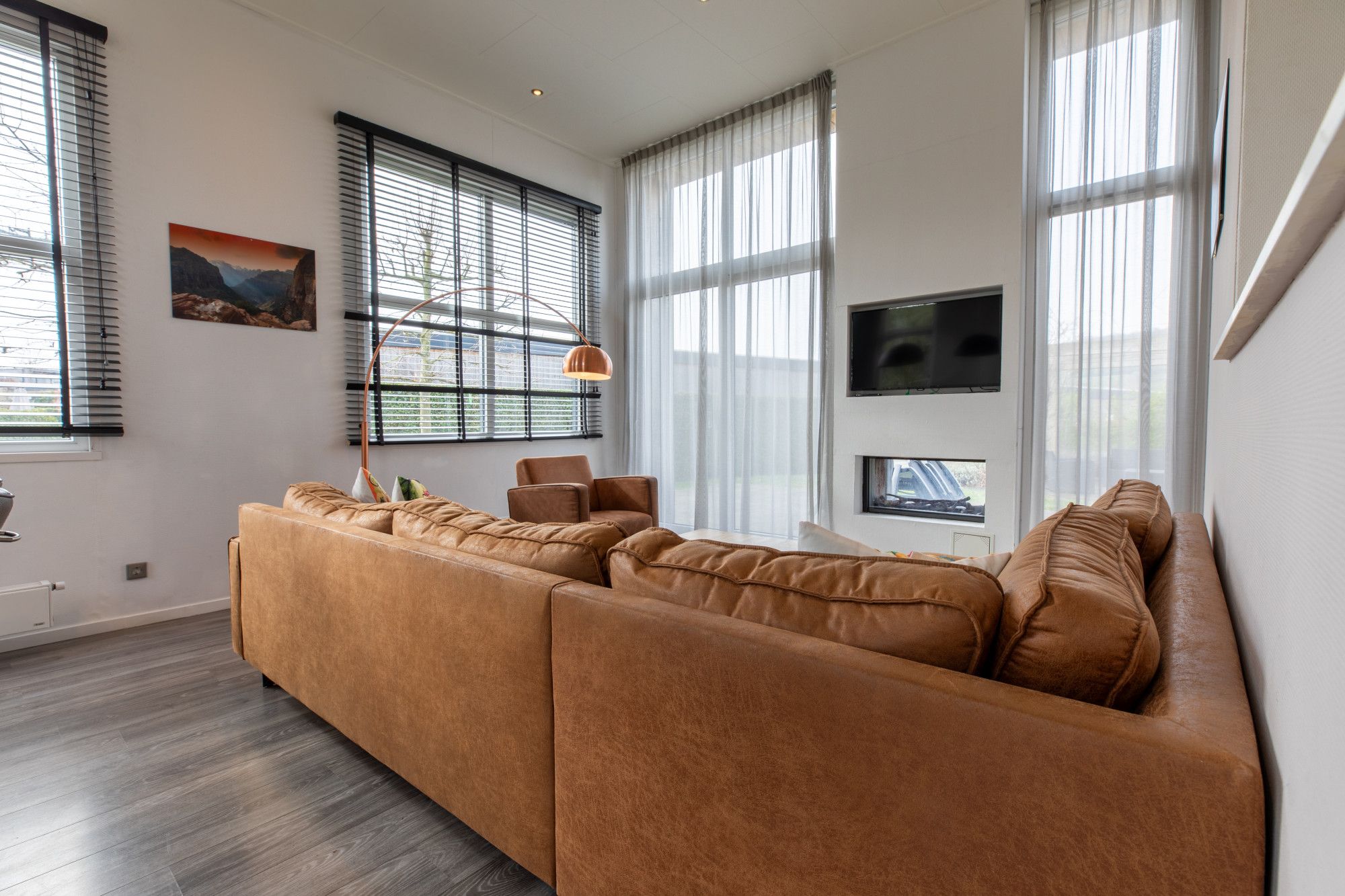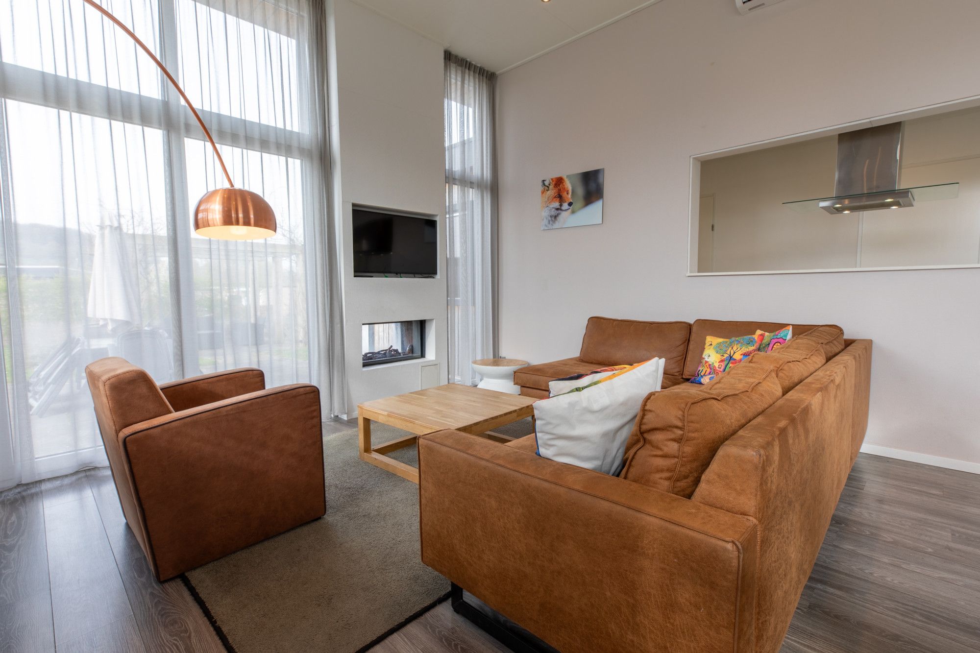 Deze recreatiewoning heeft luxe afwerking en in de woonkamer nog een gashaard, met doorkijk naar het terras en een airconditioning.