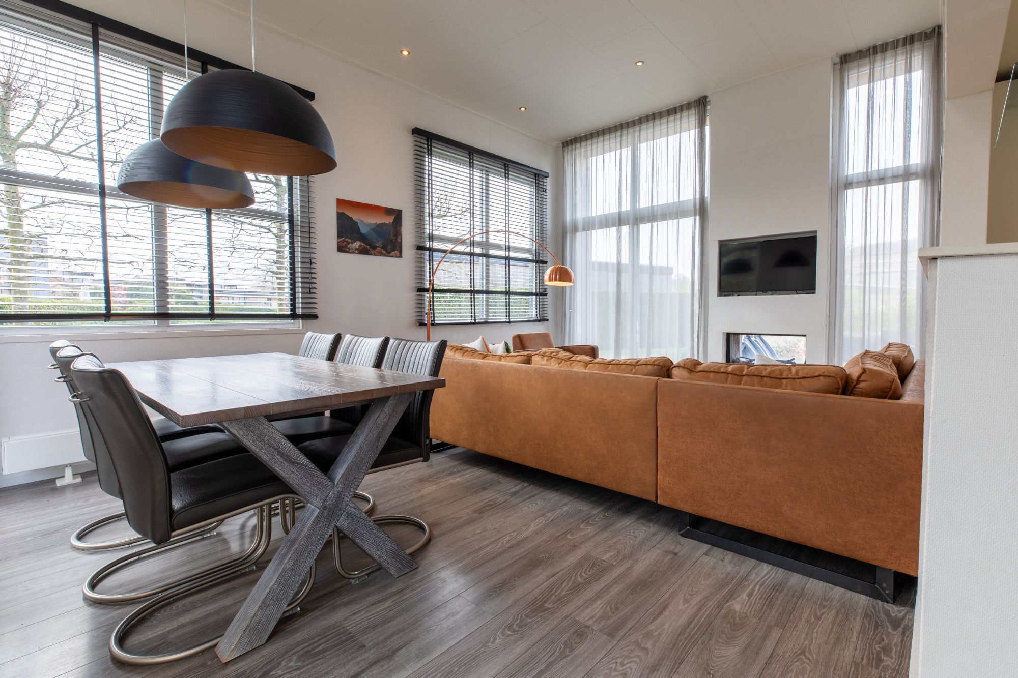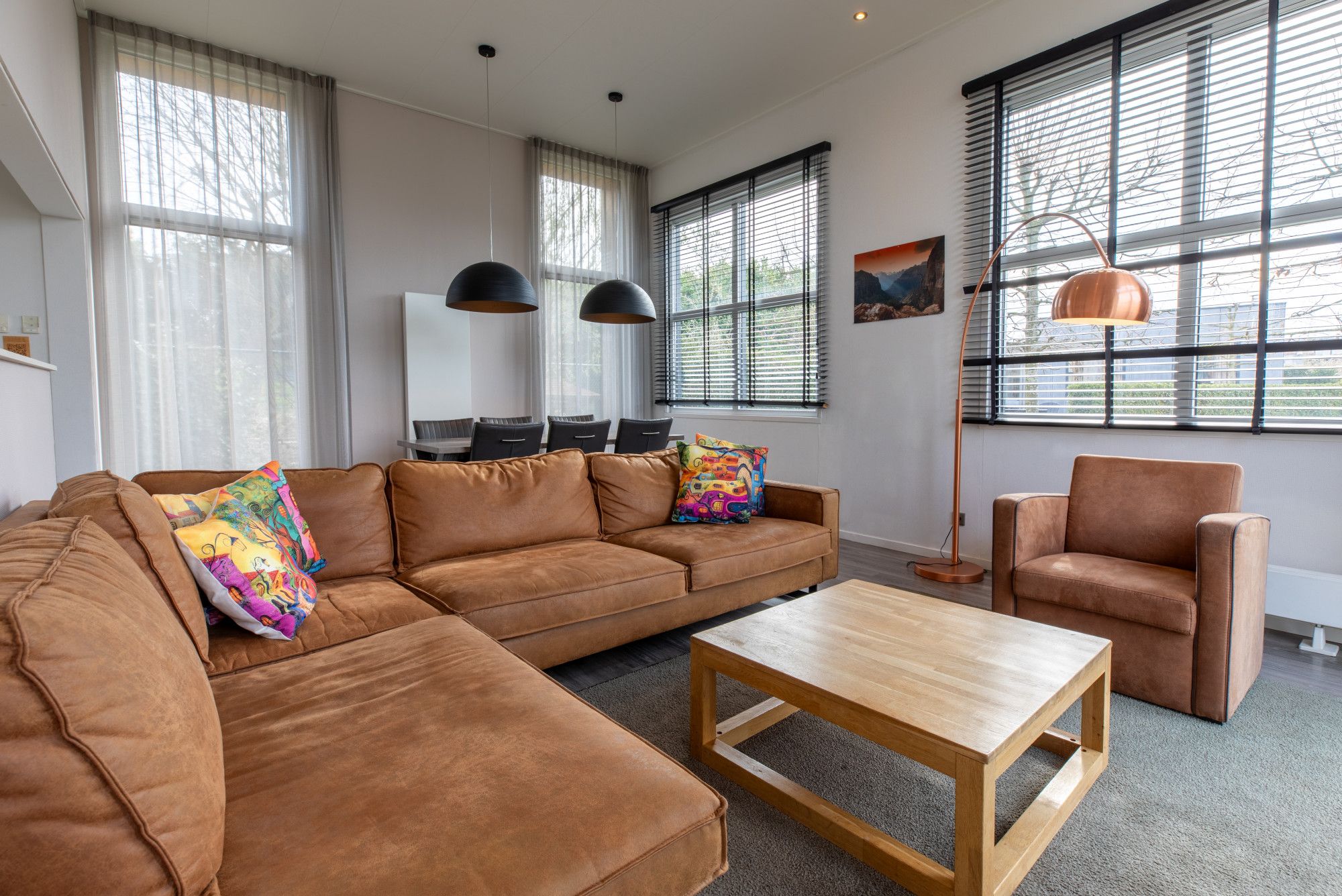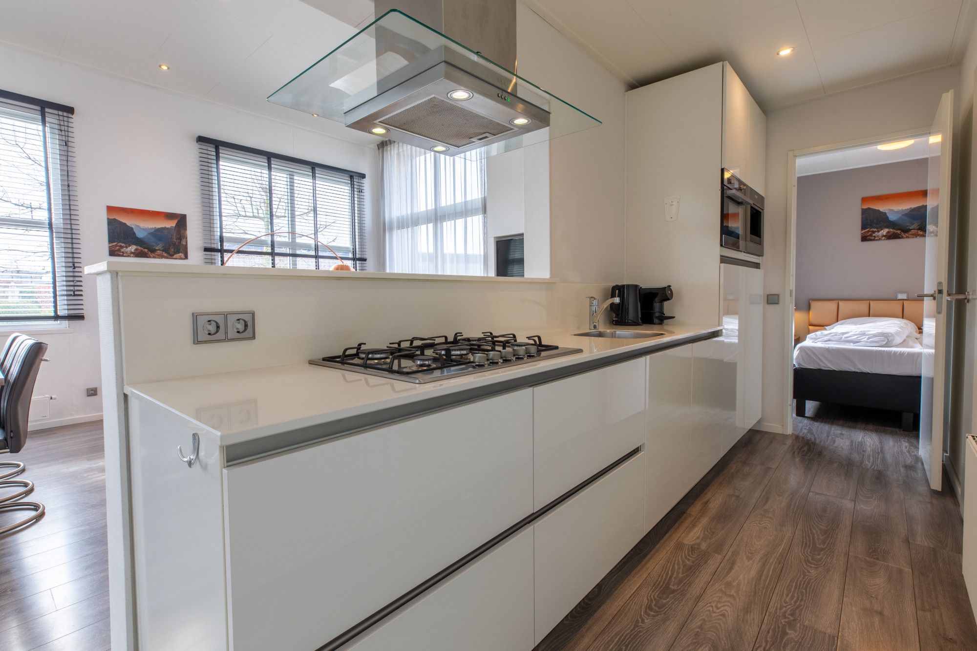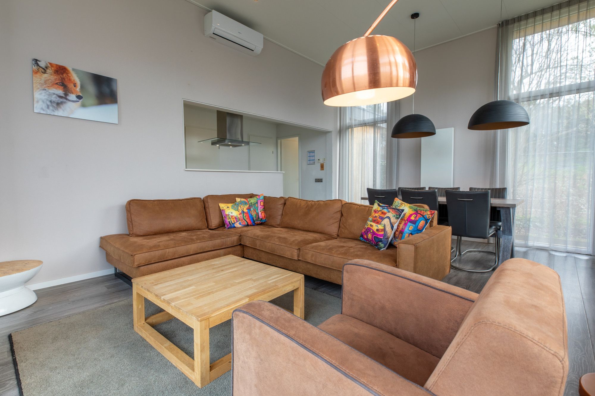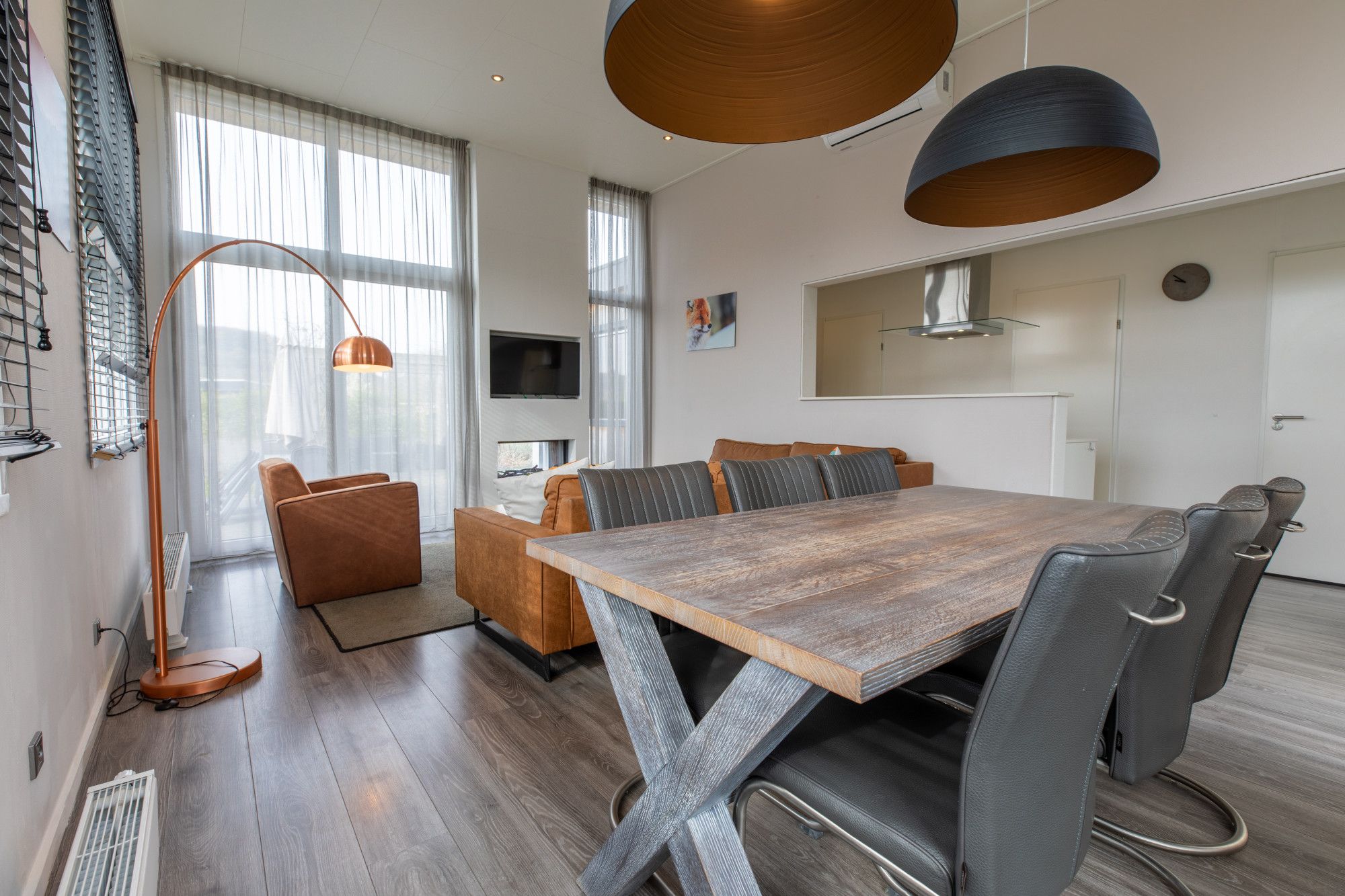 Deze recreatiewoning heeft luxe afwerking en in de woonkamer nog een gashaard, met doorkijk naar het terras en een airconditioning.