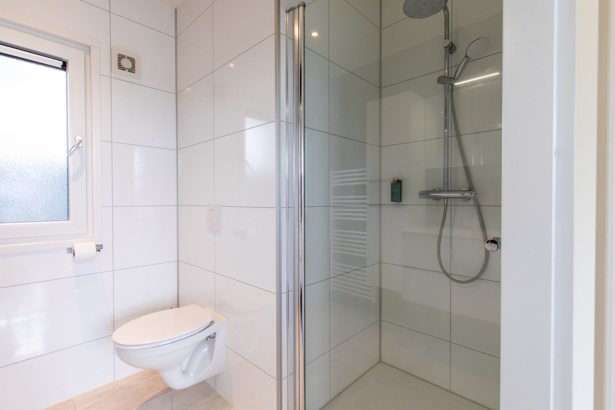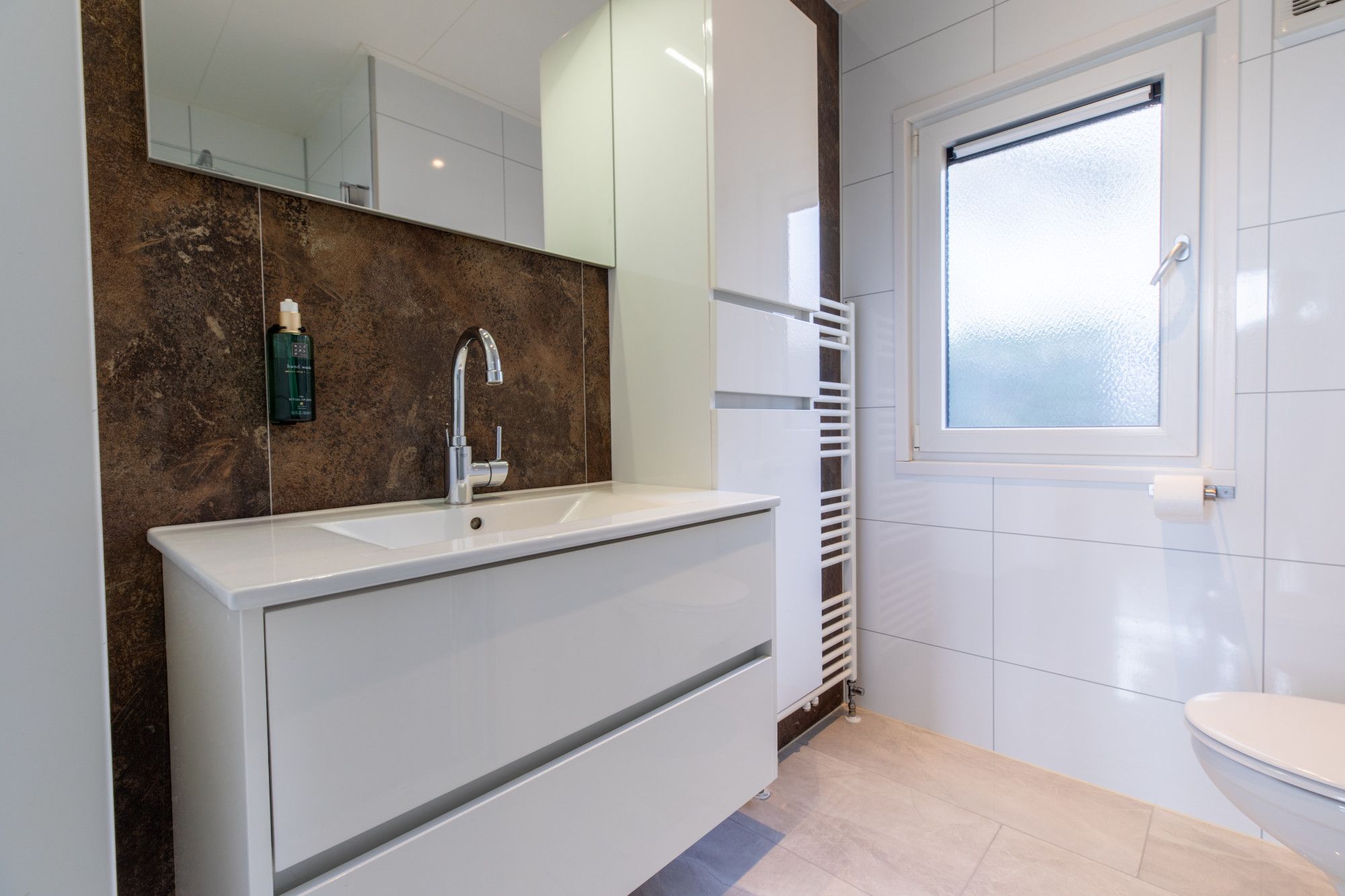 Tussen de twee slaapkamers is de moderne luxe badkamer voorzien van een inloopdouche, een toilet, een badkamermeubel, wastafel met meubel en een designradiator..