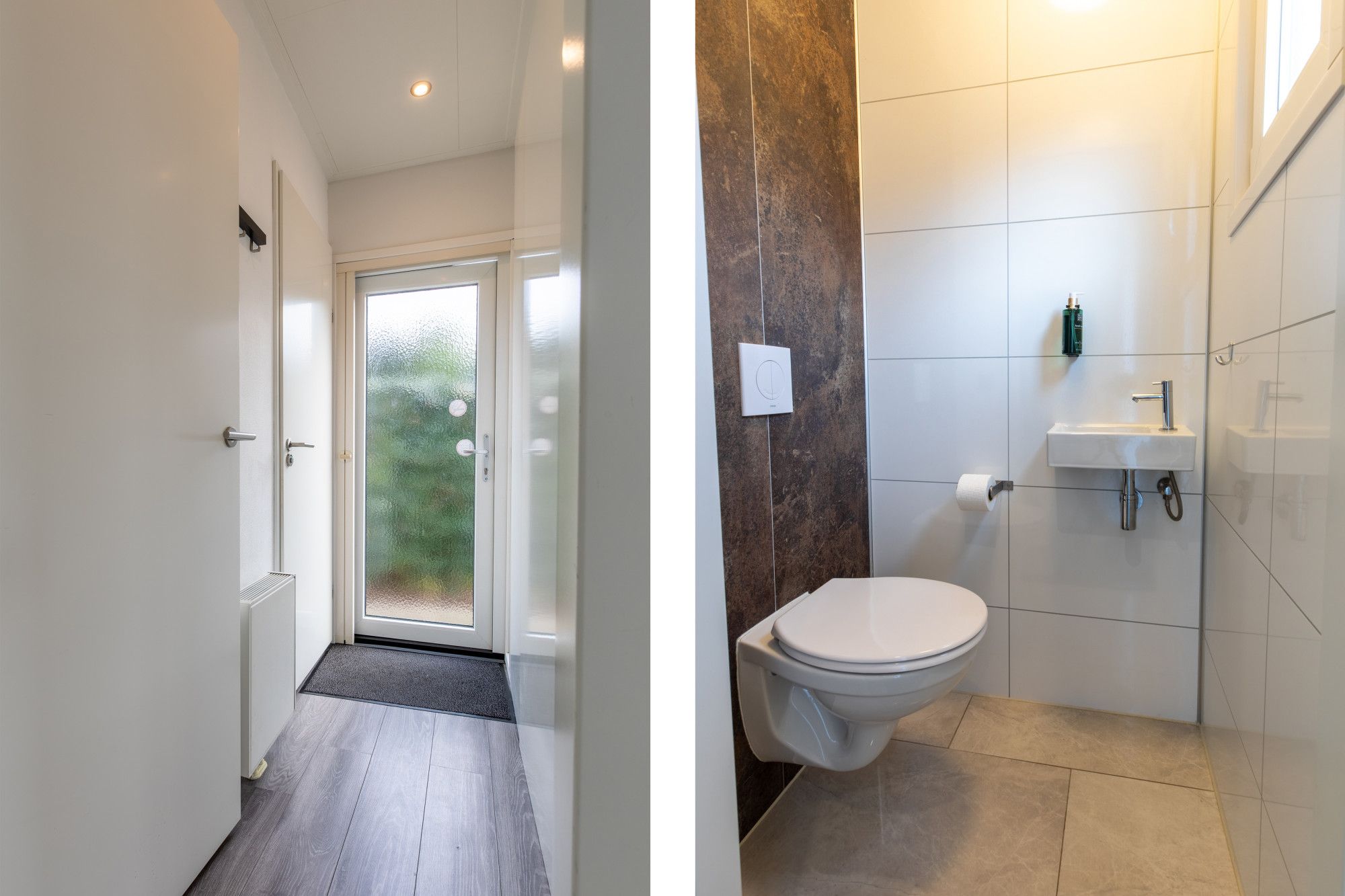 In de hal met mooie hoogglans geblindeerde opbergkasten/gaderobe kom je in de diverse ruimtes. In de hal vinden we aan de rechterzijde gastentoilet, badkamer en twee slaapkamers en derde slaapkamer bevindt zich aan einde van de gang. Deze slaapkamer heeft uitzicht op het terras.