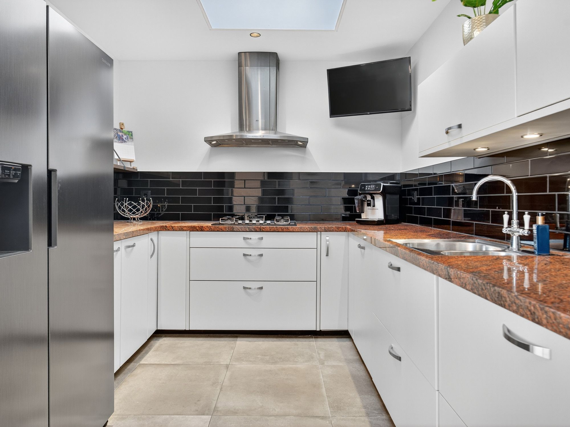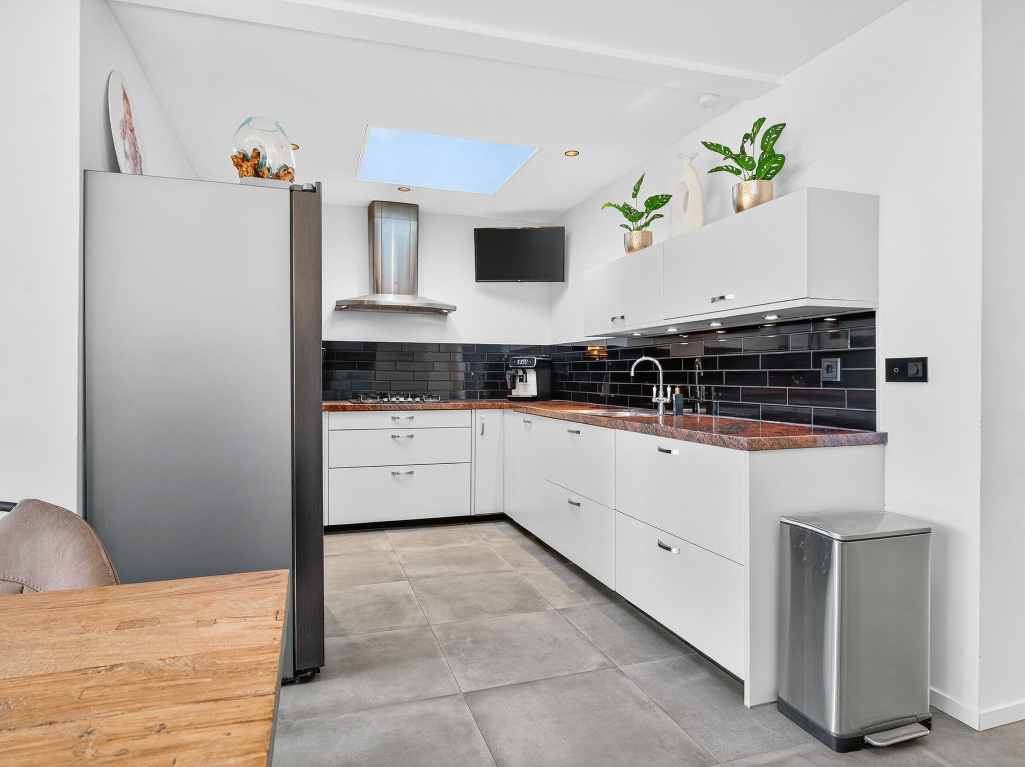 De open keuken beschikt over een granieten werkblad en diverse inbouwapparatuur, waaronder een vaatwasser, twee combiovens, 4-pits gaskookplaat met wokbrander, afzuigkap en koelkast. Dankzij de twee lichtkoepels valt er extra veel daglicht binnen, wat de keuken een fijne, open sfeer geeft.