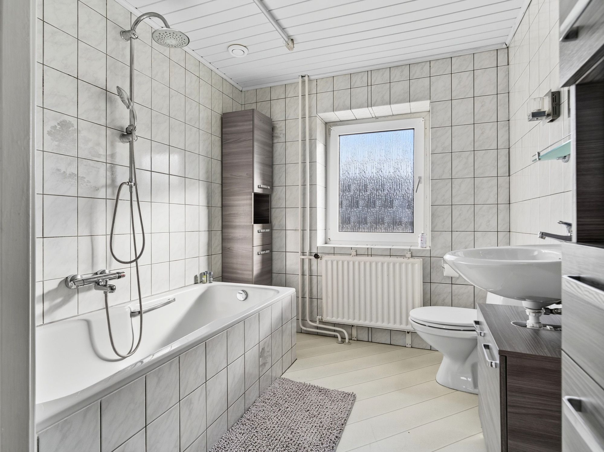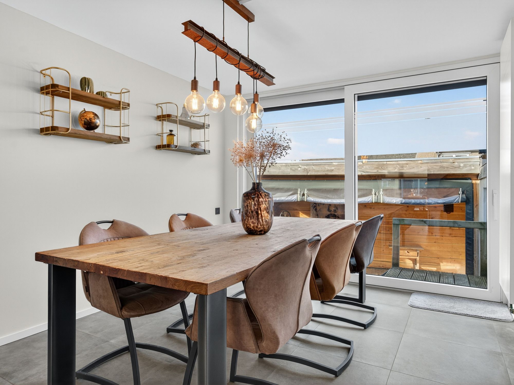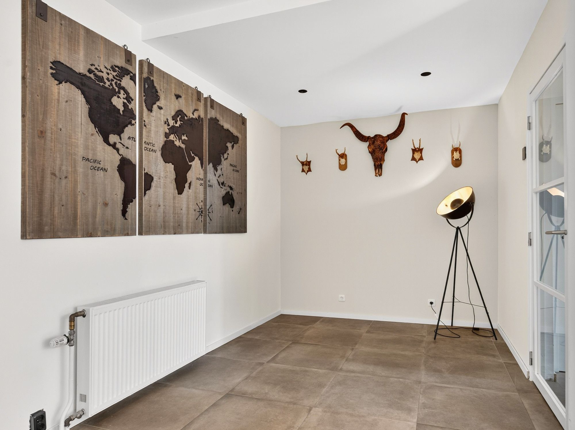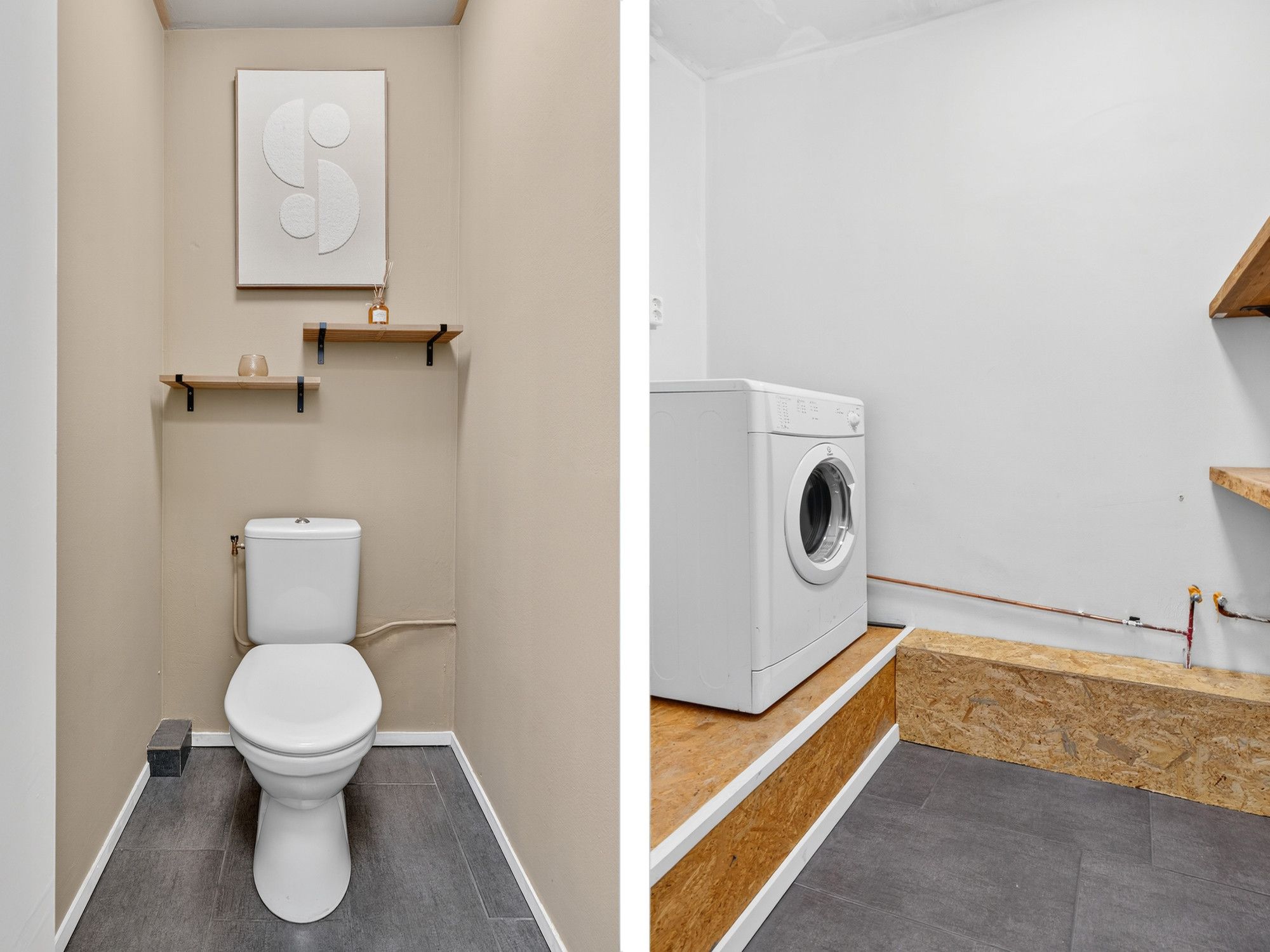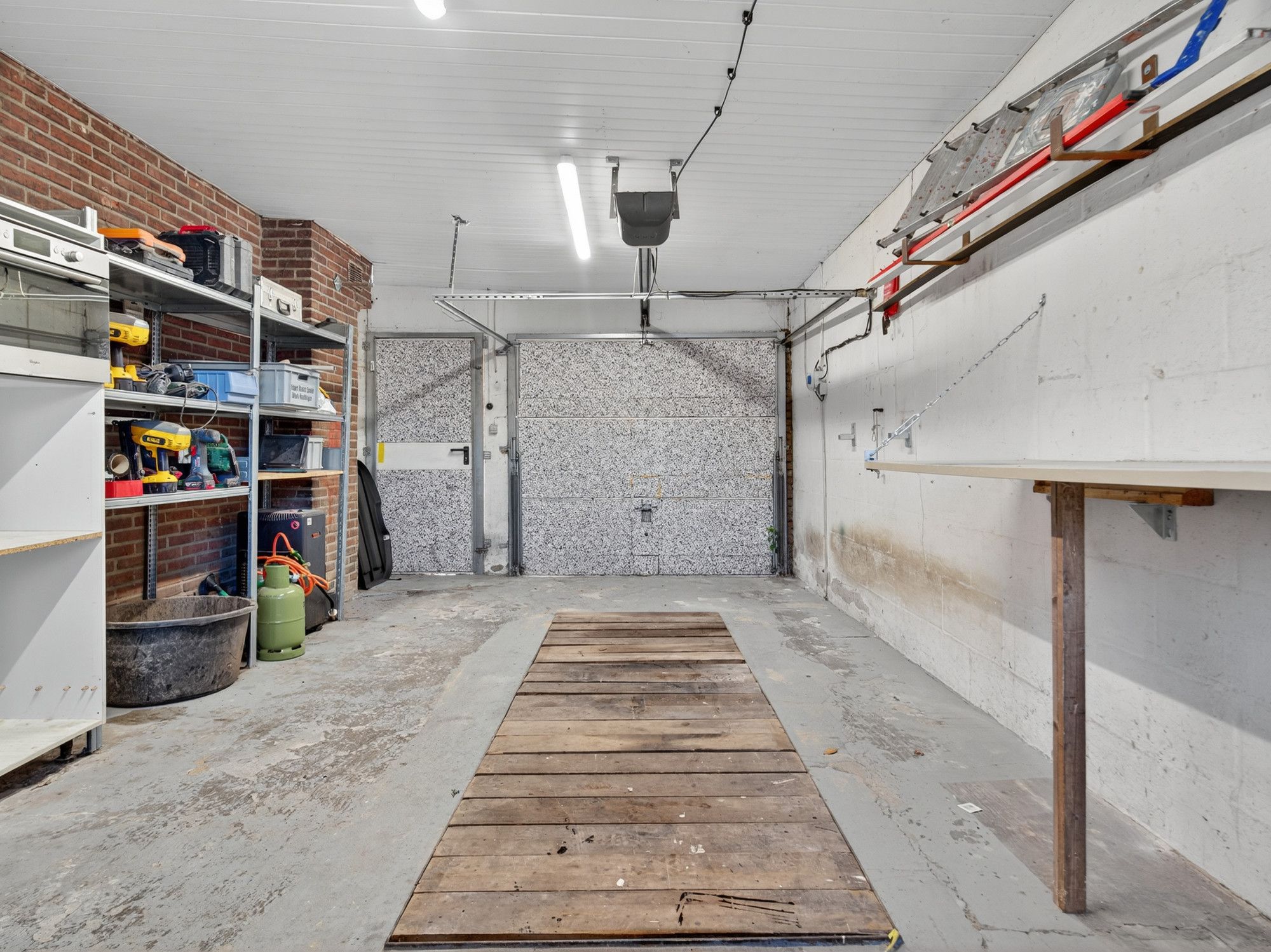 Vanuit de eetkamer heb je toegang tot de garage met kantelpoort, die tevens doorgang biedt naar de tuin en het tussenportaal met separaat toilet en wasruimte voorzien van witgoedaansluiting.