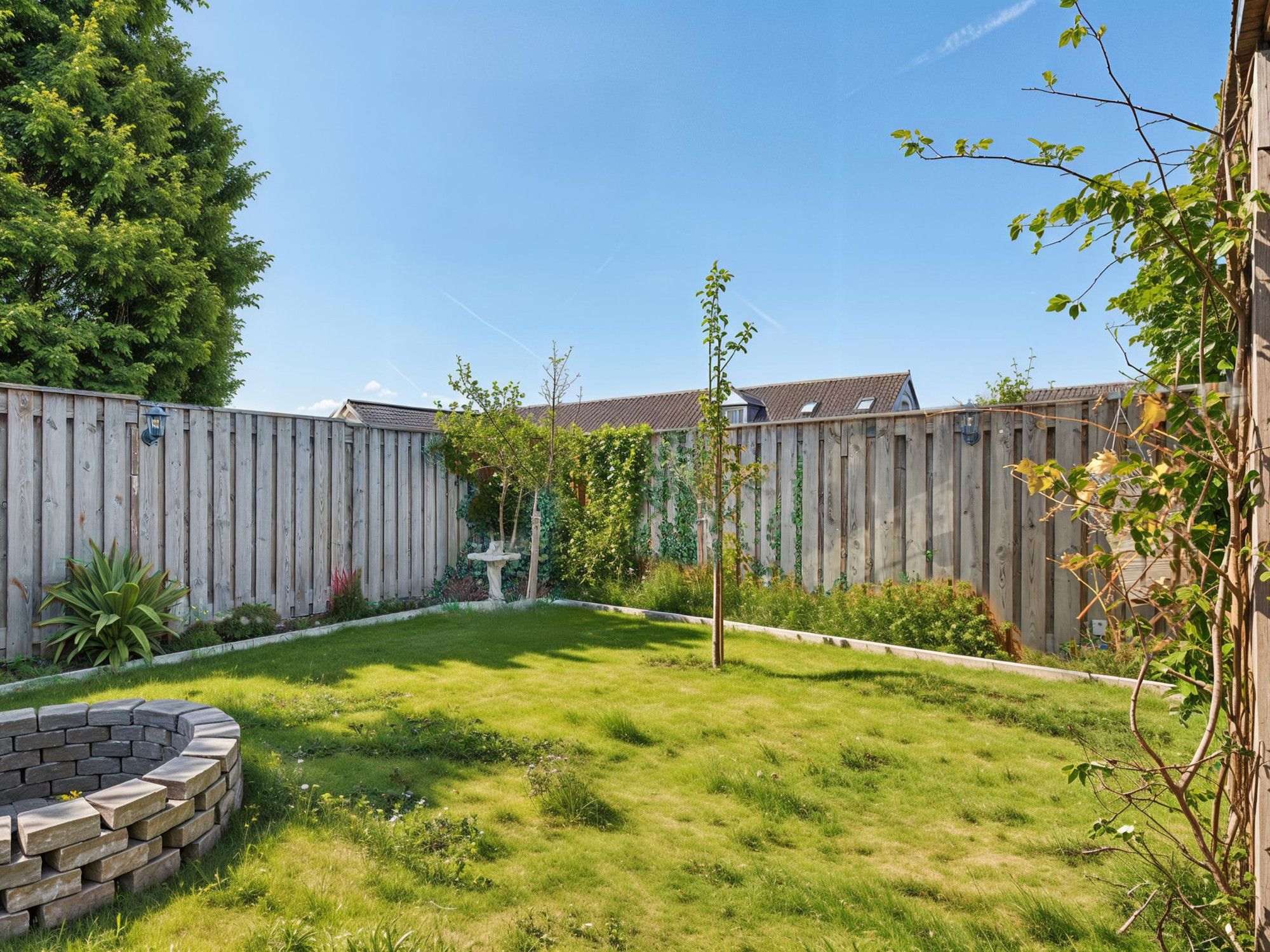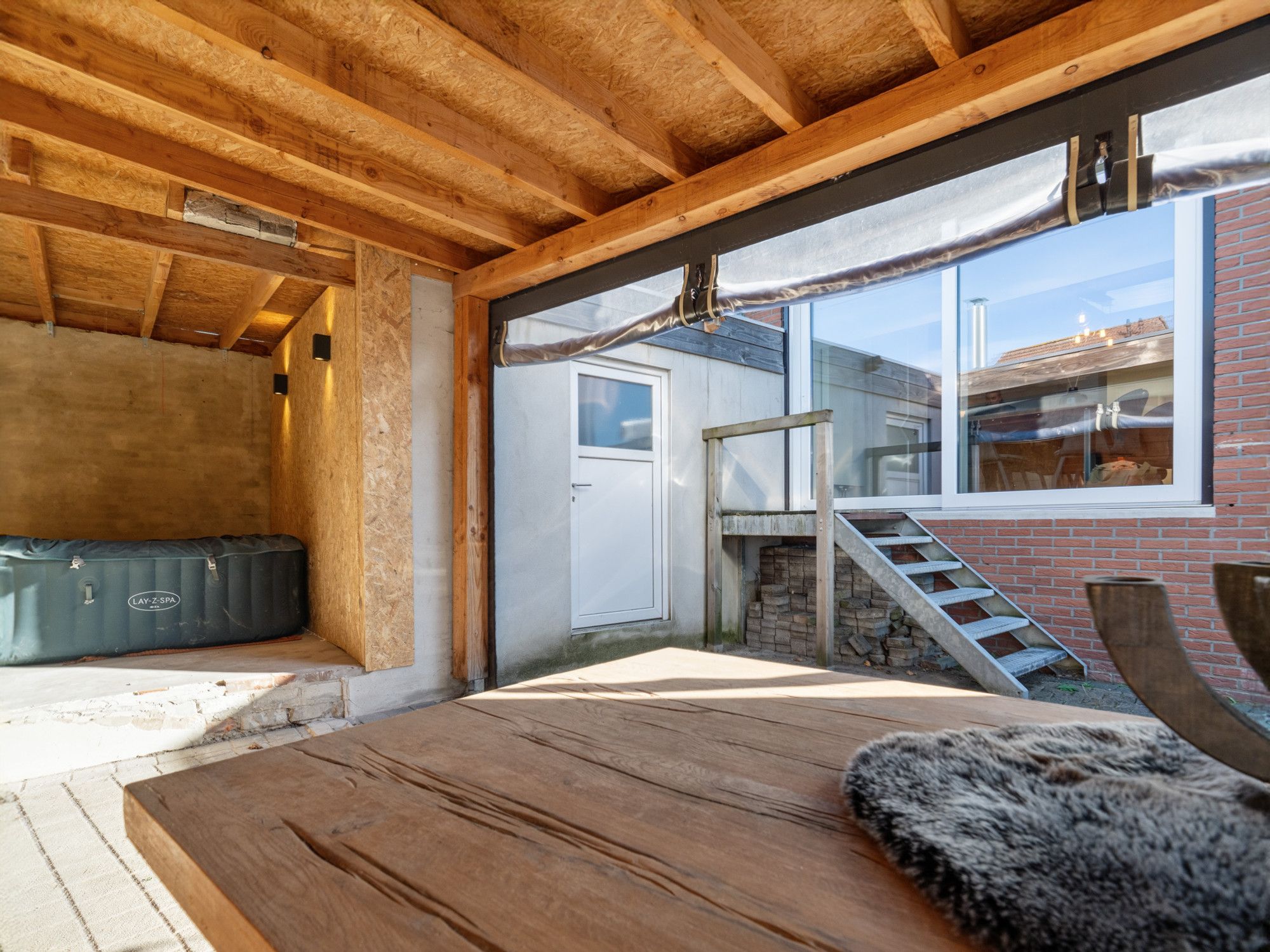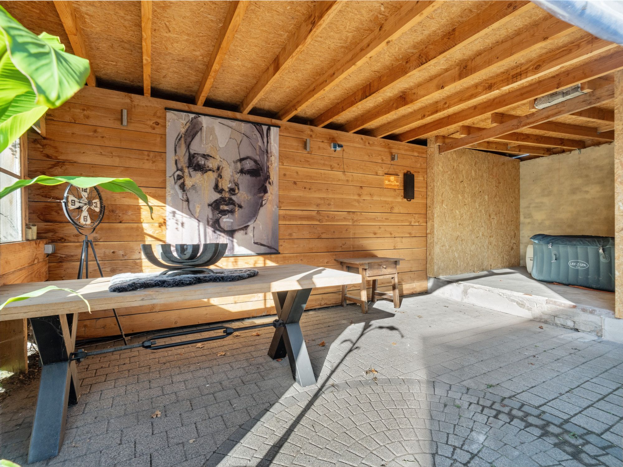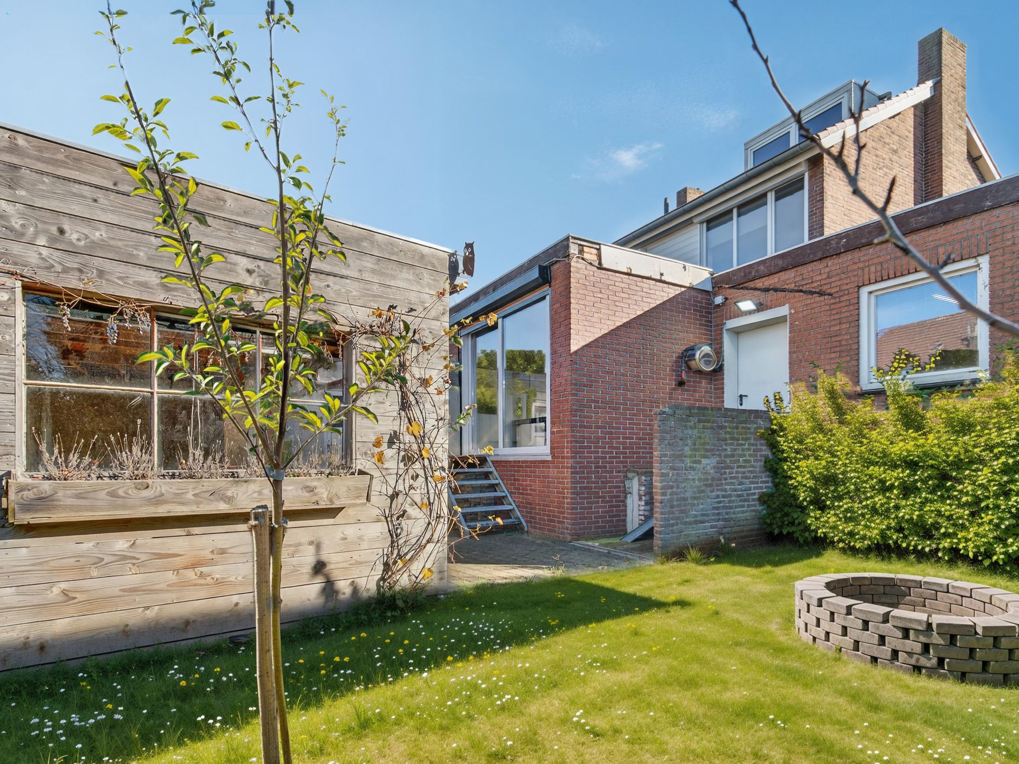 Via de schuifpui bereik je de achtertuin. Na een klein trappetje stap je het lager gelegen terras op. De tuin is deels betegeld en deels groen aangelegd, met een gezellige overkapping (loggia) waar je heerlijk beschut kunt zitten. De tuin is omheind met houten schuttingen, heeft een stenen berging en biedt ook een toegang tot de garage.