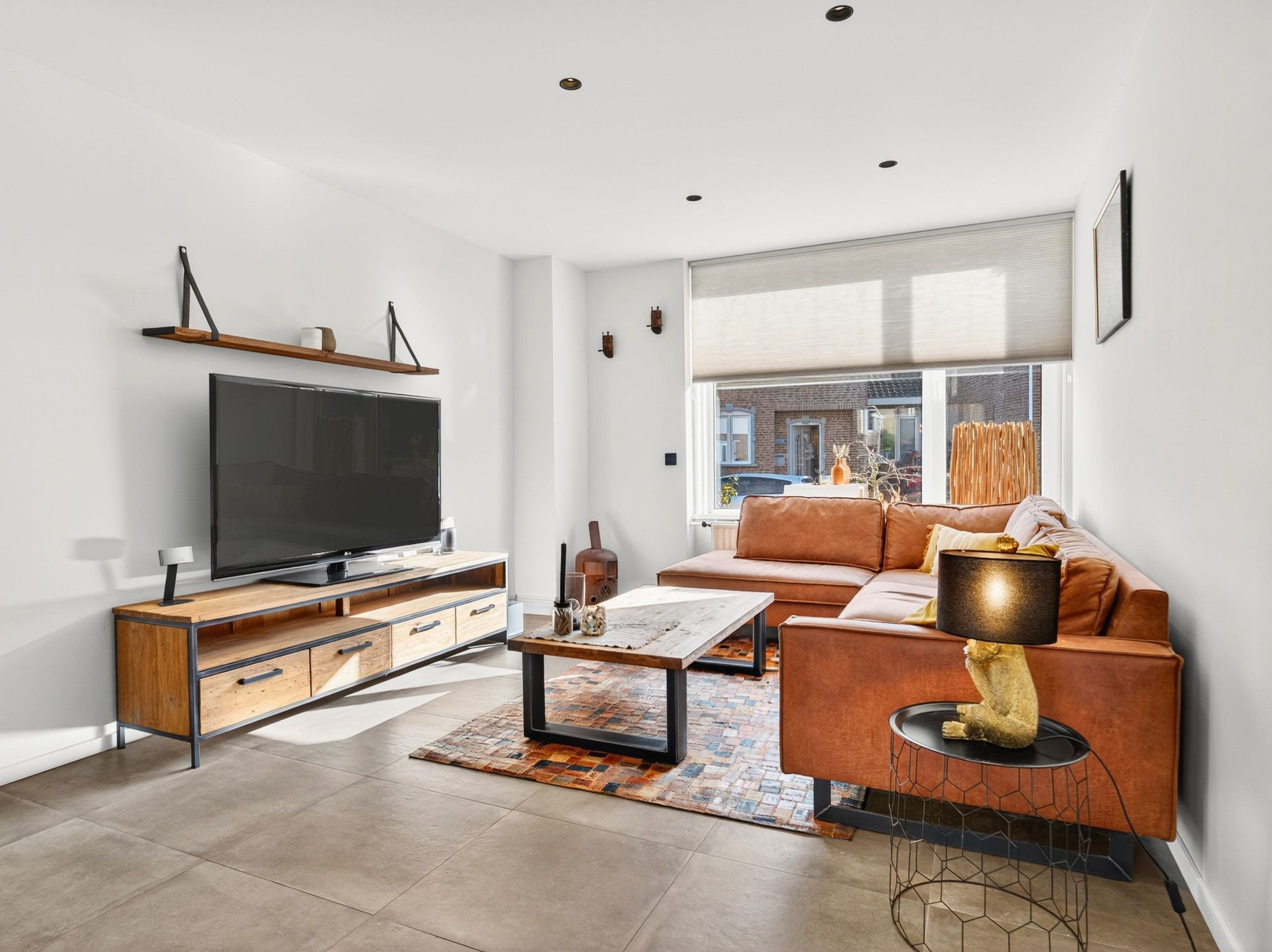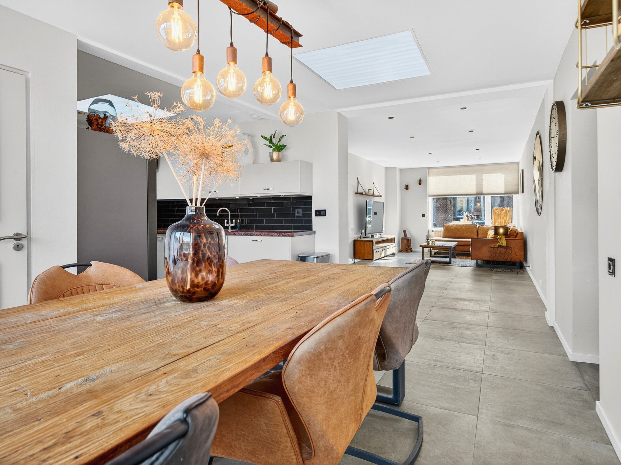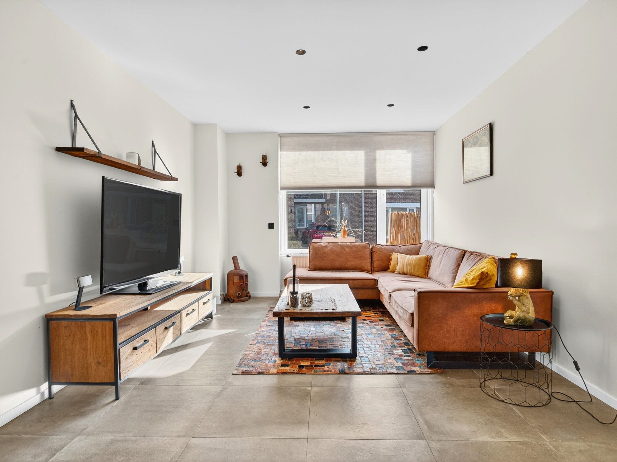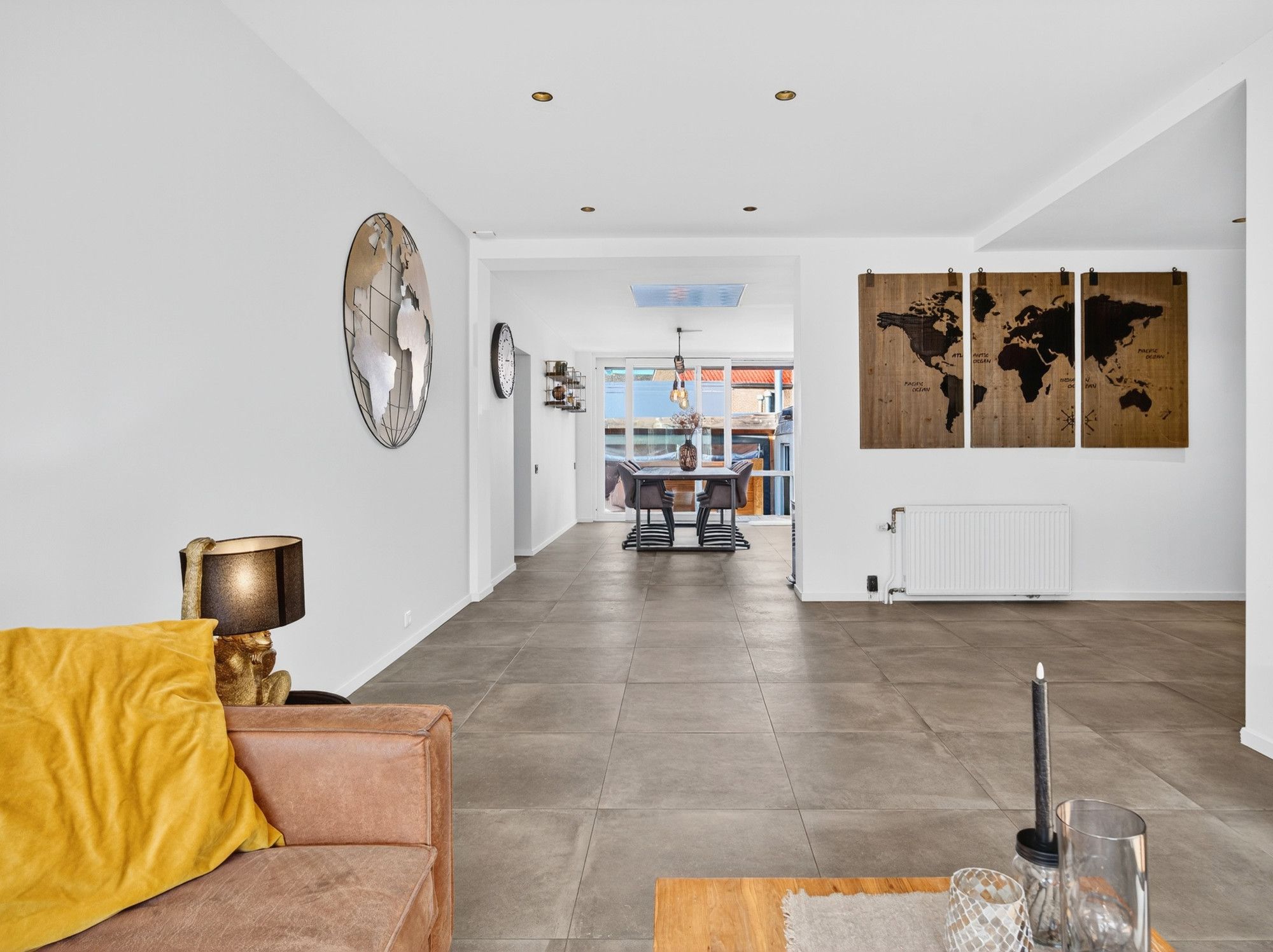 De woonkamer heeft een prettige indeling met een gezellig zitgedeelte aan de voorzijde en een open eetkamer met aansluitend de keuken. Grote ramen zorgen voor veel daglicht, terwijl de fraaie tegelvloer en de designradiator bijdragen aan de verzorgde uitstraling van de ruimte.