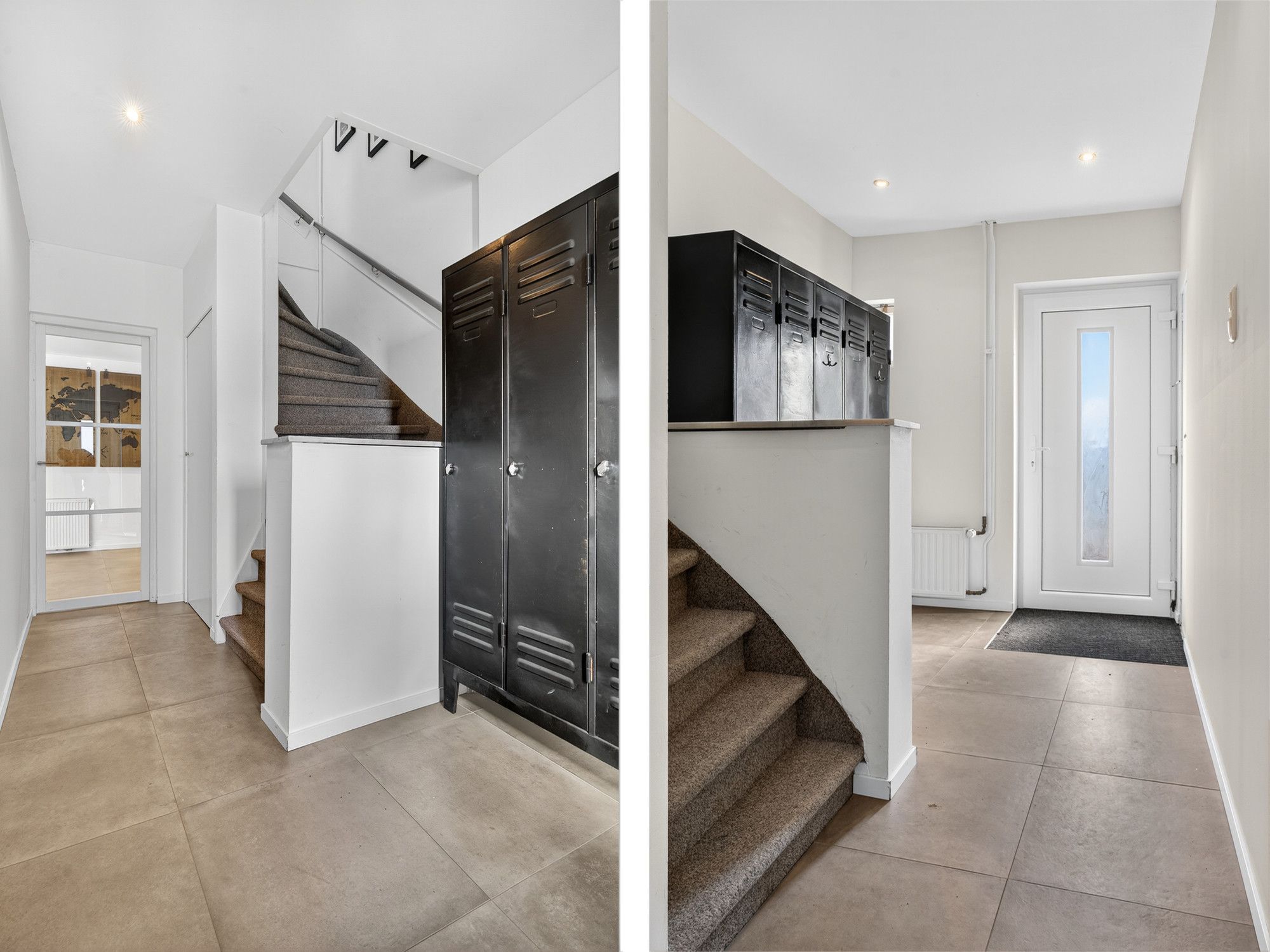 Bij binnenkomst in de hal tref je de meterkast, een berghok, de trapopgang naar de verdieping en toegang tot de woonkamer.