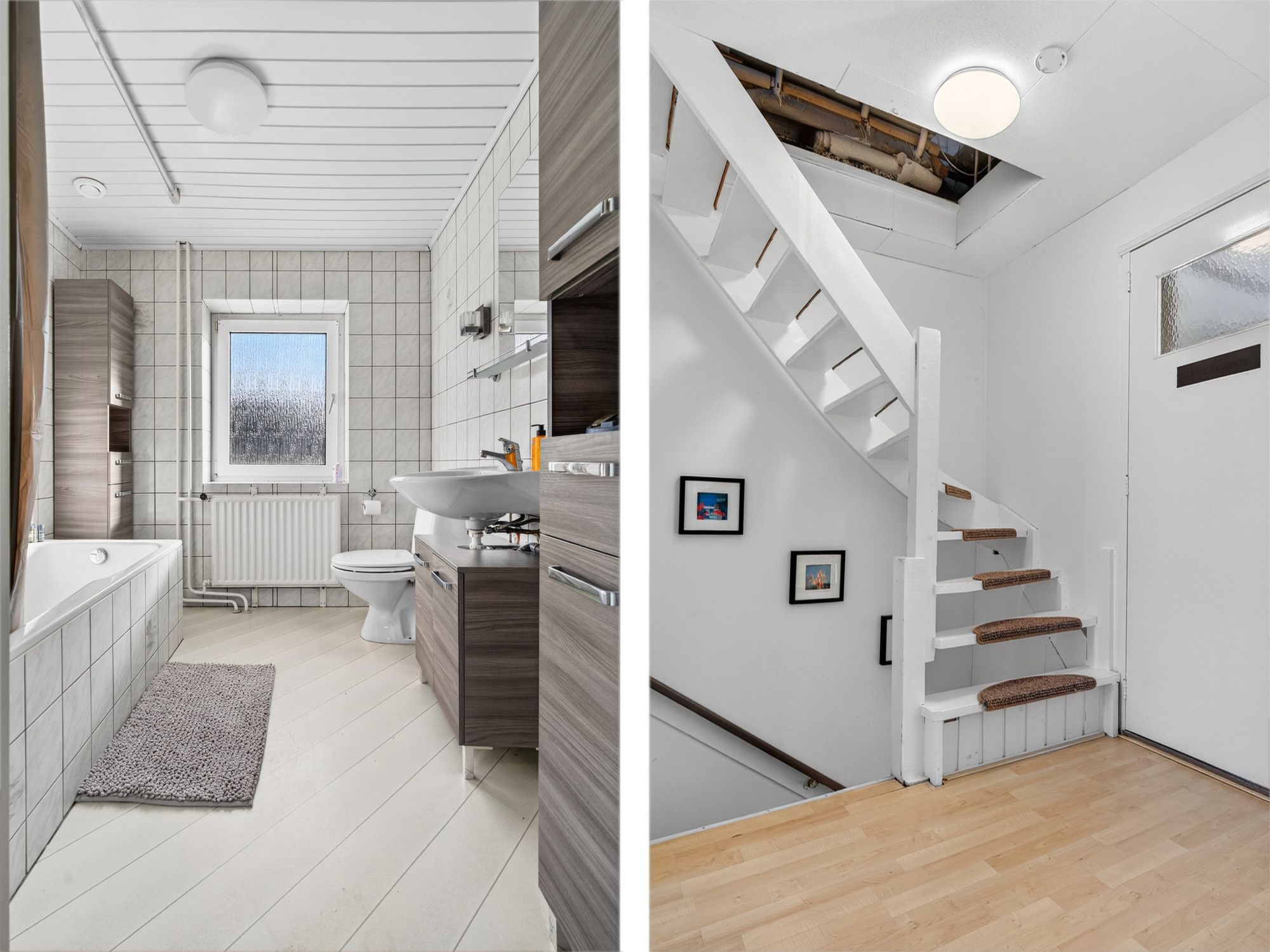 De twee slaapkamers aan de achterzijde zijn voorzien van rolluiken. De badkamer beschikt over een ligbad, tweede toilet en vaste wastafel. Vanaf de overloop is via een vaste trap de zolder bereikbaar.