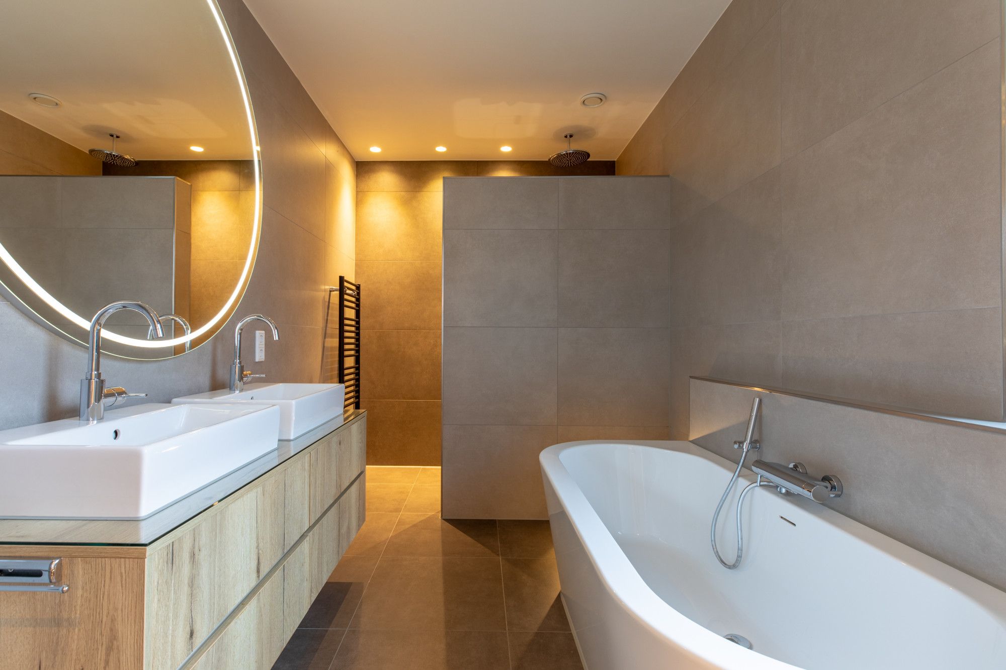 Ruime en luxe afgewerkte badkamer 1 (3.95 x 2.24 m) geheel betegeld met vrijstaand ligbad, riante inloopdouche, dubbele vaste wastafel in badmeubel met zeer grote ronde spiegel en design radiator.