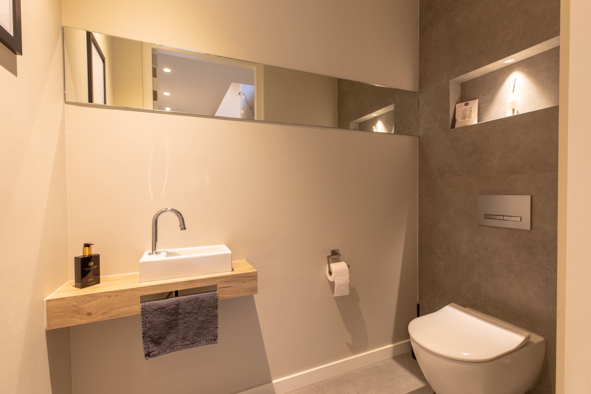 Riante toiletruimte met vrij hangend closet, spiegelwand en fontein.