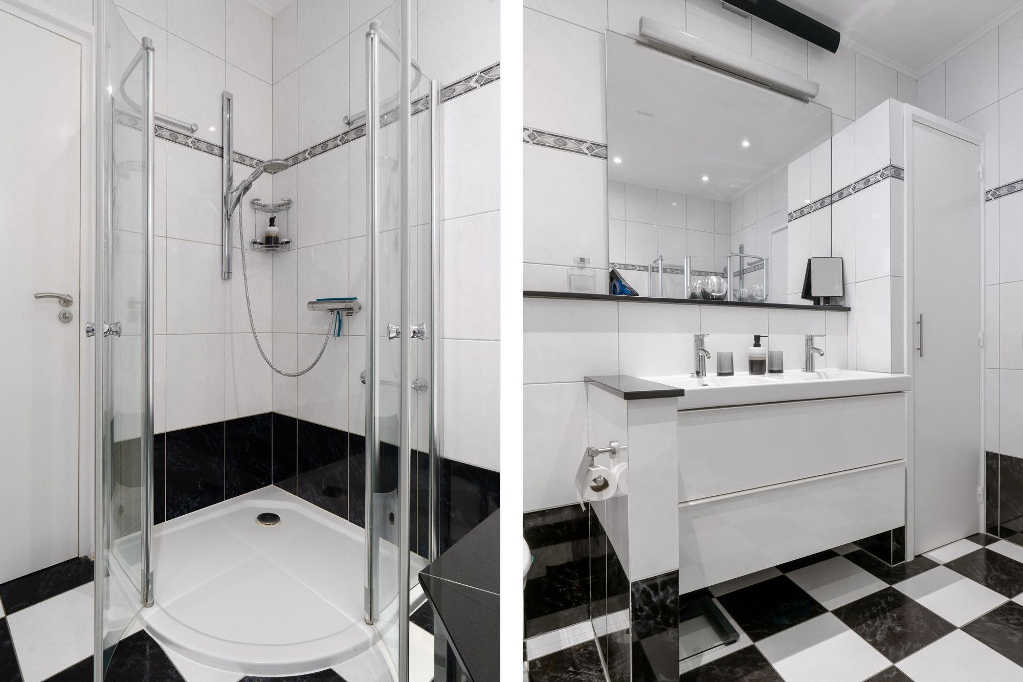 Volledig betegelde badkamer met douche, bubbelbad, zwevend toilet en praktische muurkast.