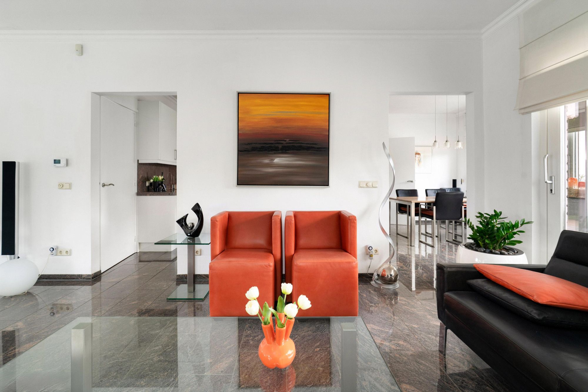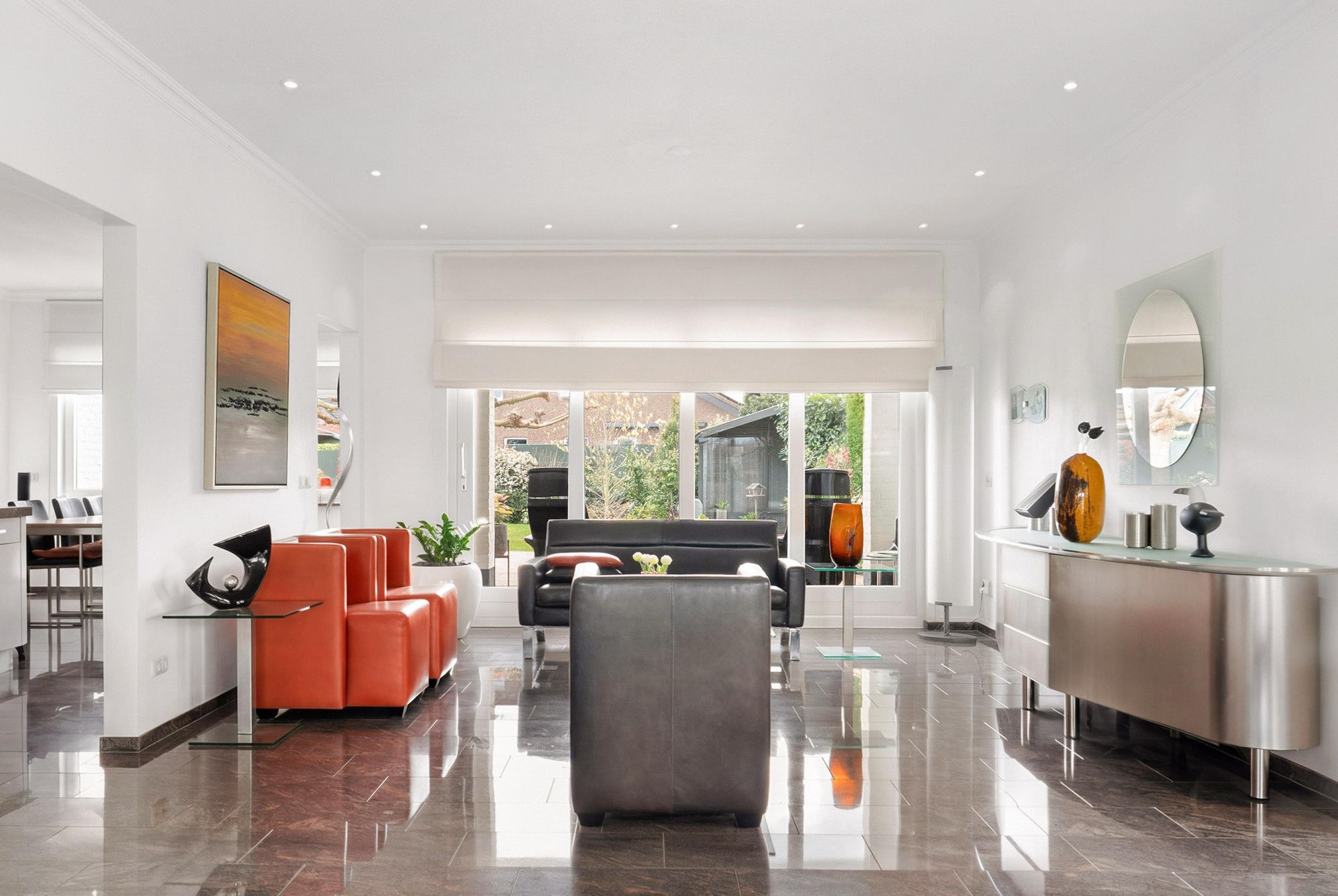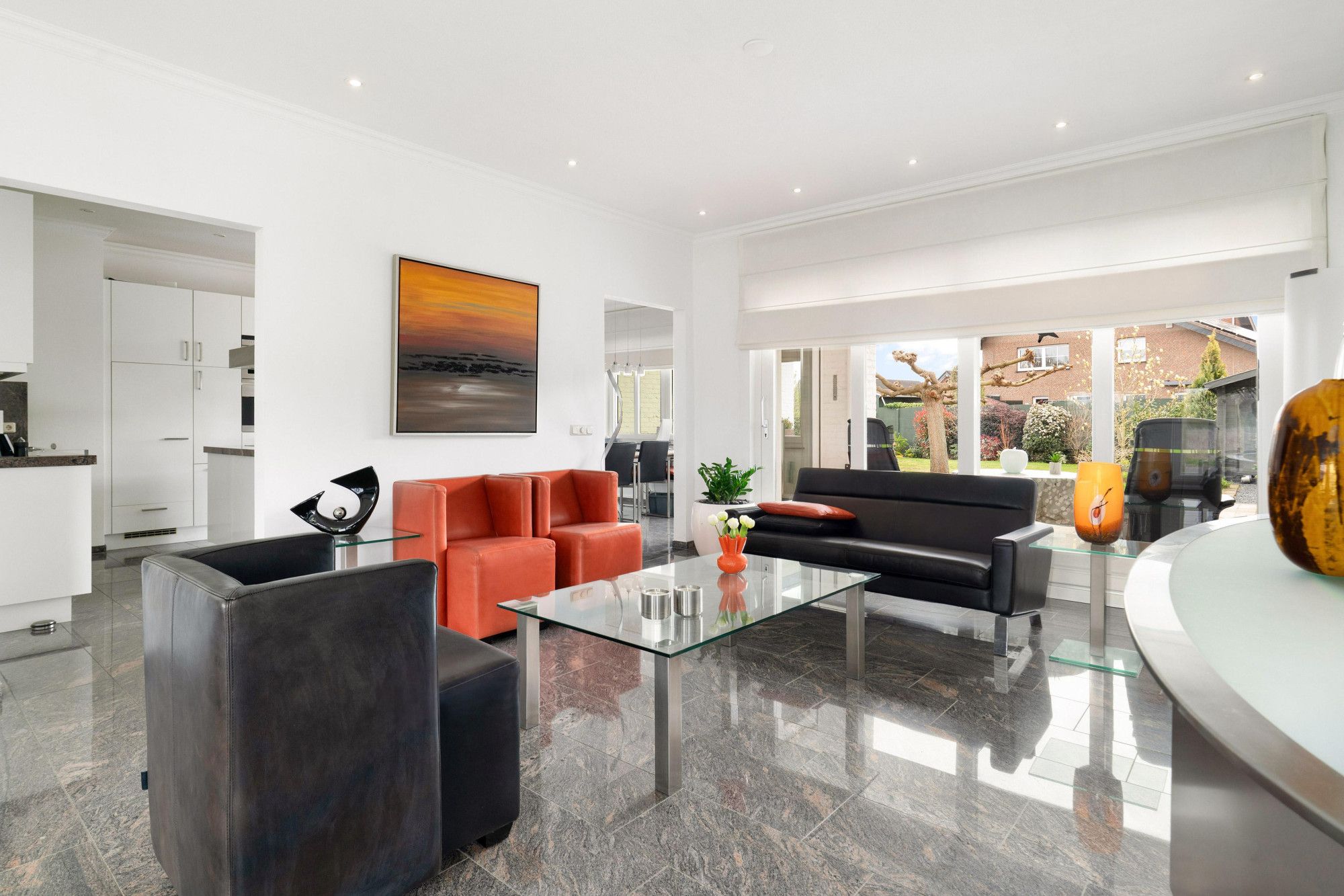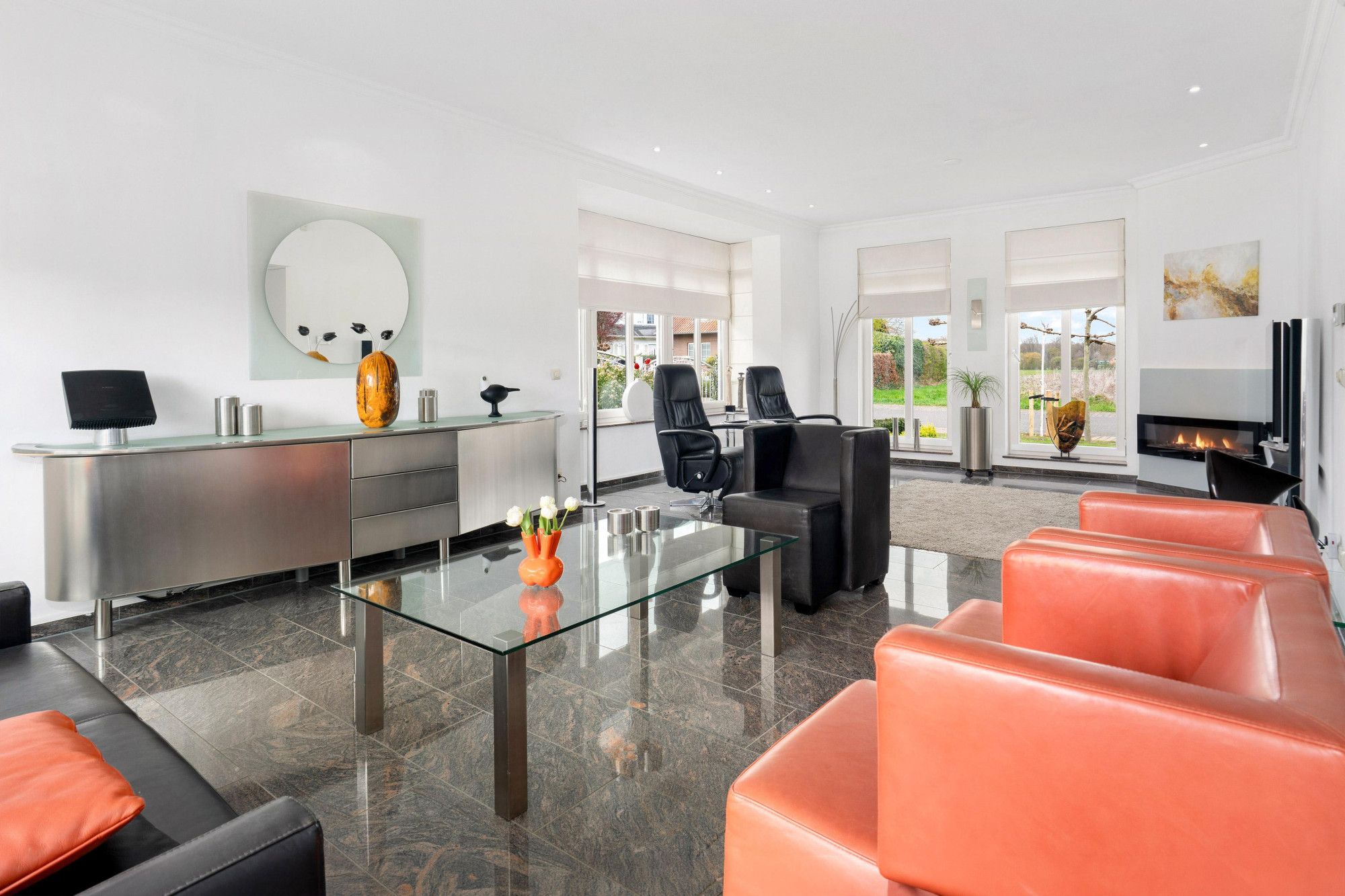 Prachtige lichte leefruimte met marmeren vloer, sfeervolle open haard en grote raampartijen rondom waardoor het daglicht rijkelijk naar binnen valt.
