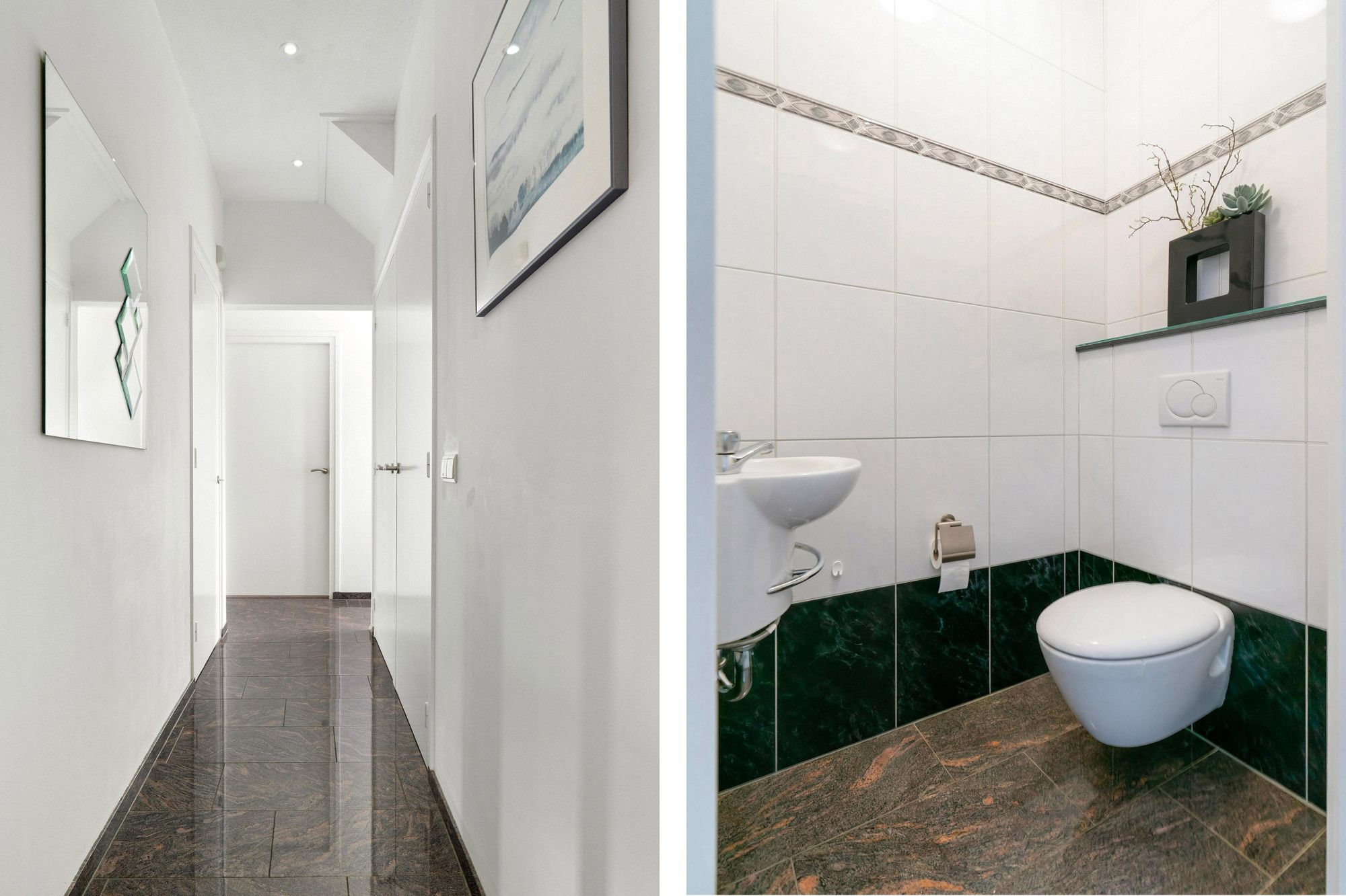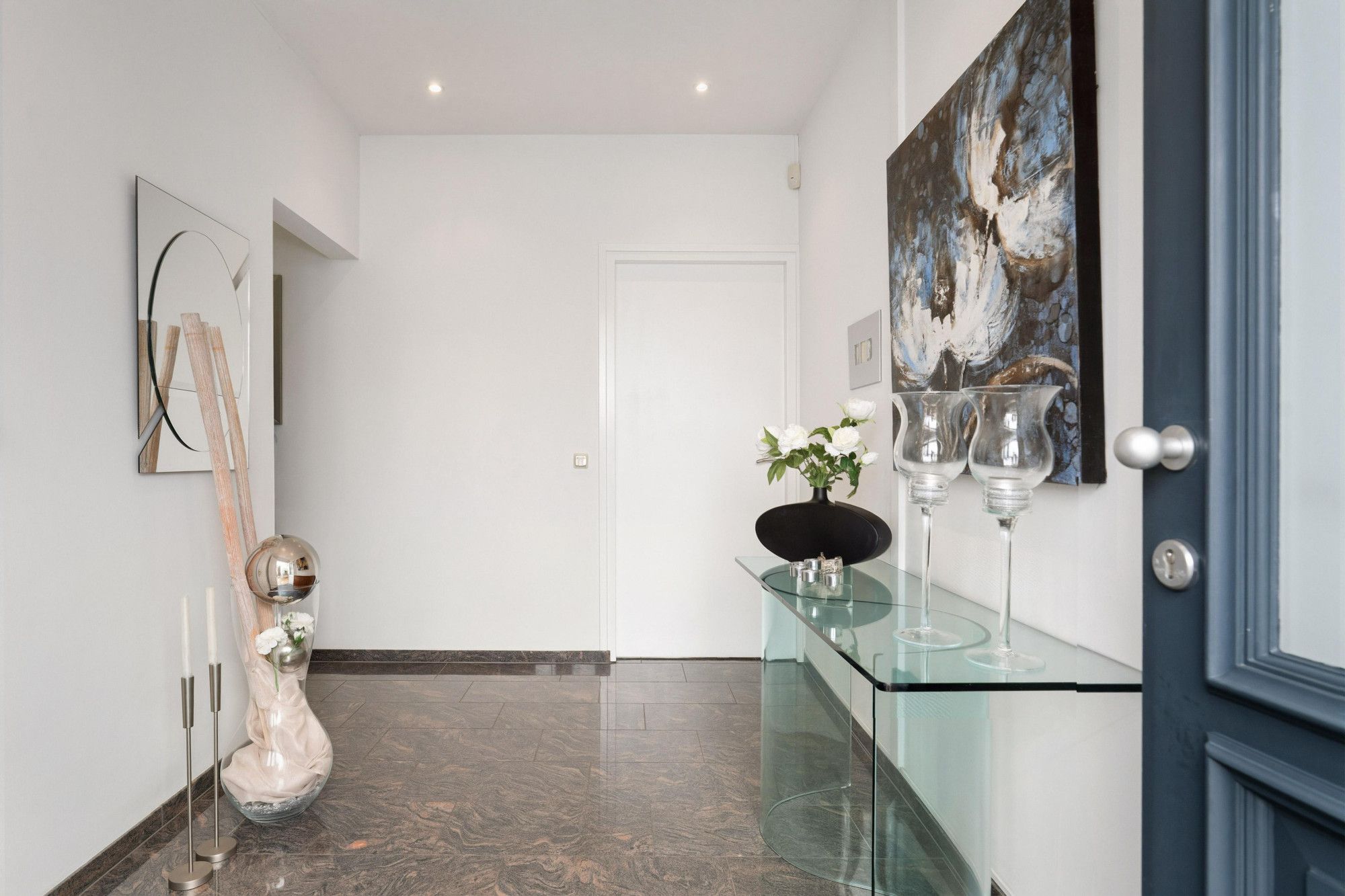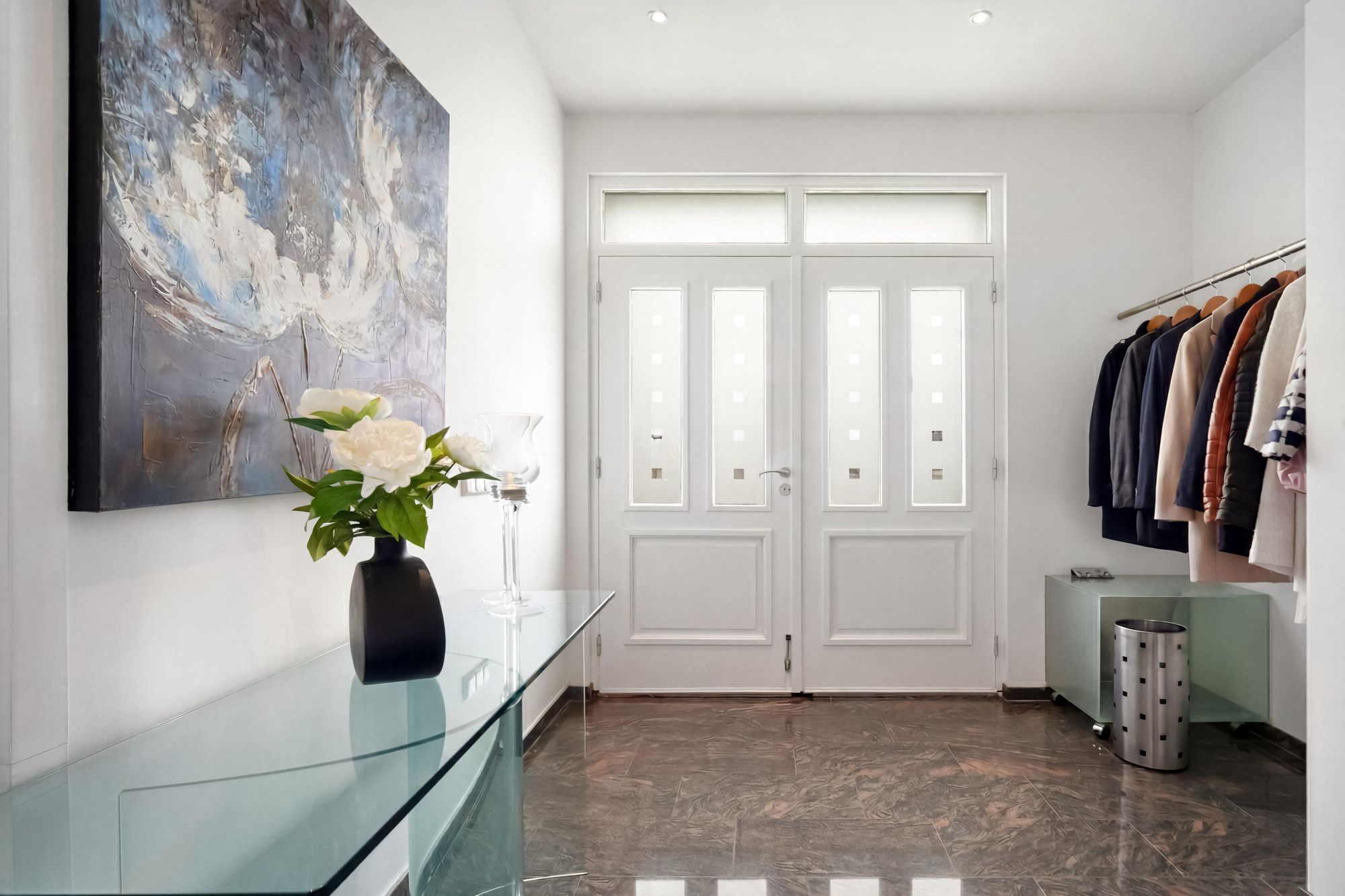 Representatieve hal met marmeren vloer, garderobe, uitgebreide meterkast, toilet en praktische muurkast.