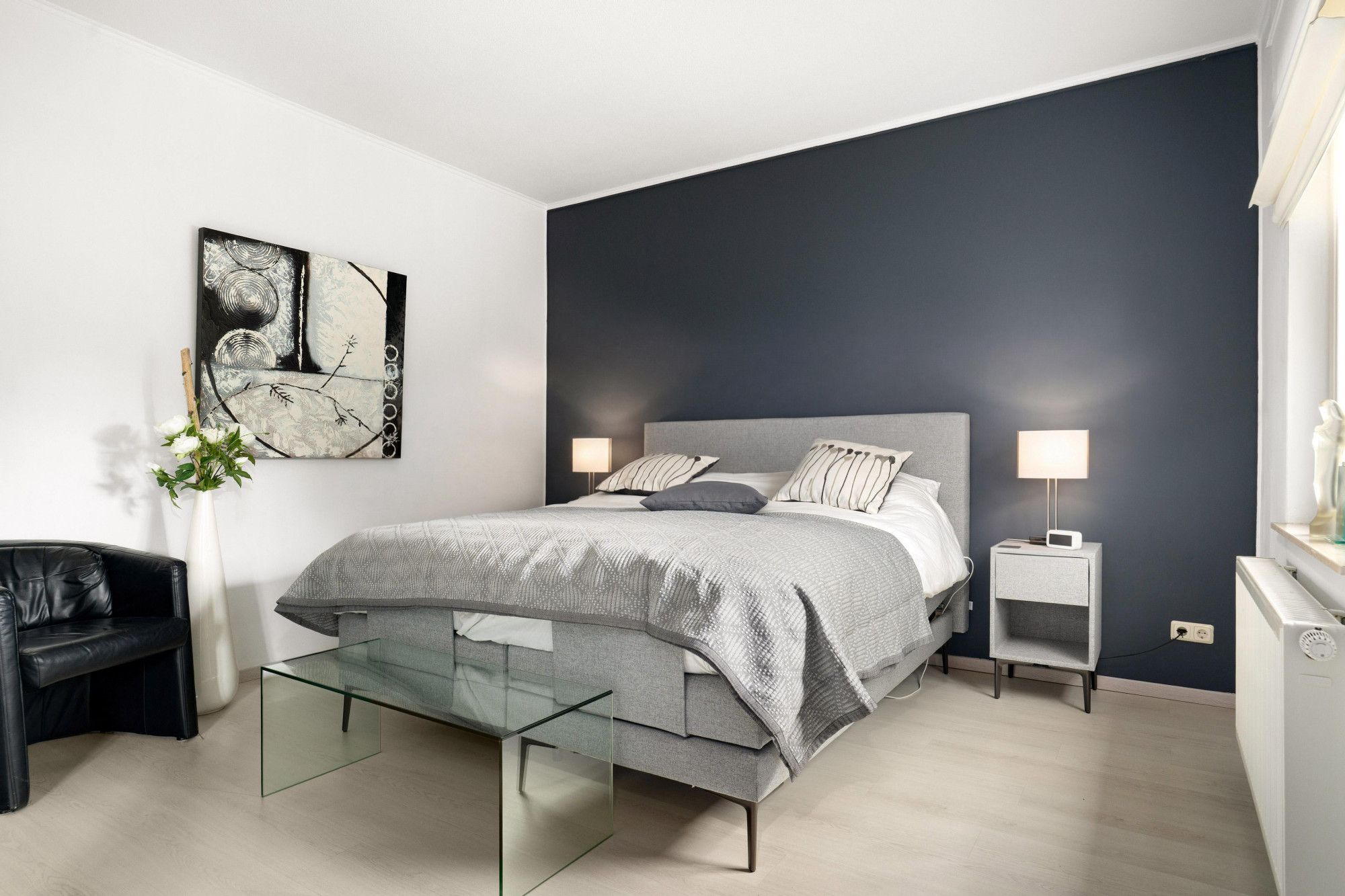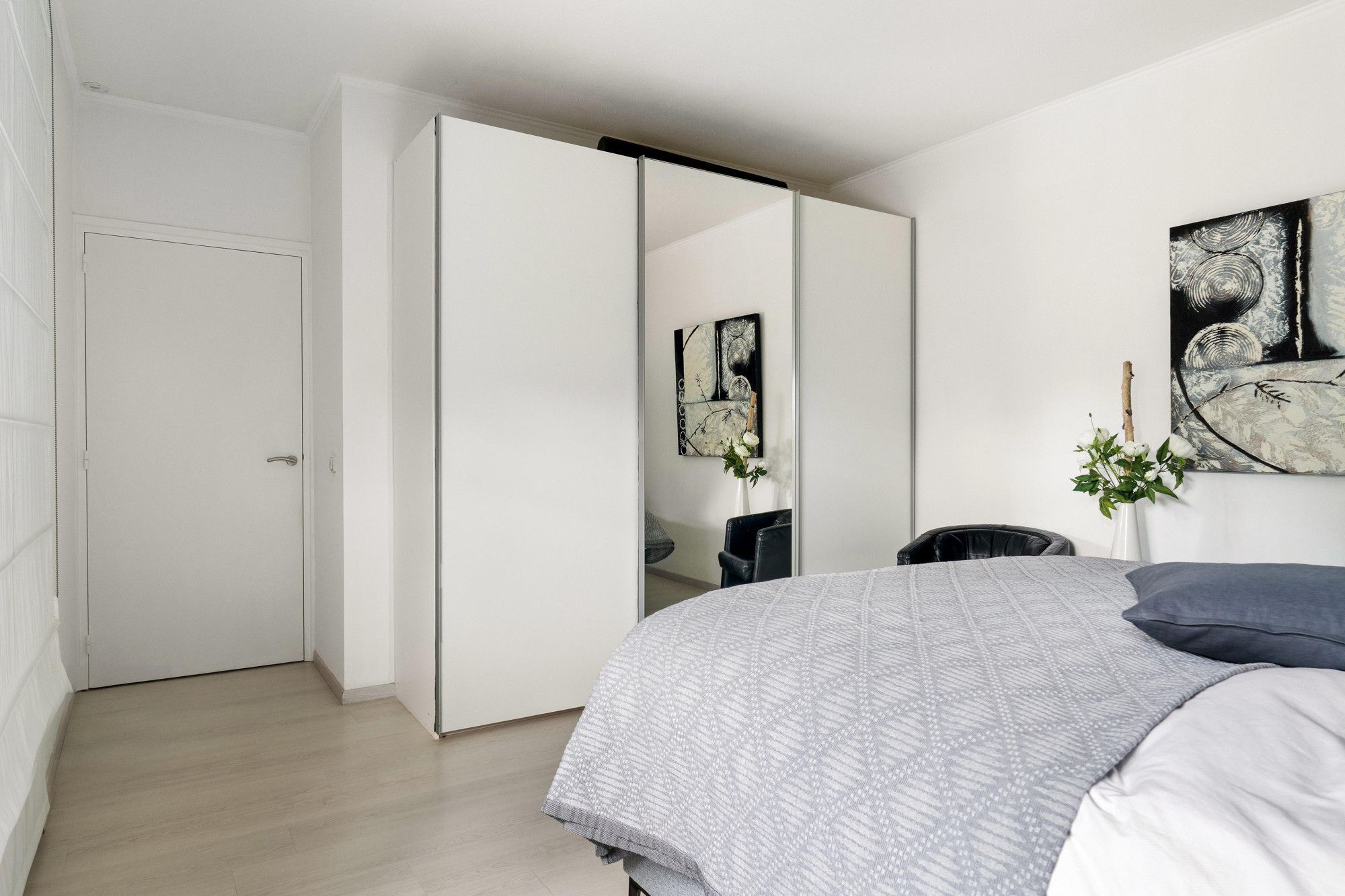 Ruime slaapkamer met laminaatvloer en directe toegang tot het terras en de tuin.
