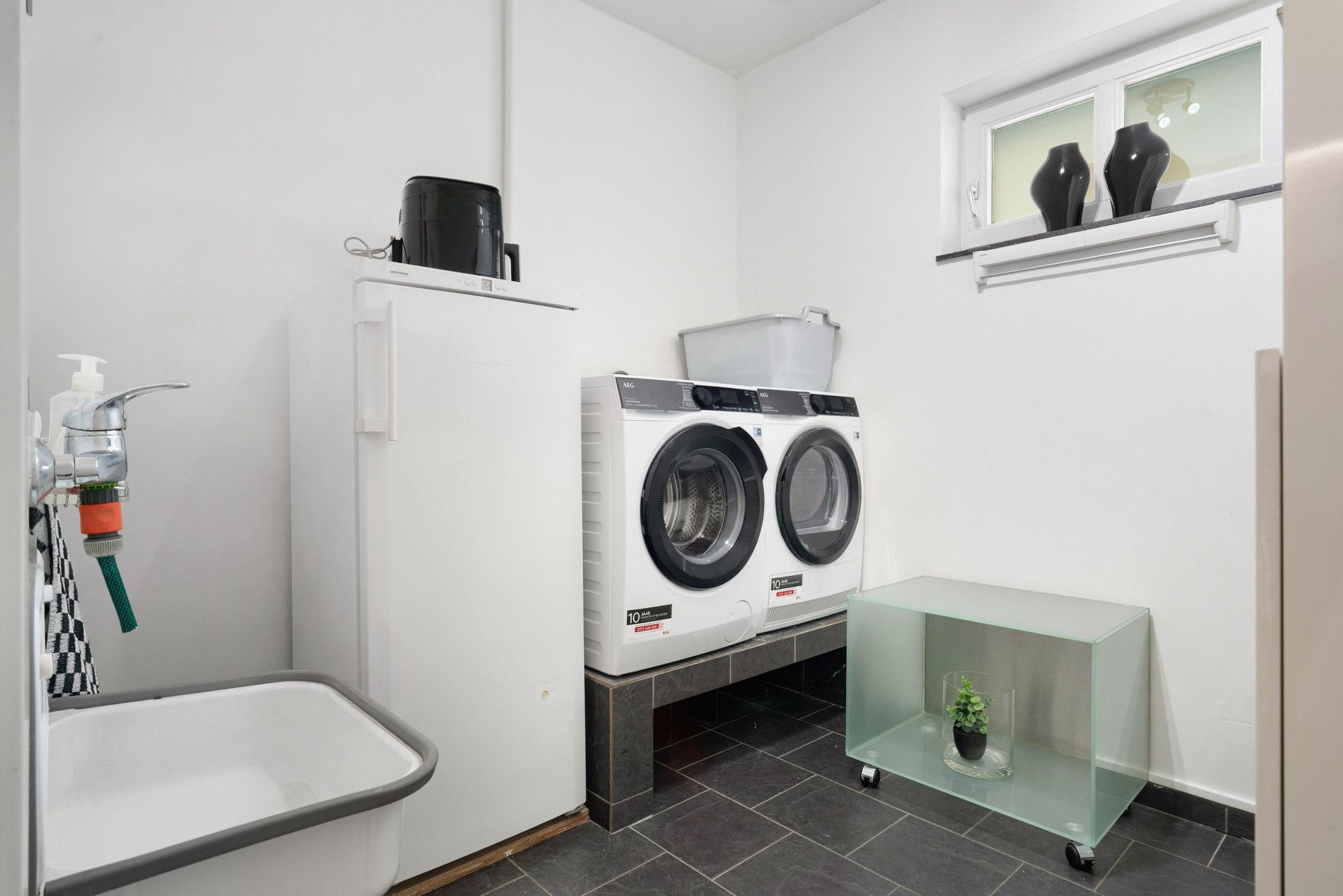 Betegelde bijkeuken met aansluitingen voor wasmachine en droger en extra aanrecht.
