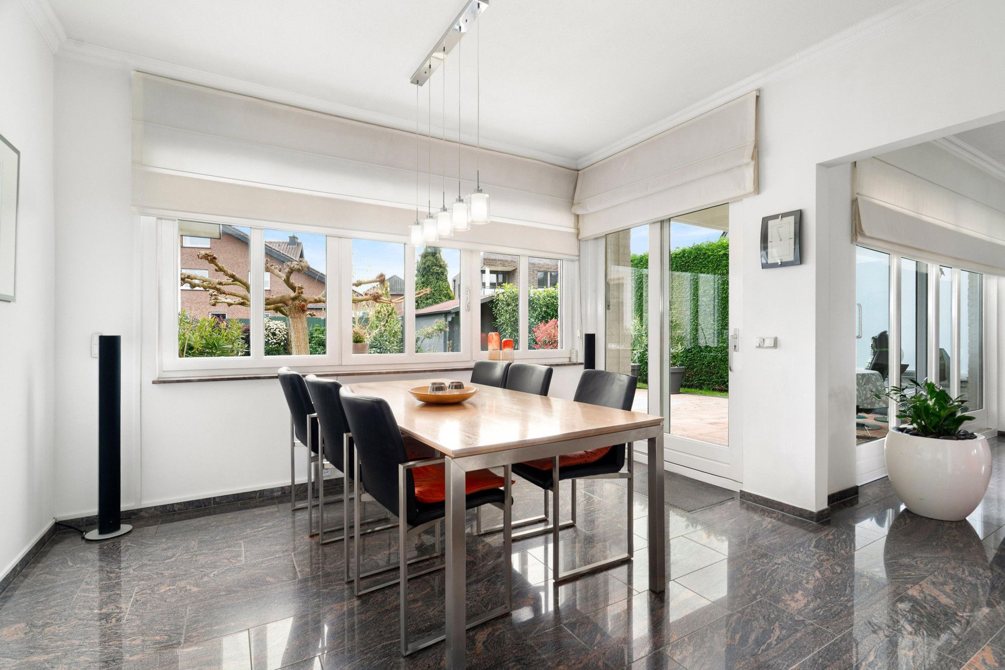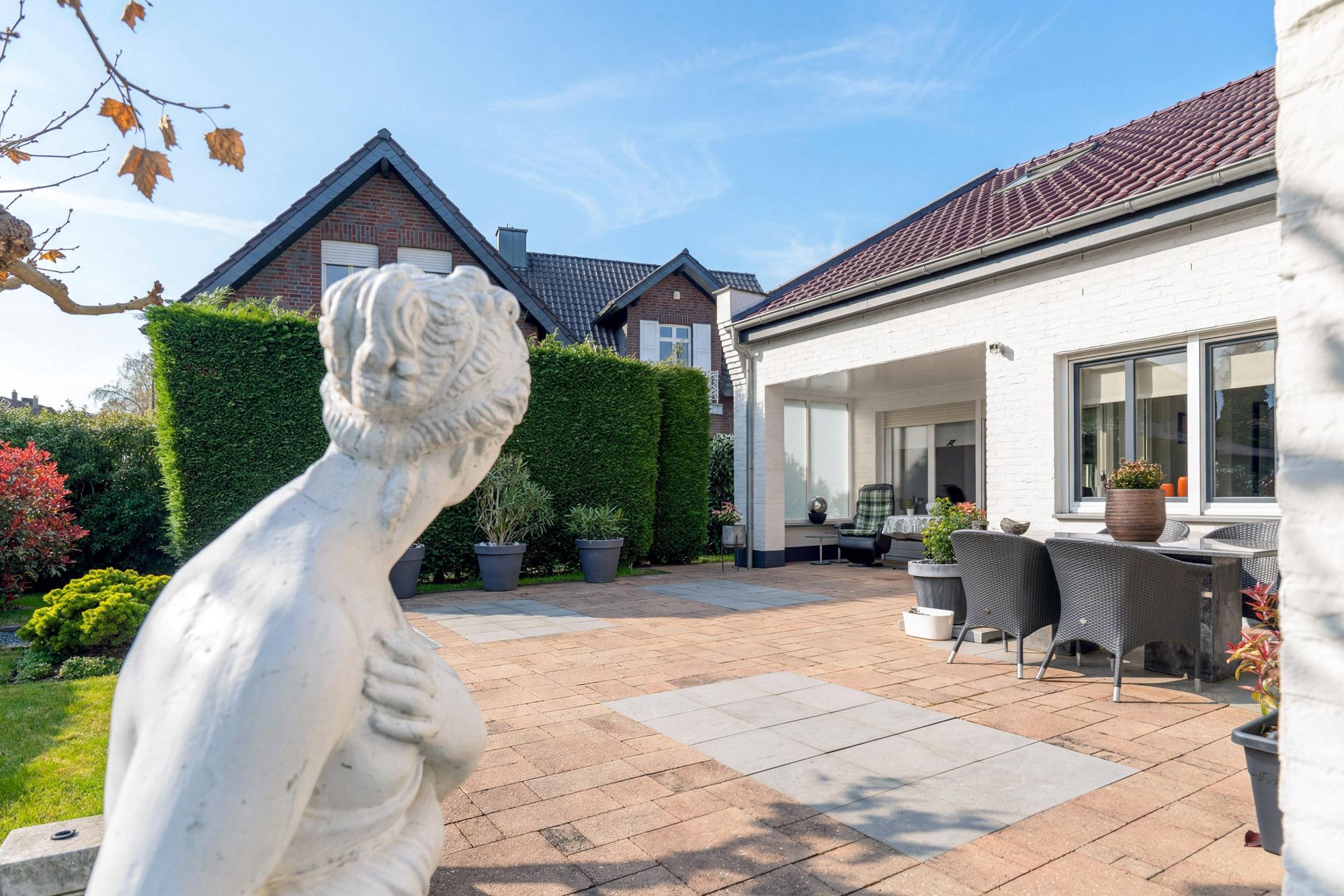 Via de schuifpui loopt u direct naar het overdekte terras, waar u in alle rust van de tuin kunt genieten.