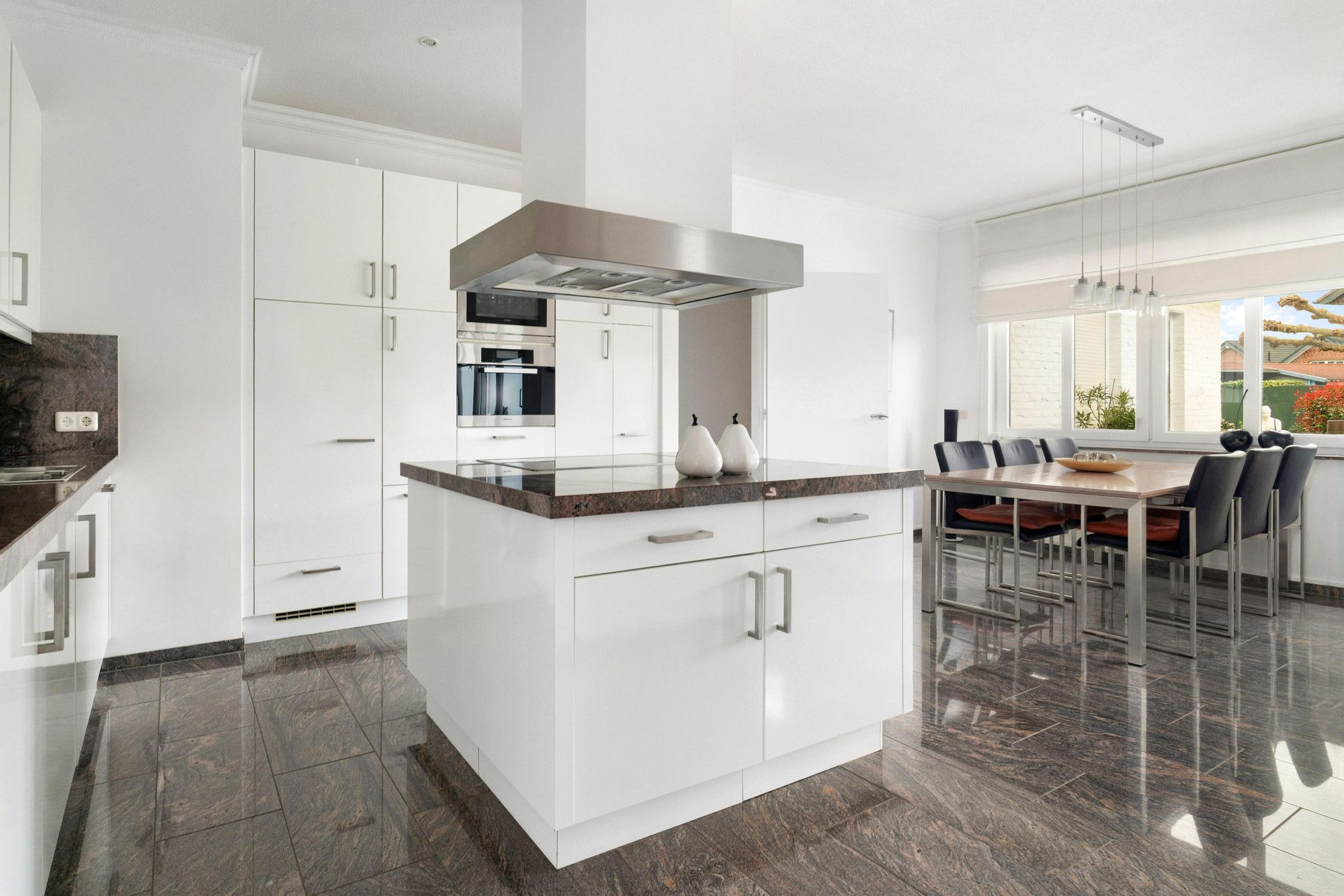 Royale keuken met keukeneiland en hoogwaardige inbouwapparatuur, waaronder koelkast, oven-magnetron, gasfornuis en afzuigkap, vaatwasser.
