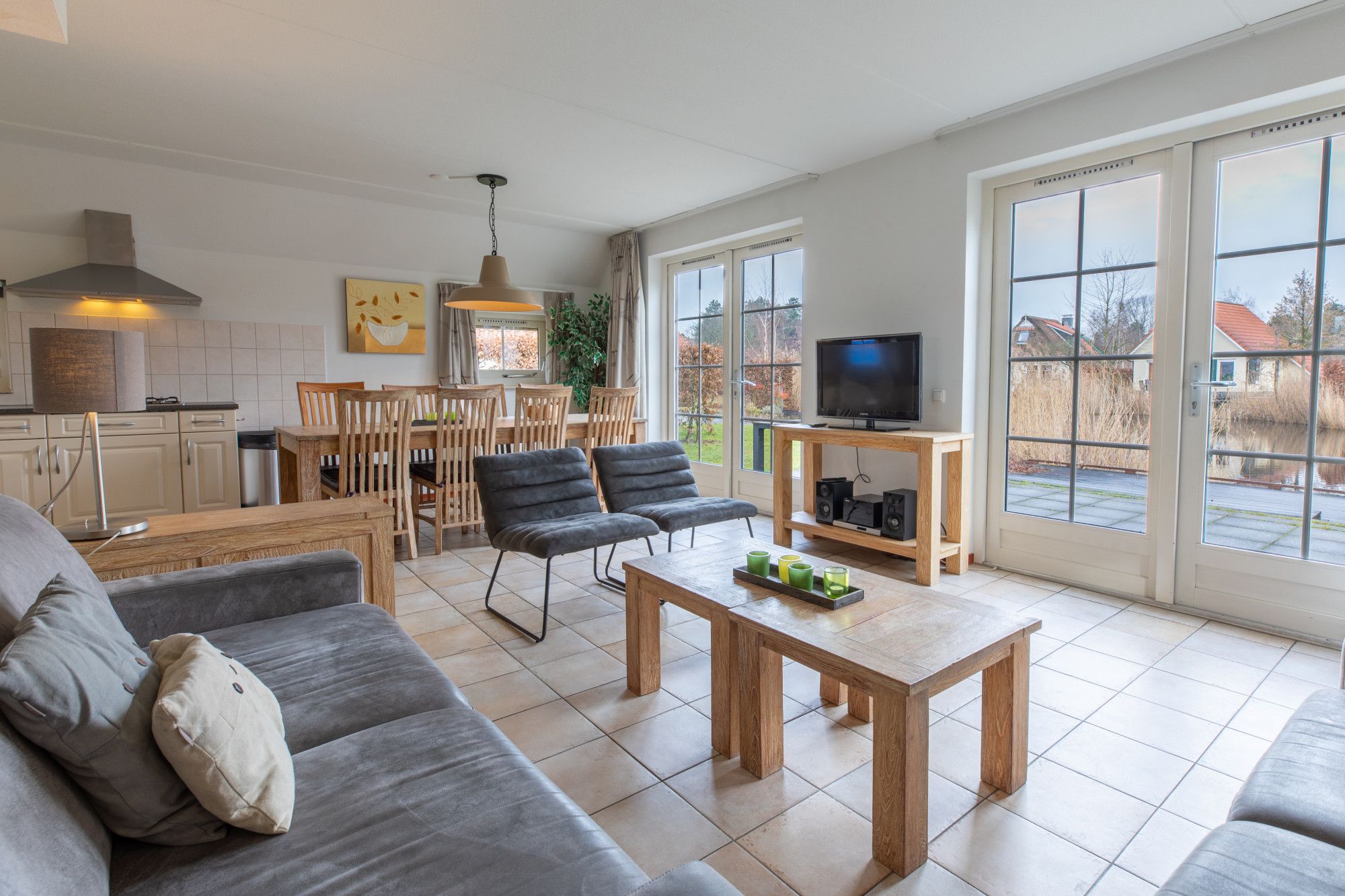 Begane grond: vanuit de hal is er de toegang tot een geheel betegeld separaat toilet met fonteintje , woonkamer met open keuken. De woonkamer is voorzien van 2 openslaande deuren die toegang geven tot een royaal terras met uitzicht over het water. De keuken is voorzien van een vaatwasser, grote koelkast, combimagnetron, afzuigkap en 5 pits kookplaat met wok brander. Vanuit de woonkamer via een klein portaal heeft u toegang tot twee 2 persoonsslaapkamers en badkamer met wastafel en douche.