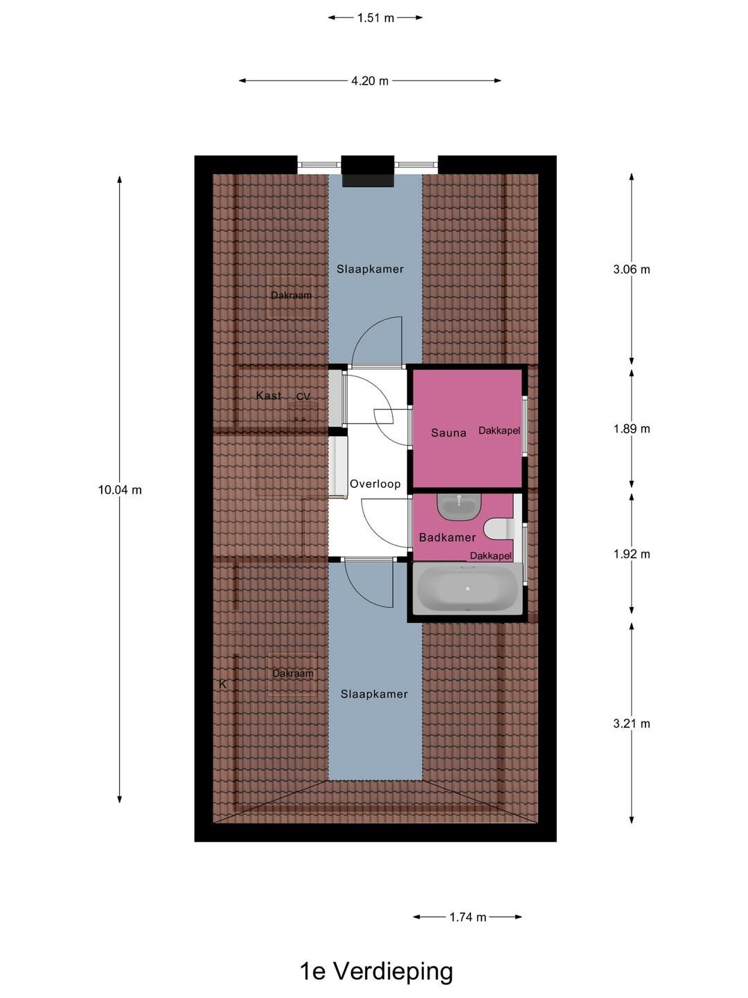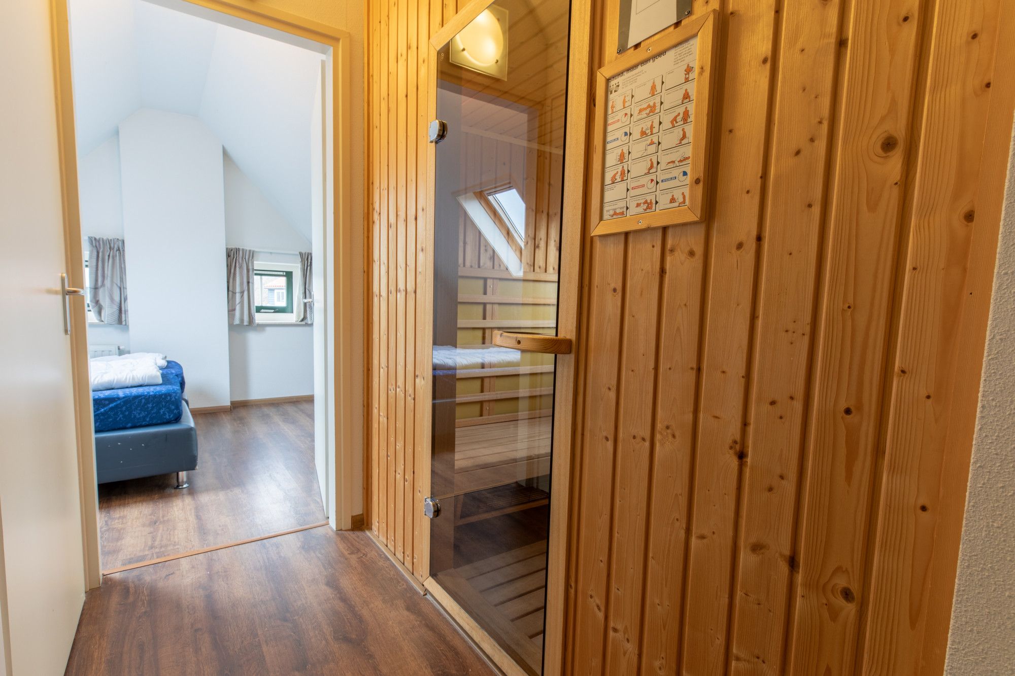 1e verdieping: vanuit de overloop zijn de 2 tweepersoons slaapkamers te bereiken. De badkamer is voorzien van een ligbad, wastafel en 2e toilet. Er is tevens een infrarood sauna aanwezig.