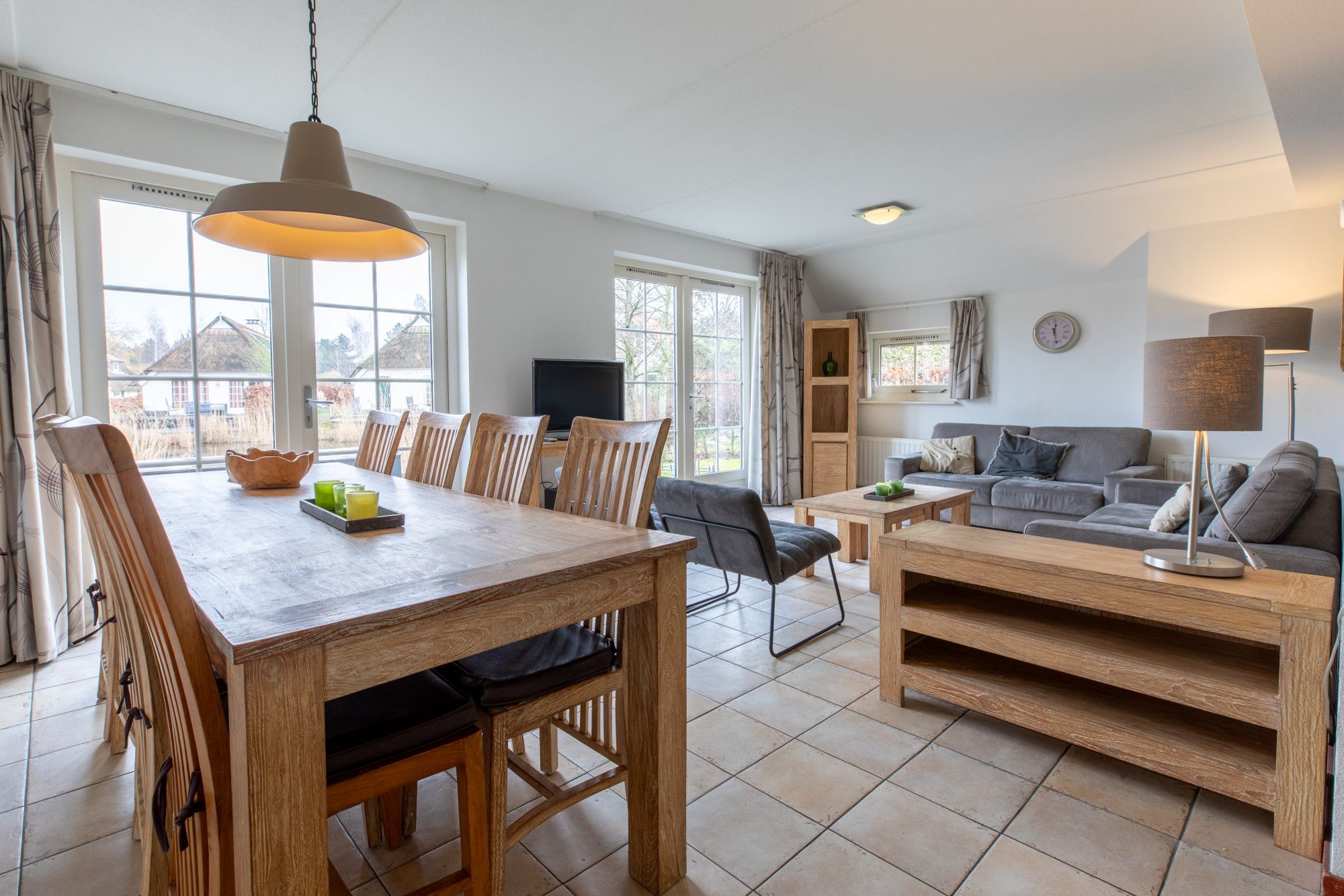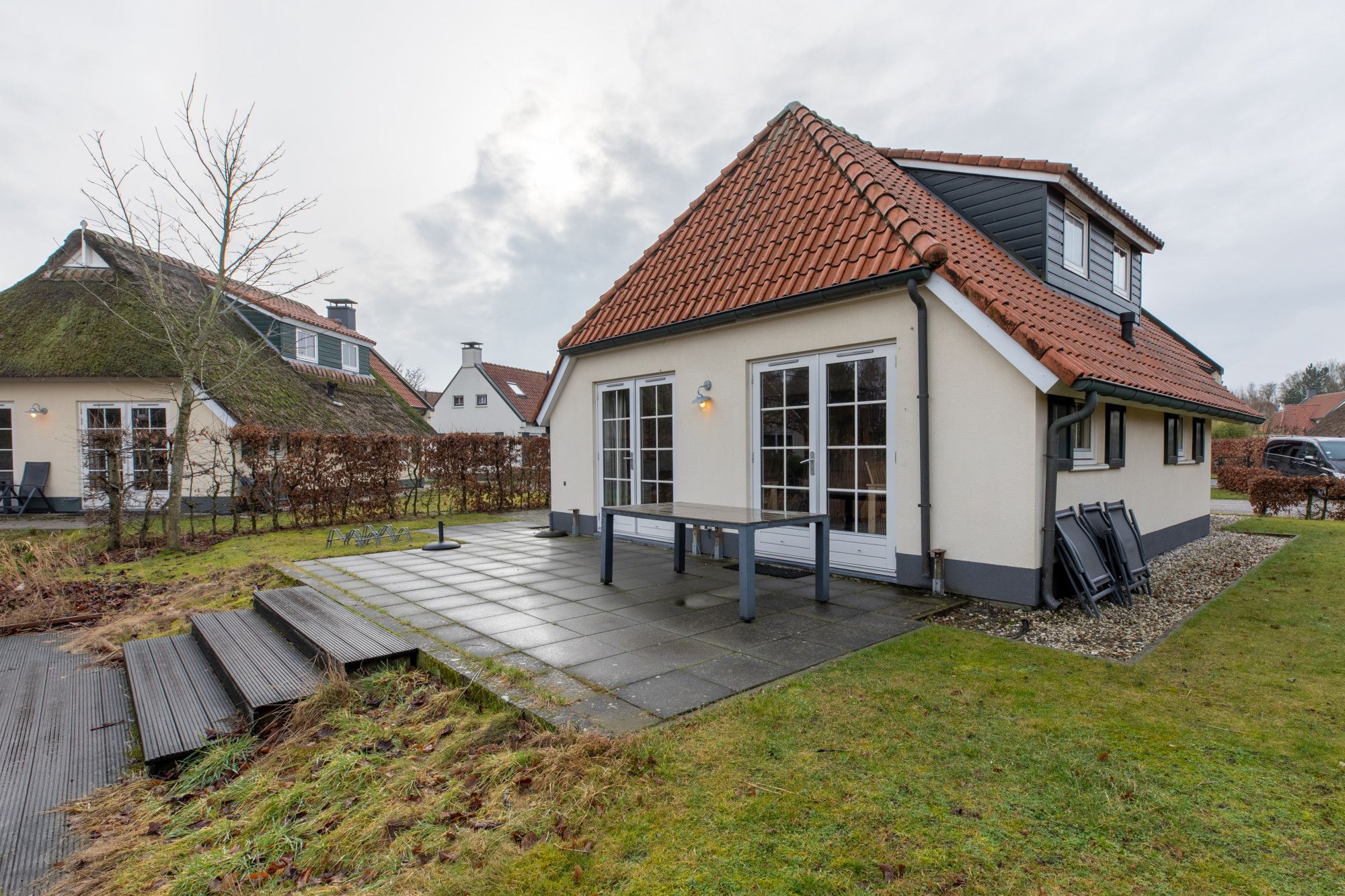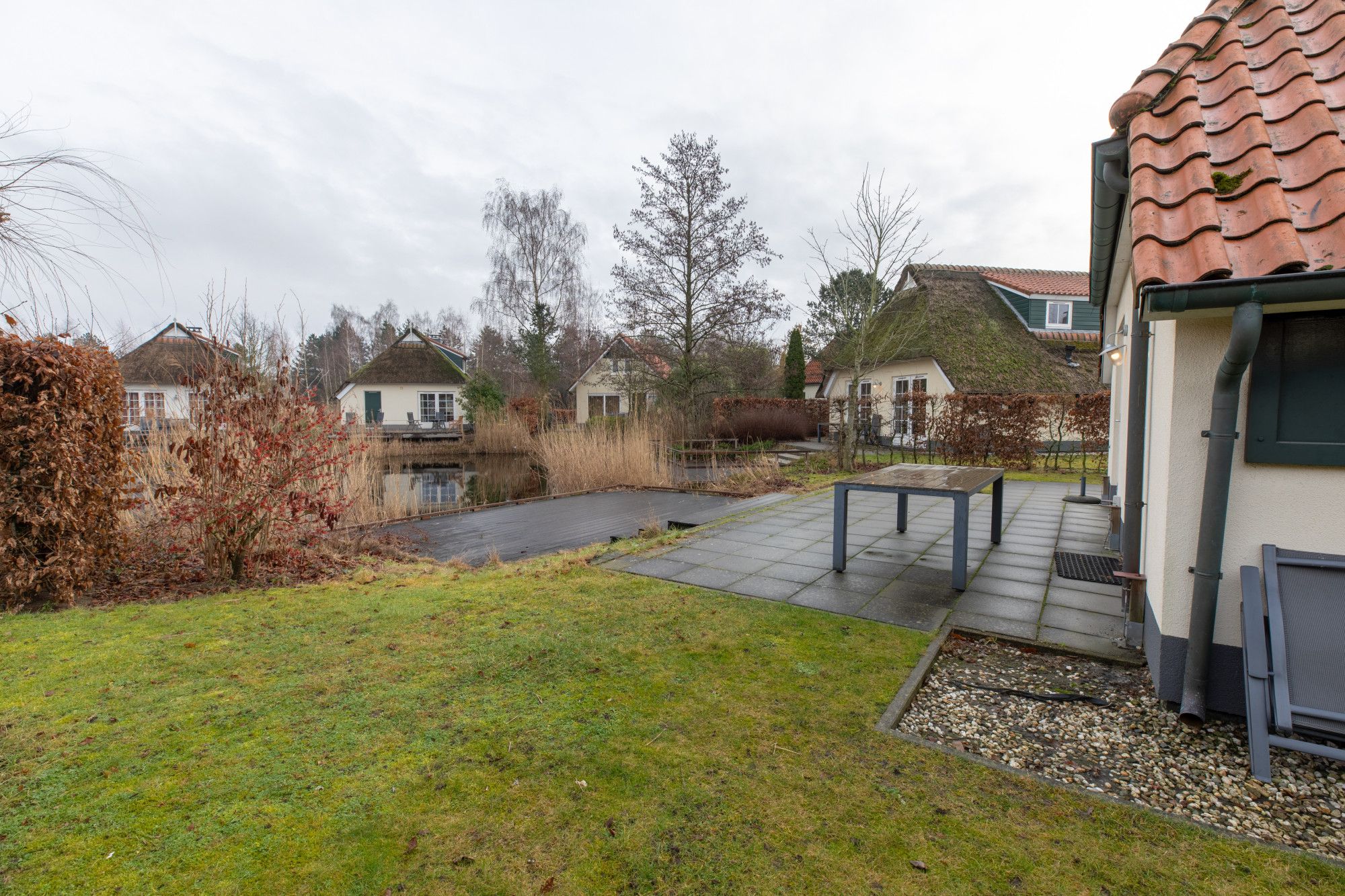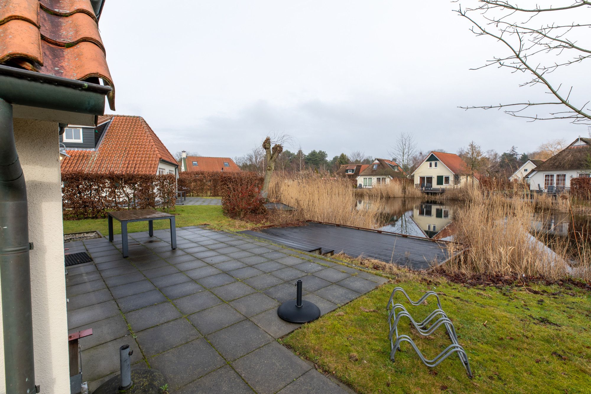 - Royale achtertuin met terras, grasveld en steiger aan het water, ook te gebruiken als zonneterras;